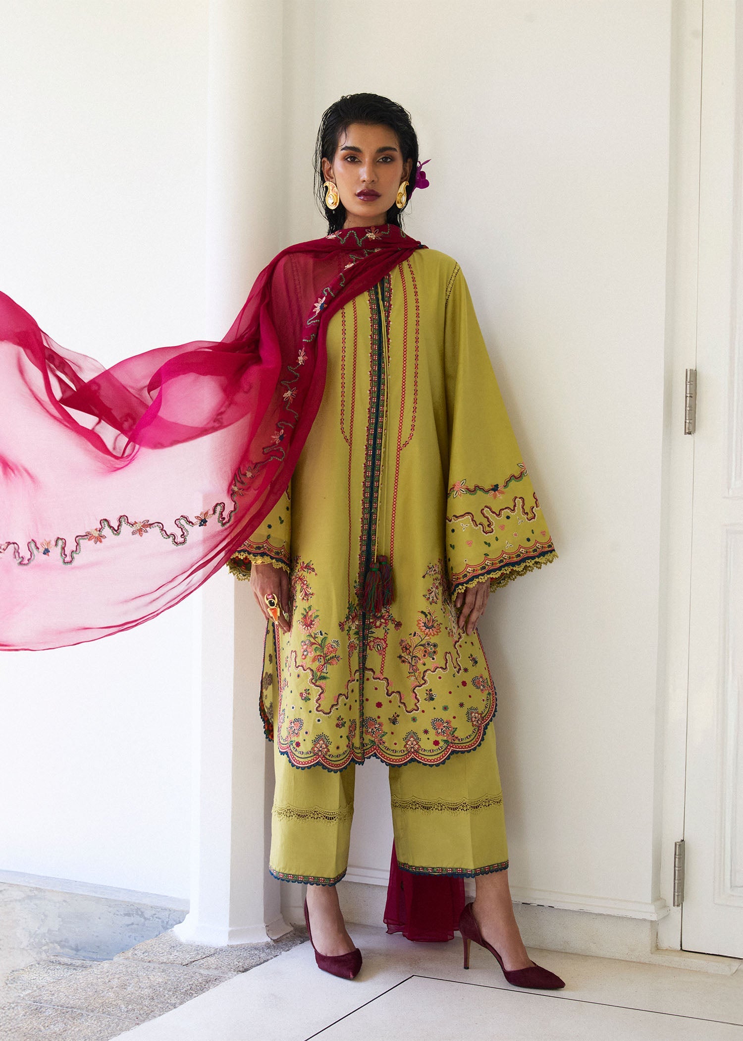 Fresh and feminine, this apple green lawn outfit is a summer essential. Featuring intricate embroidery with cutwork on the hem and sleeves, it’s paired with lace-detailed culottes for a soft, elegant look. The hot pink chiffon dupatta, finished with sleek embroidered edges, adds a vibrant pop of color and flowy grace. Light, breathable, and effortlessly stylish.