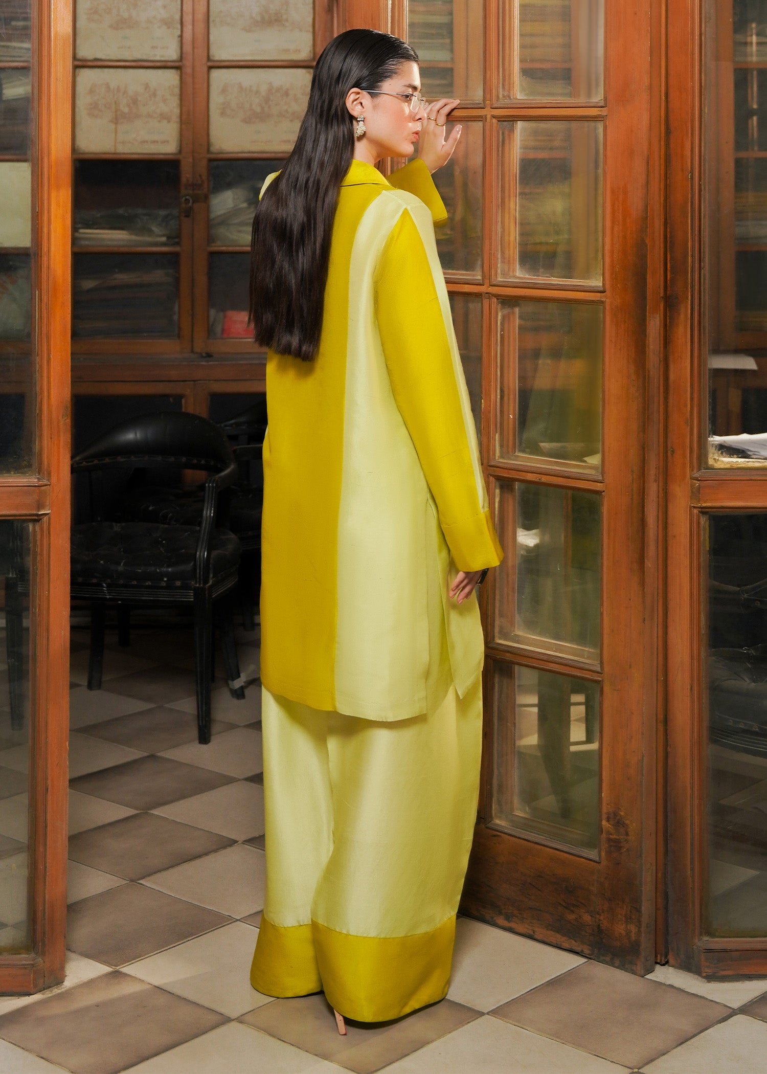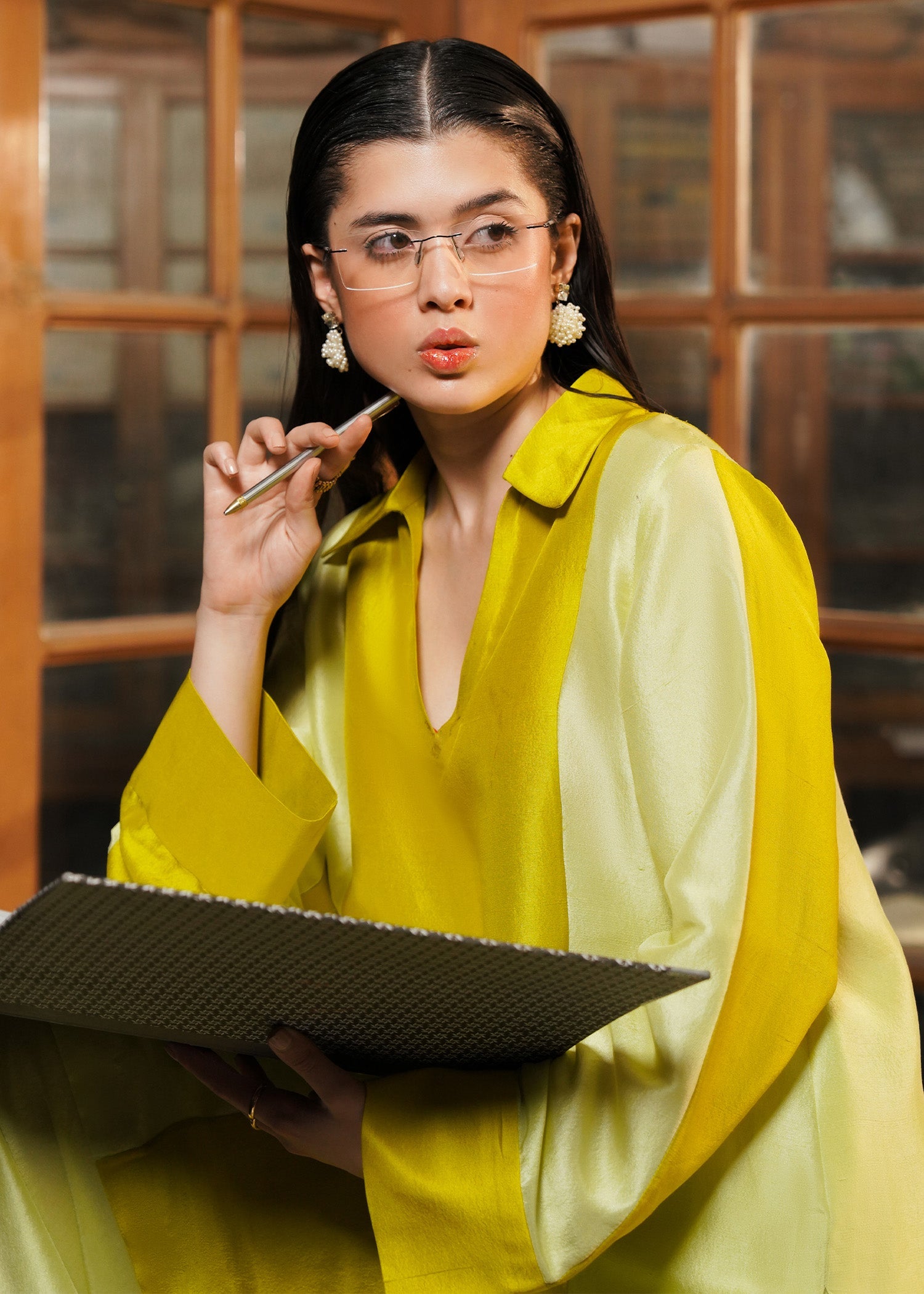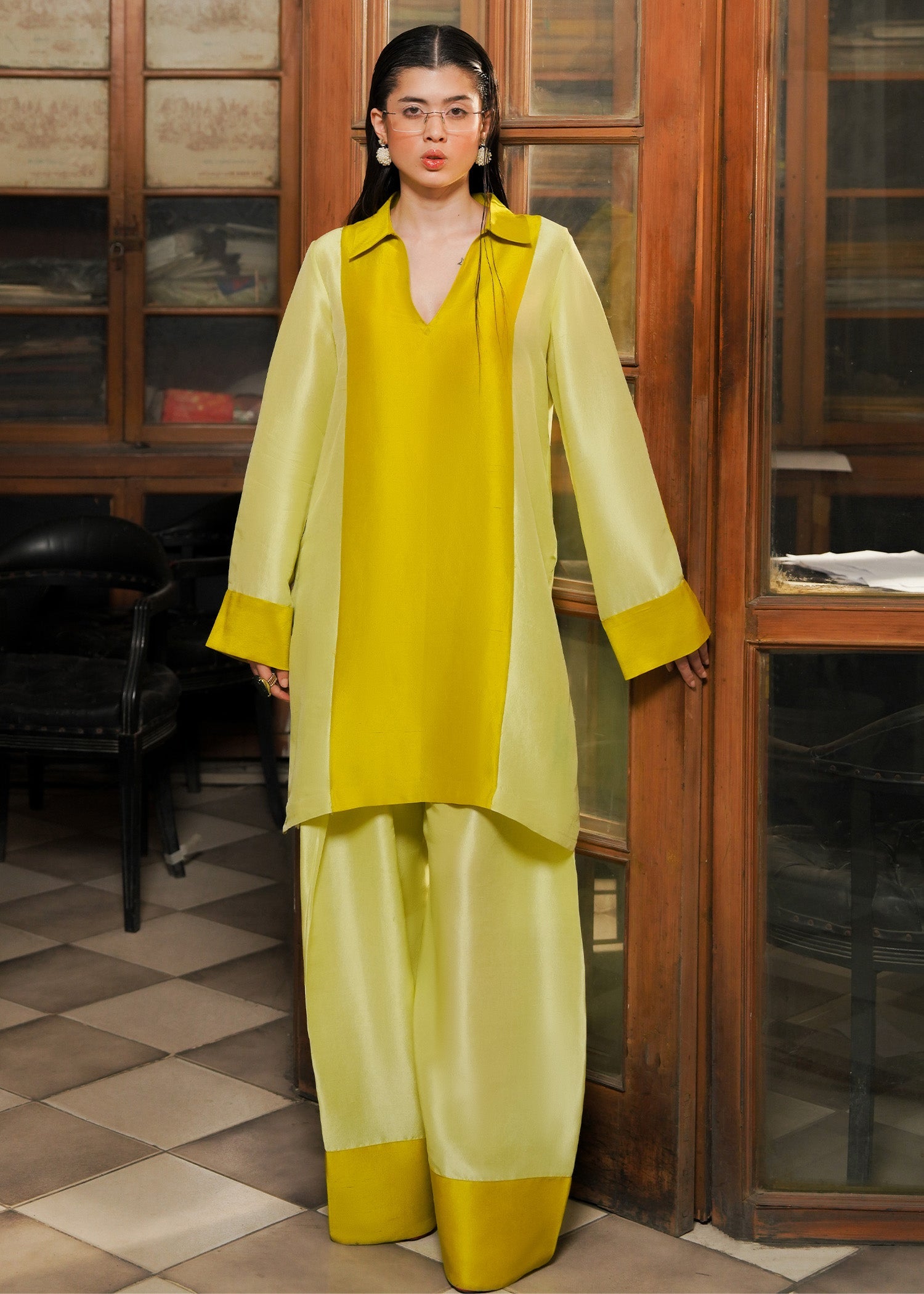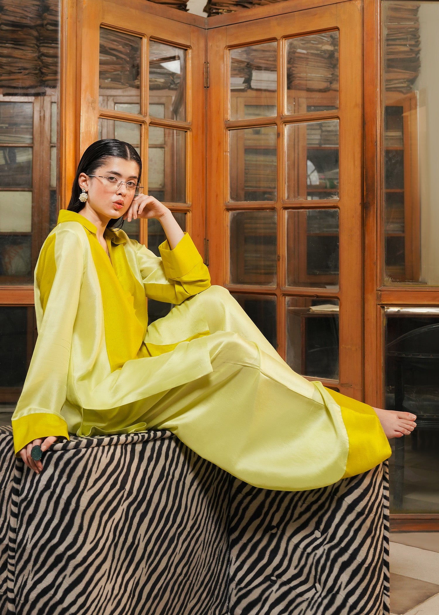 An outstanding raw silk shirt with lime yellow panel in the mid front and dark lime yellow on the sides along with sleeves with both colors. The shirt also has side slits and collar. The shirt is paired with a lime yellow shalwar and darker patch at the hem.
