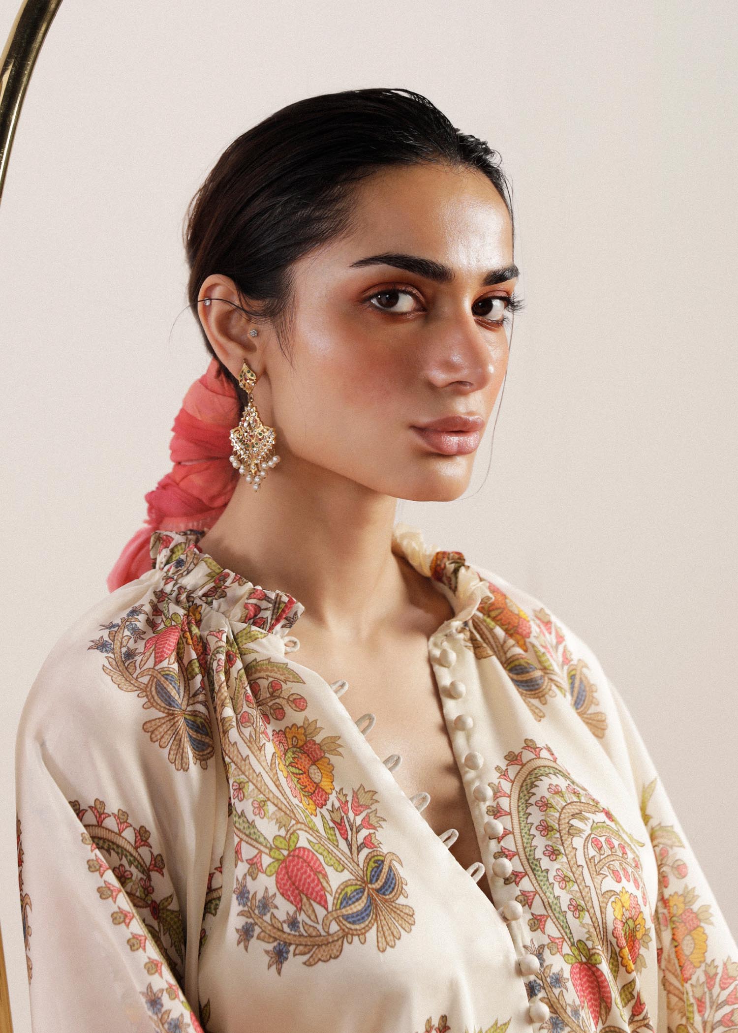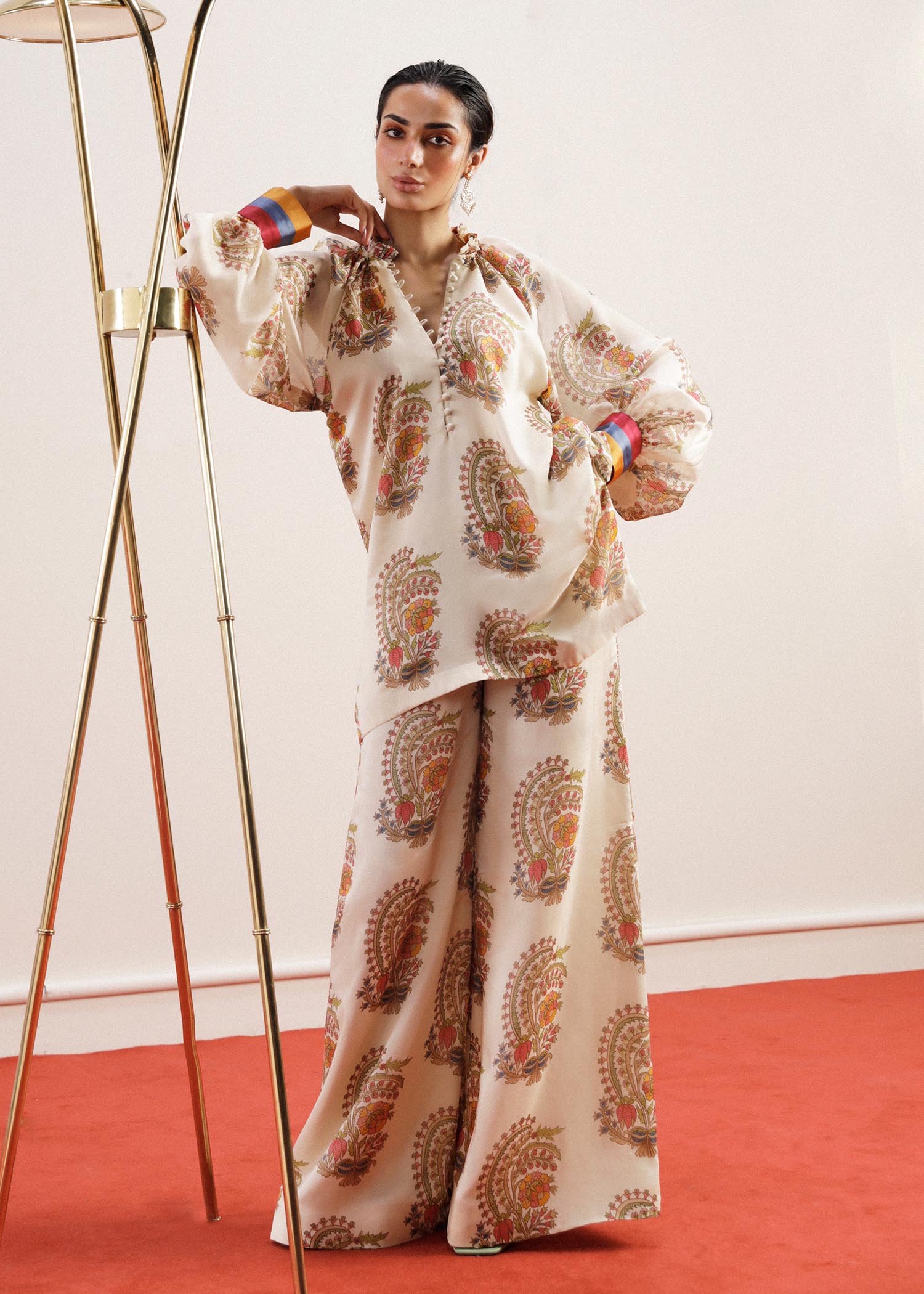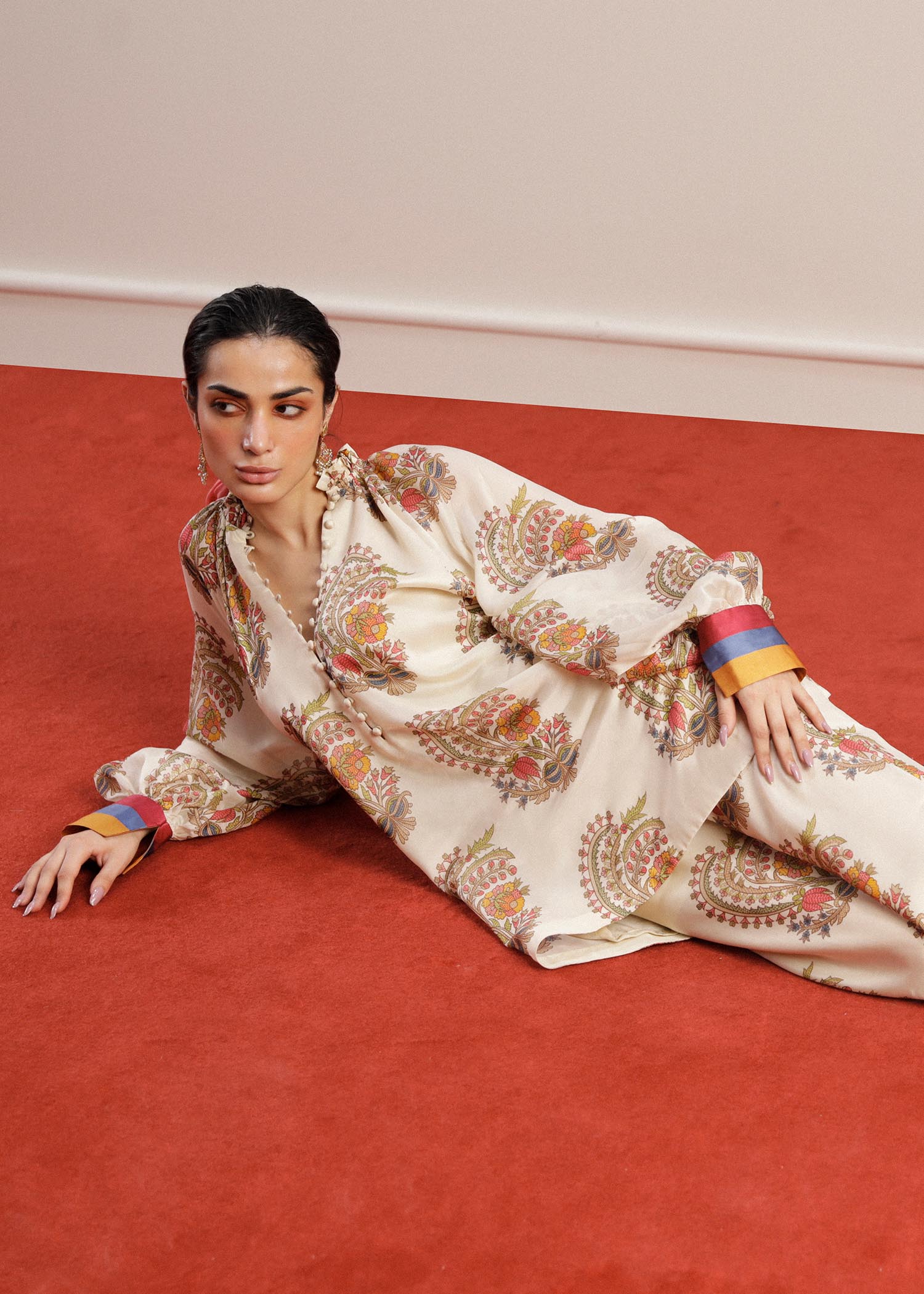 A gorgeous ivory matching separates set that has ravelled floral print spread all over the silk silhouette. The neckline has loop buttons descending to the mid of the shirt. Its sleeves have satin silk yellow, blue and red stripes on the cuffs.