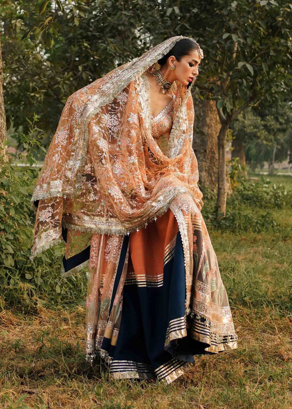 A gorgeous coral peach ensemble adds to the opulence of this attire with beautiful intricate multicolored embroideries enhanced with buggle beads and sequins. A pulchritudinous composition is further modernized with color block Korean Raw Silk lehenga and Beautifully composed Peach Net Dupatta .