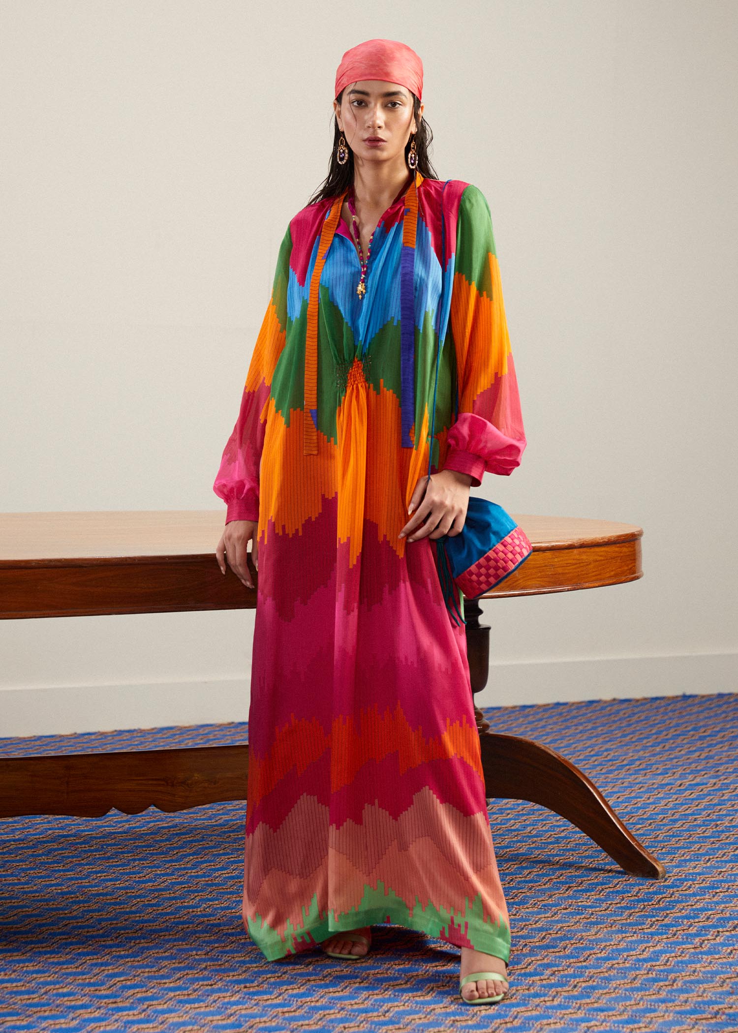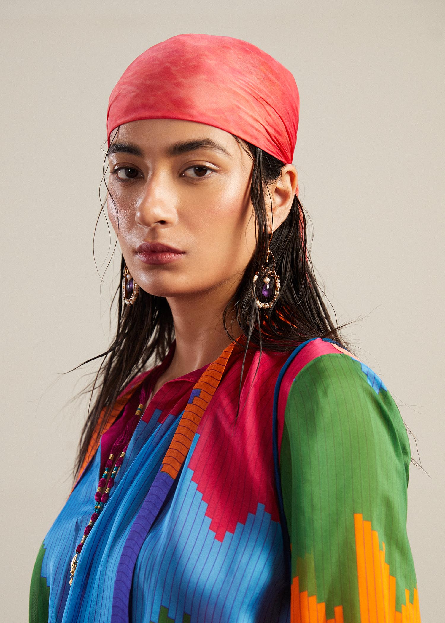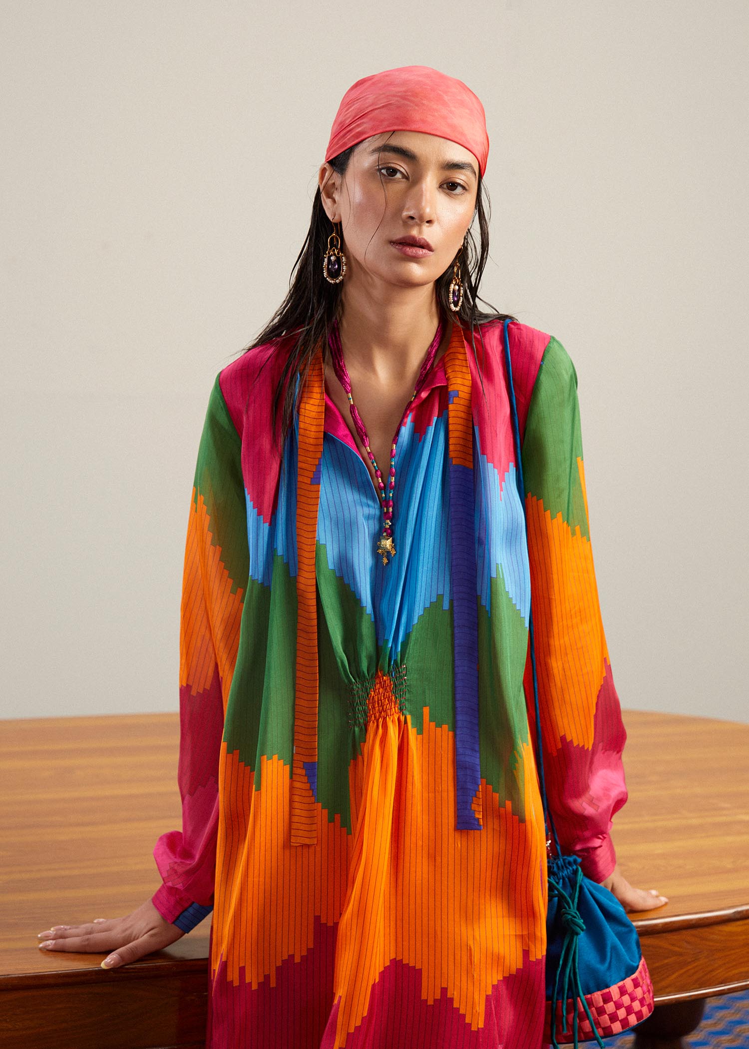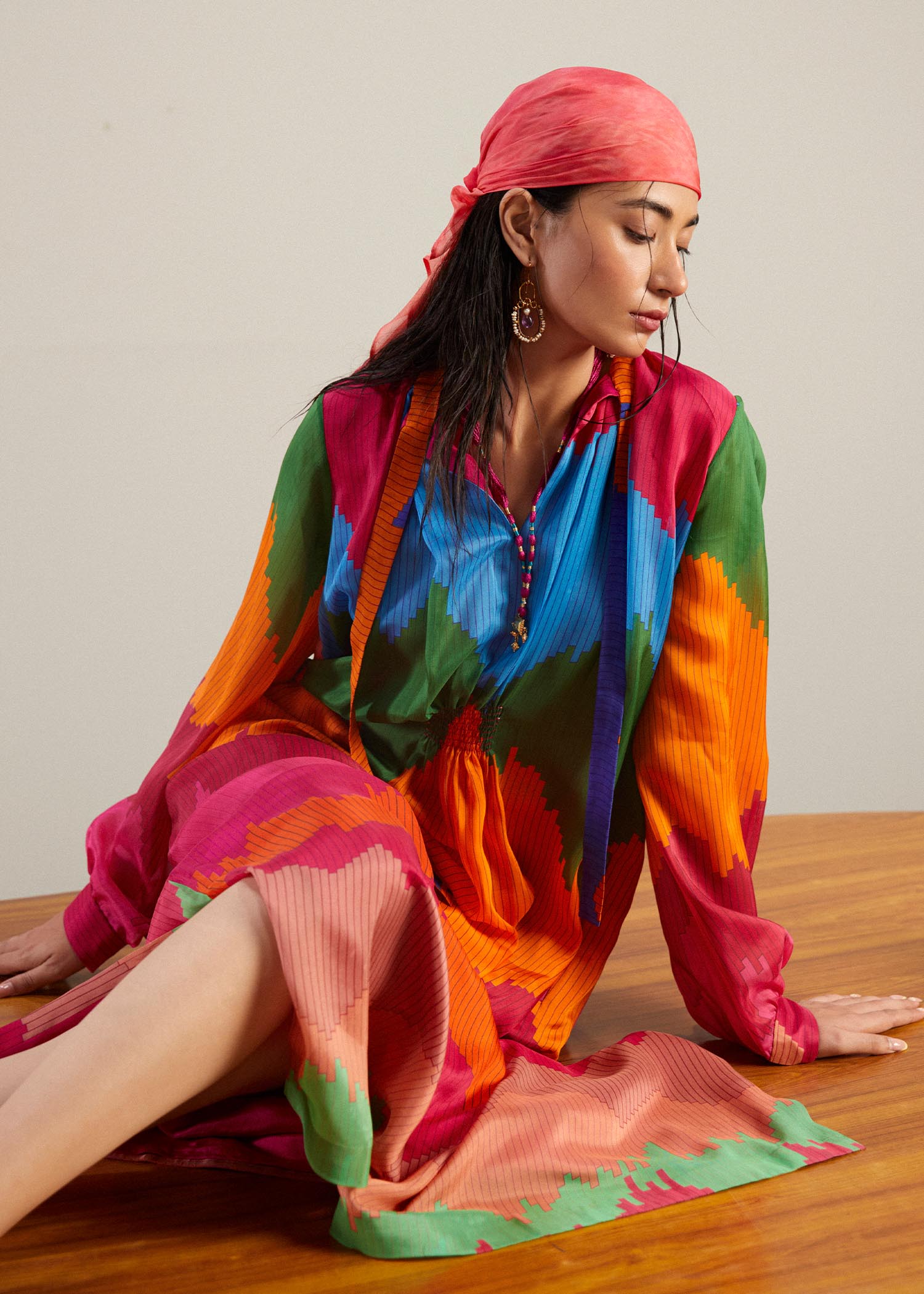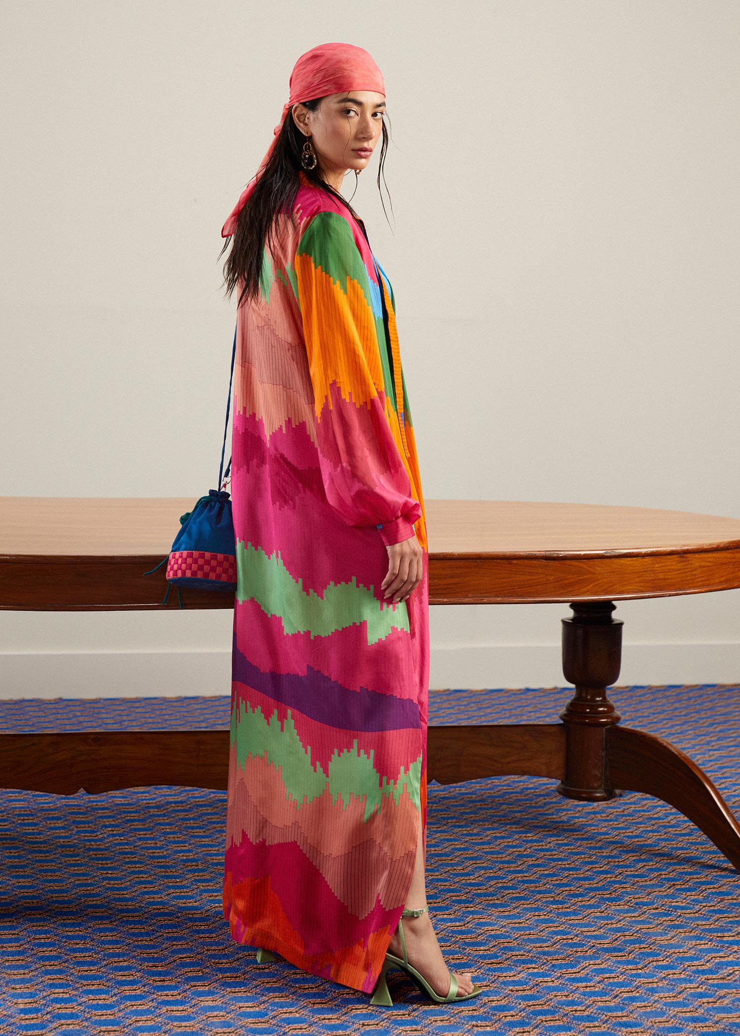 An exceptional multi-coloured full length silk shirt with long sleeves and cuffs and side slits. Make a style statement in this colourful ensemble this summer