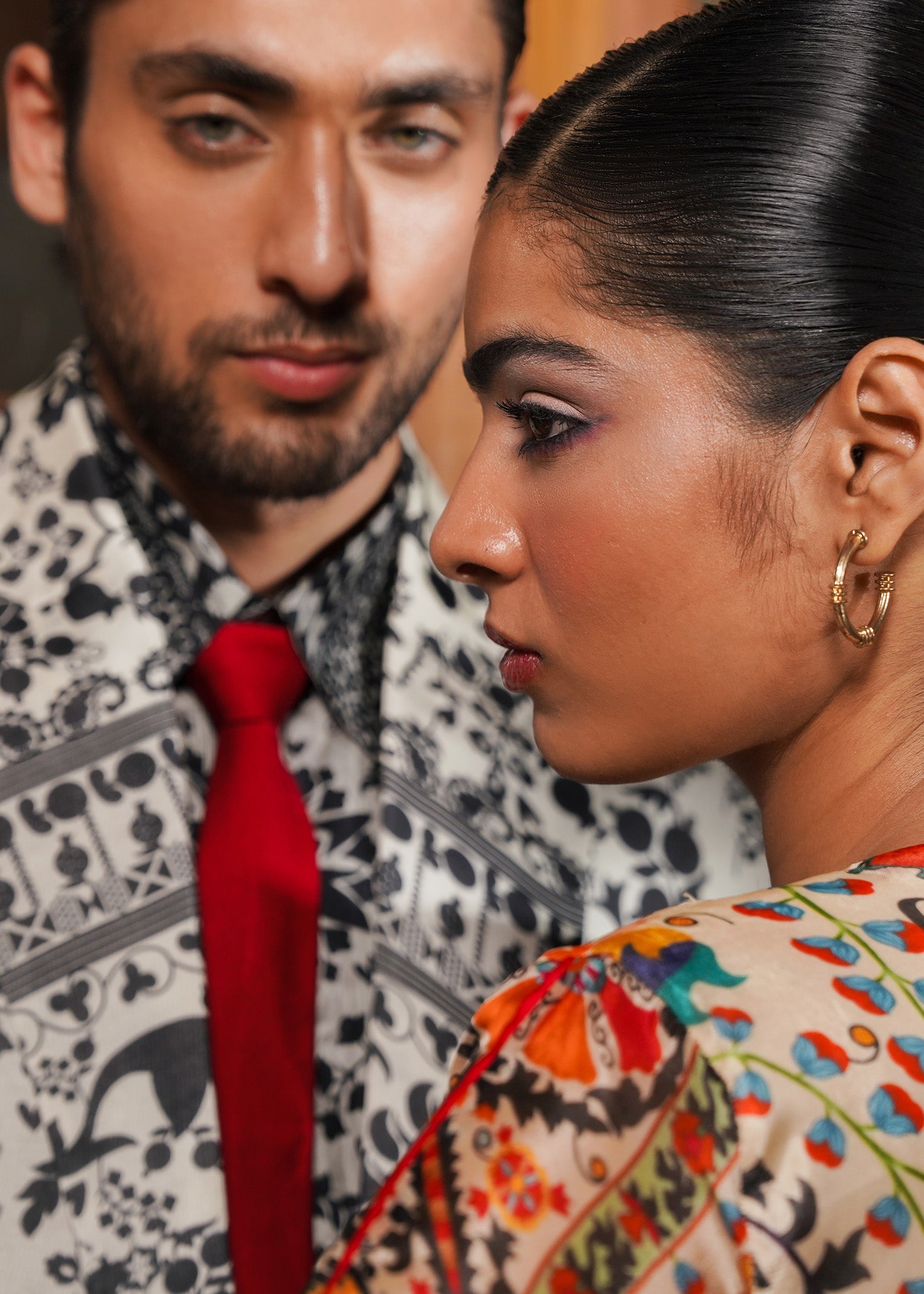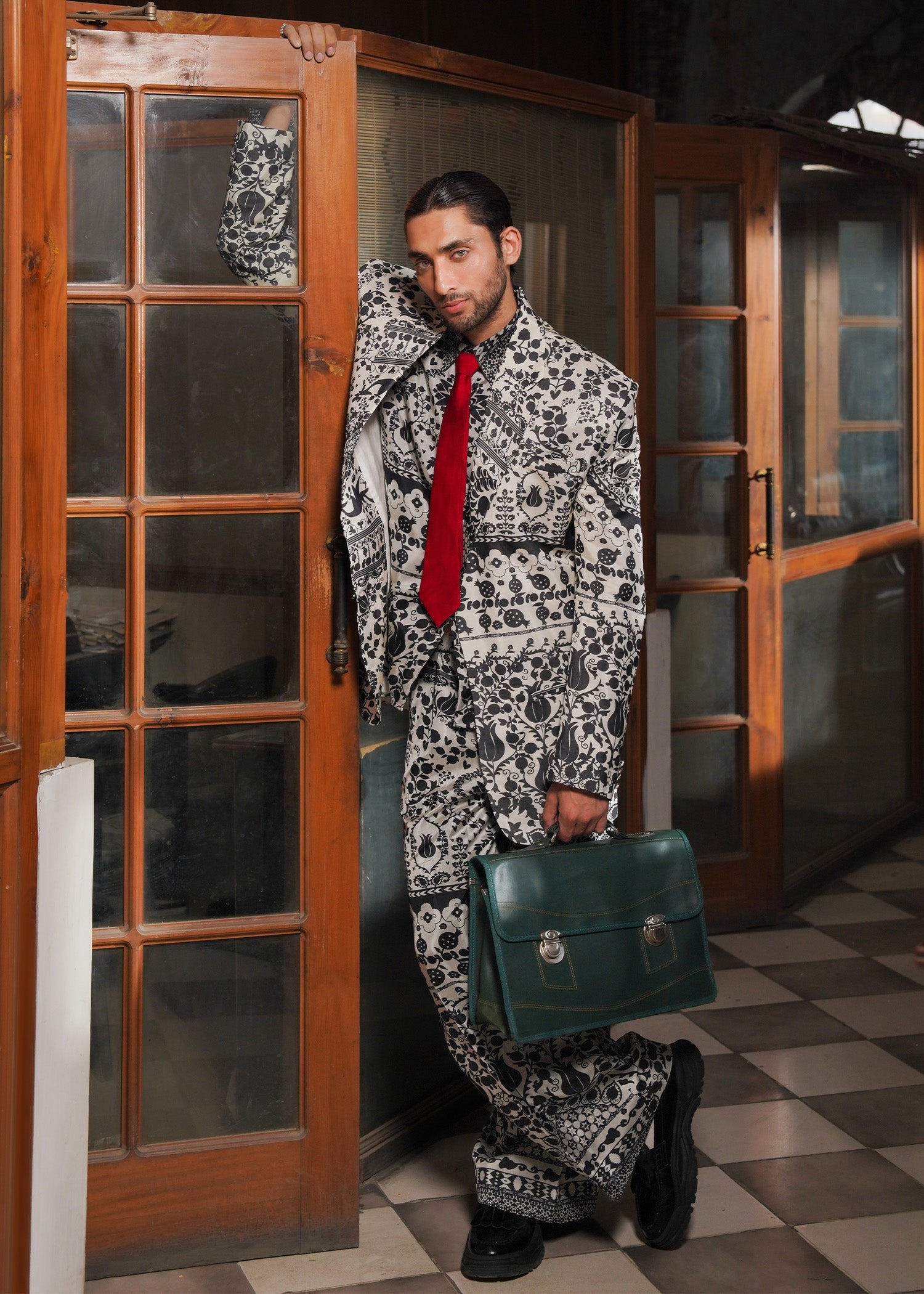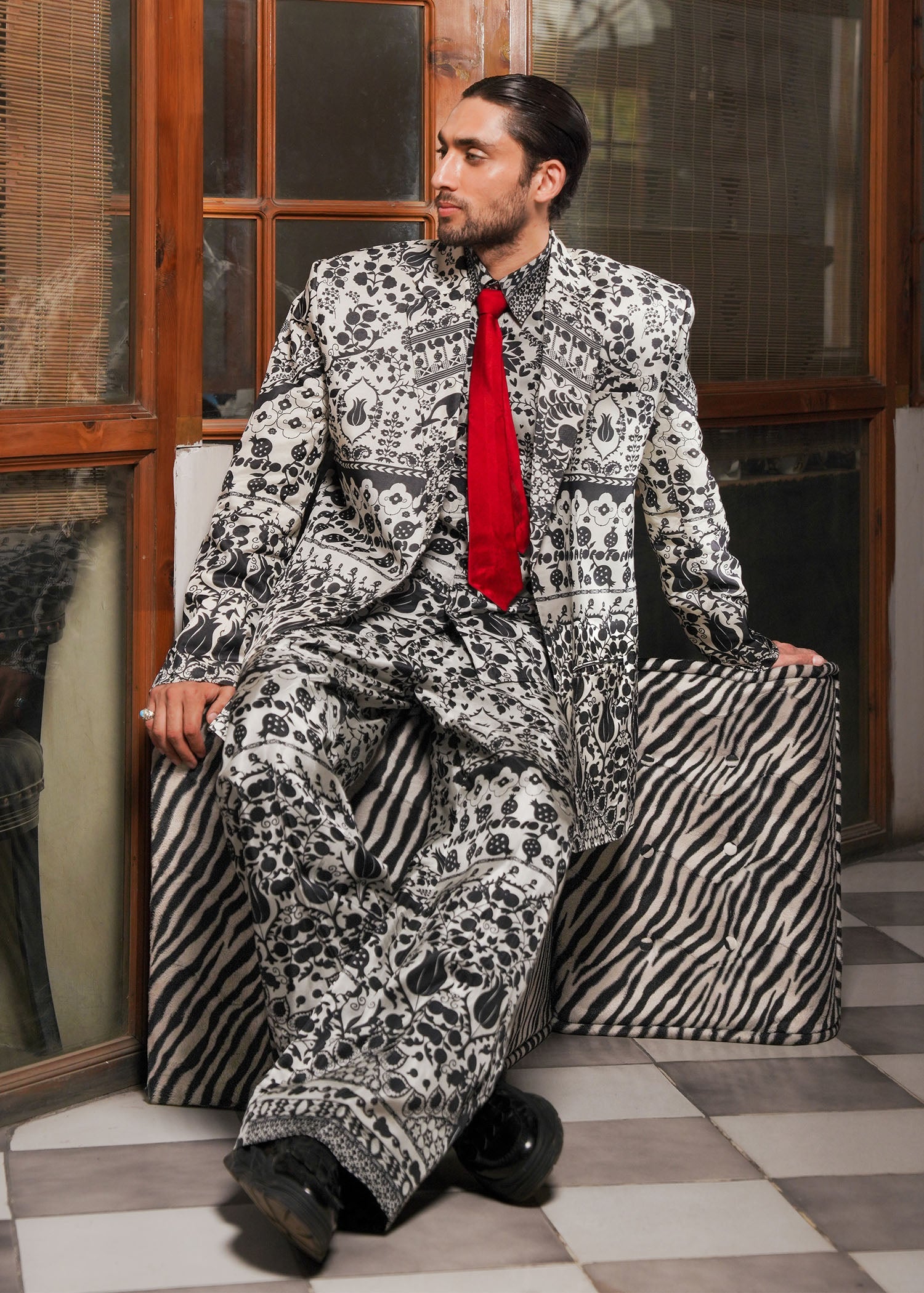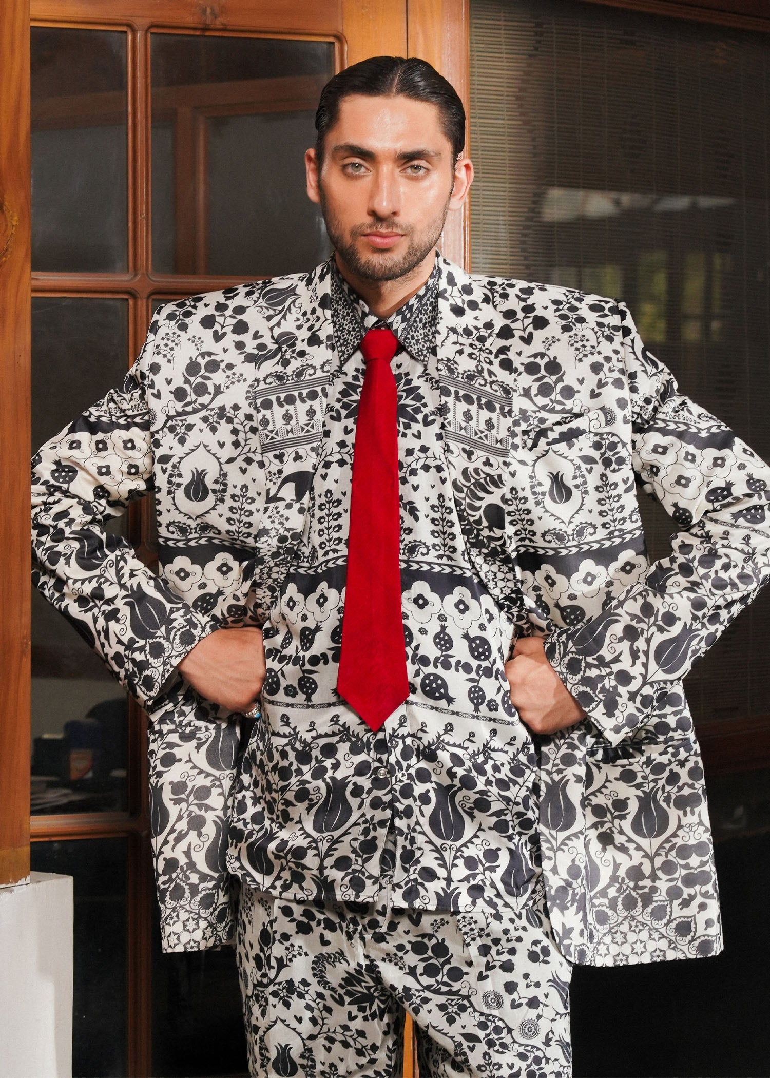 A black and white matching separate set, including a black and white printed button down shirt with collar and a similarly printed trouser to pair it with.