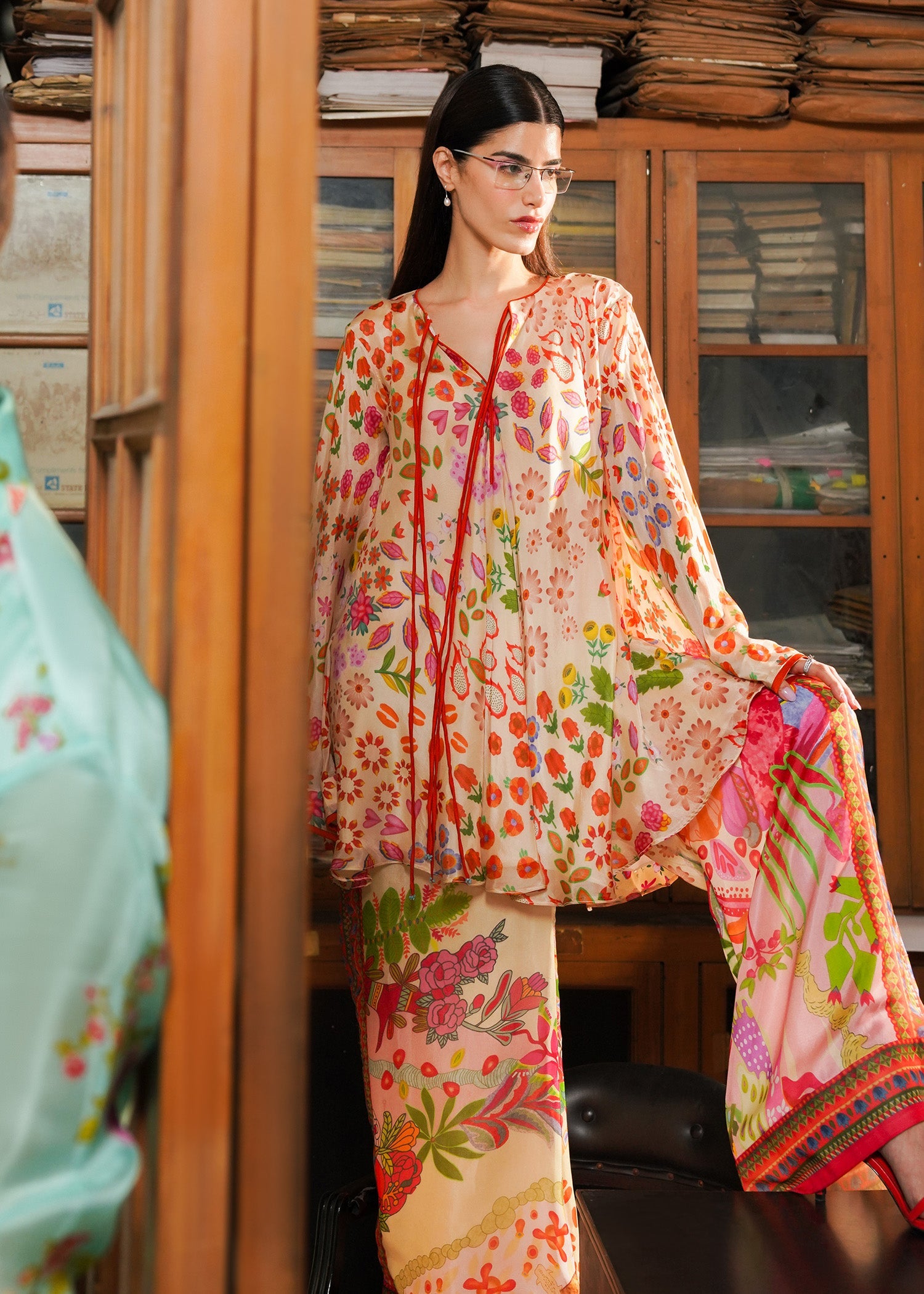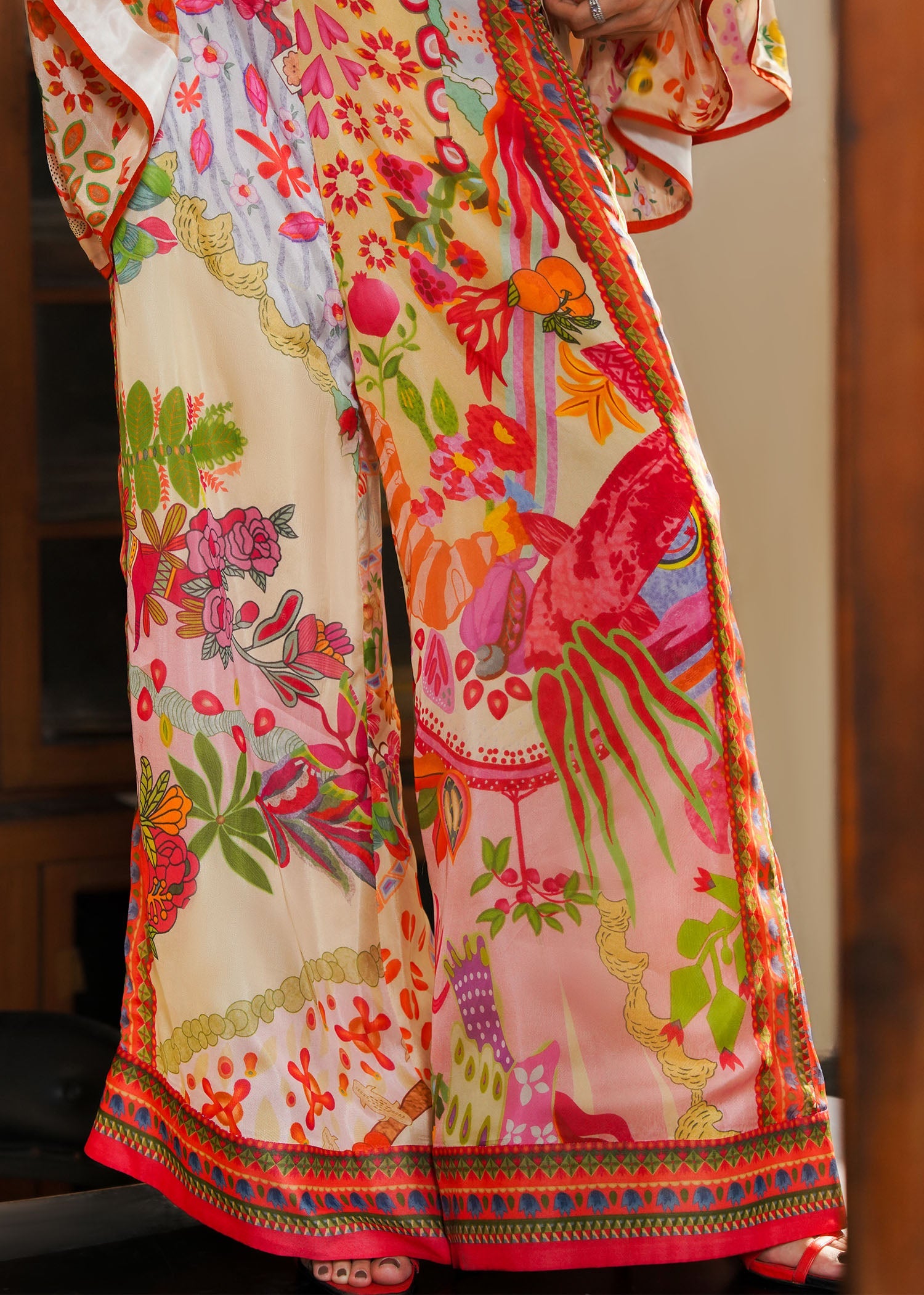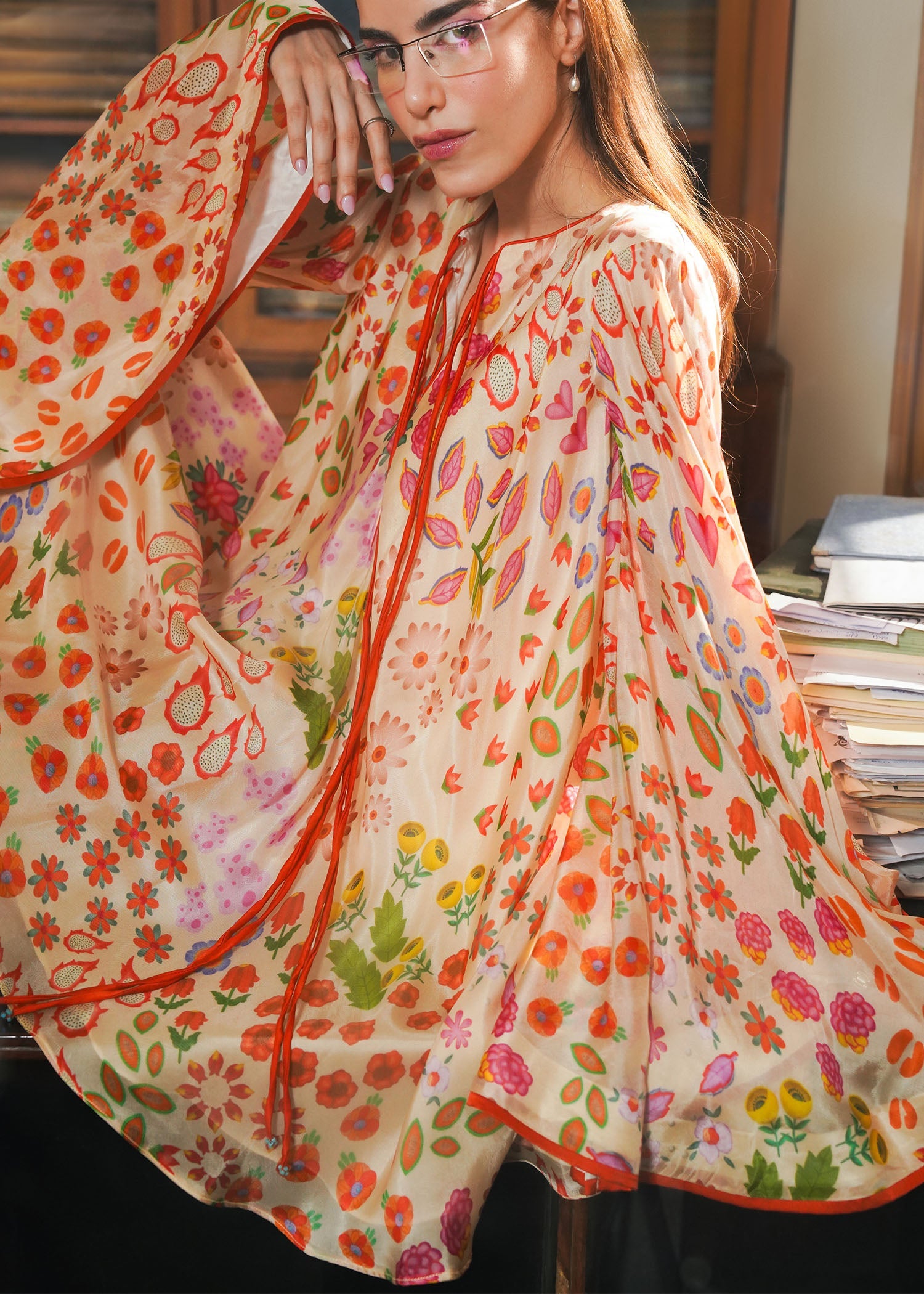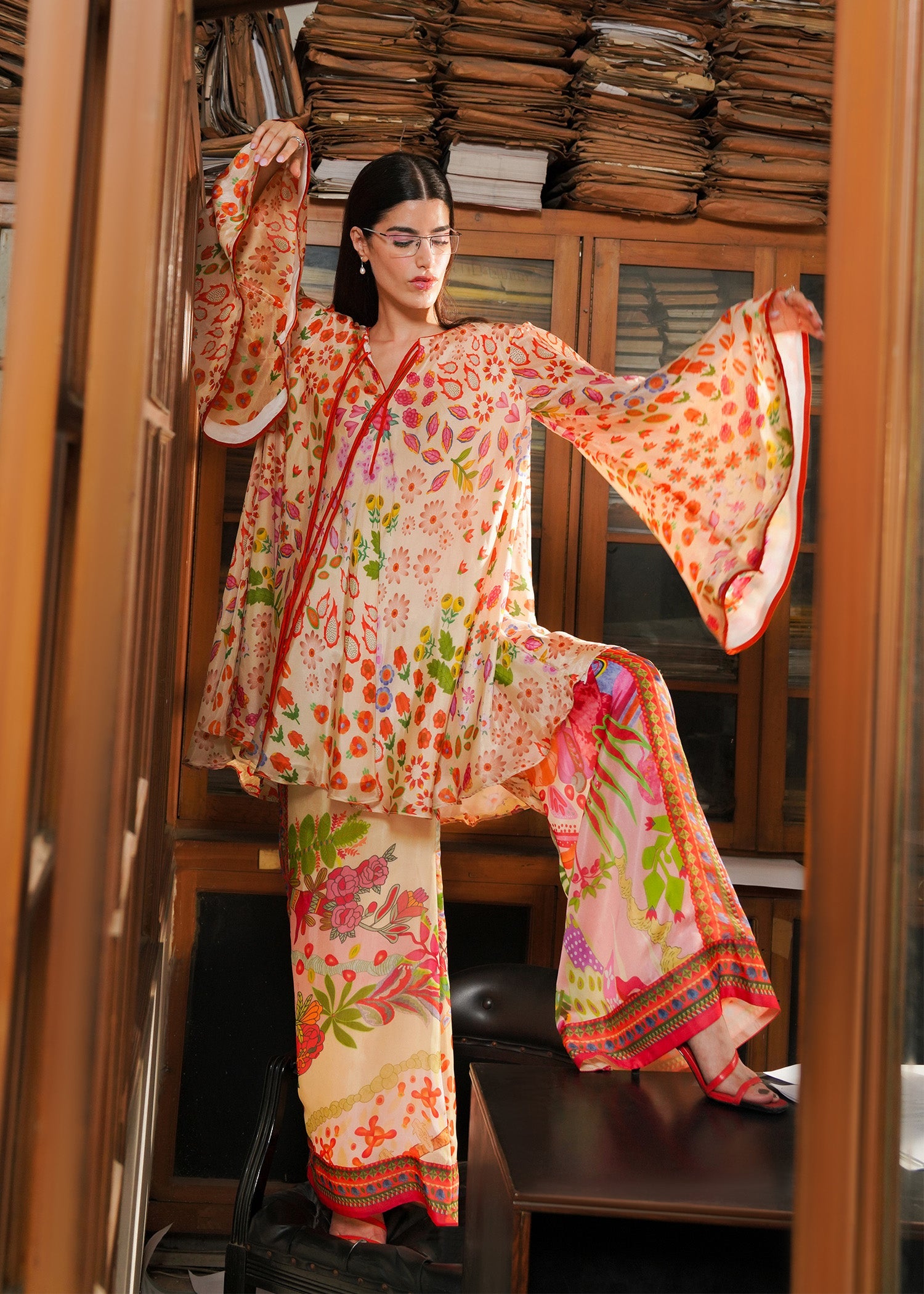 A regal matching separate printed outfit in beautiful silk fabric. The multicoloured print brings out a unique look.