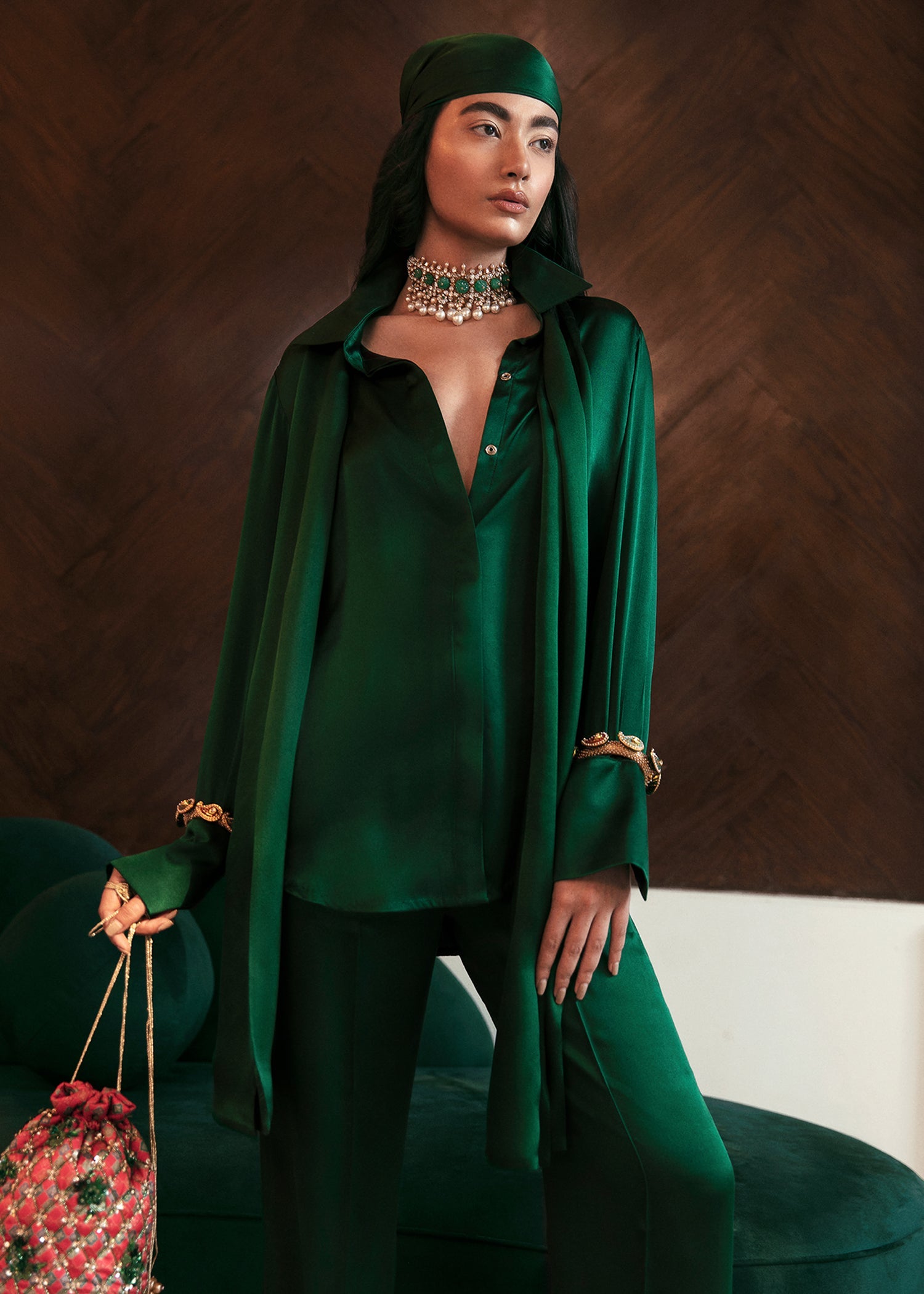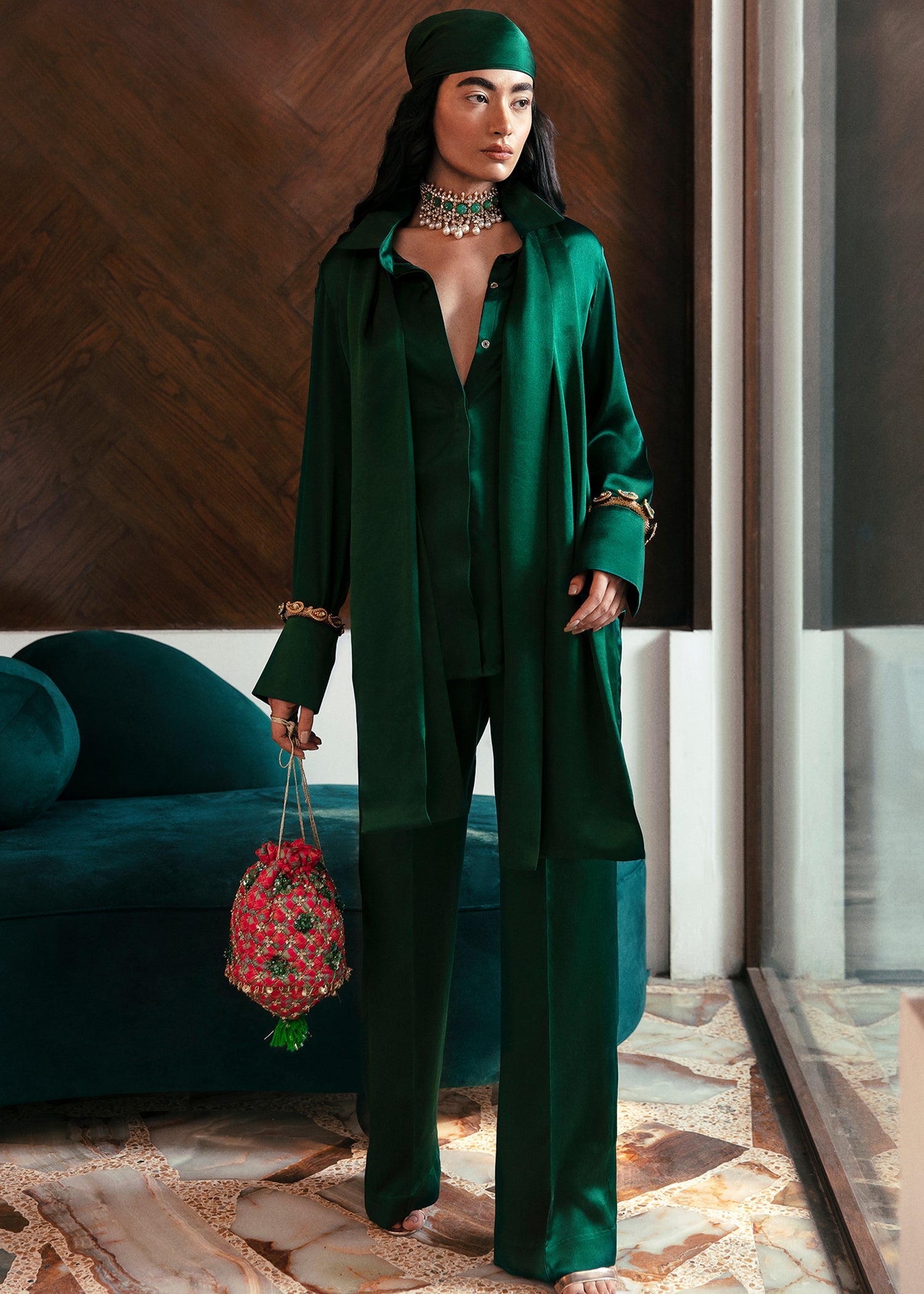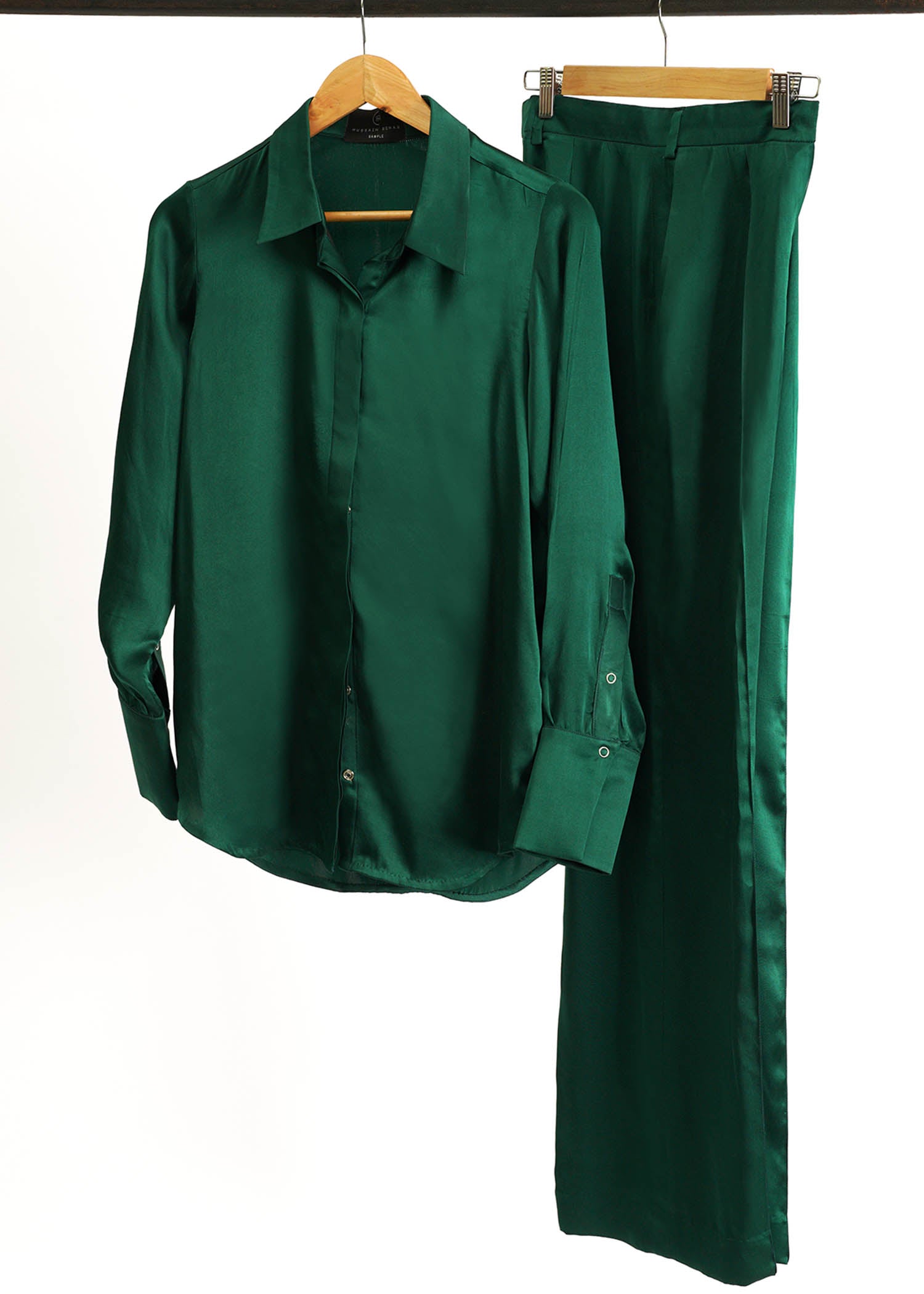This emerald green satin set consists button down shirt and high-rise palazzo pants.