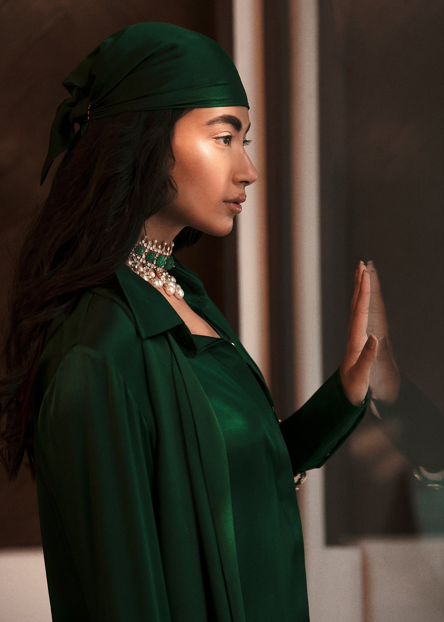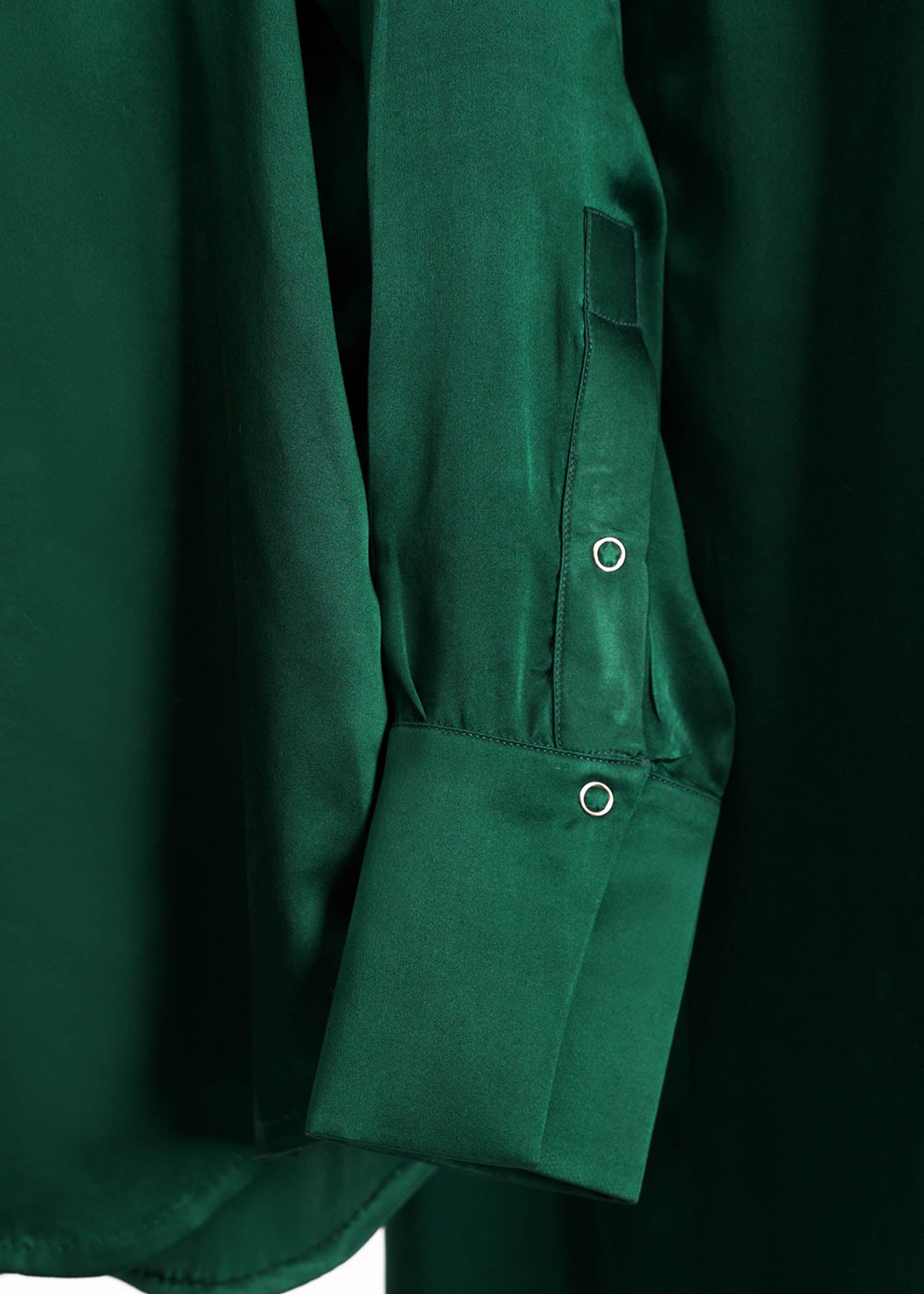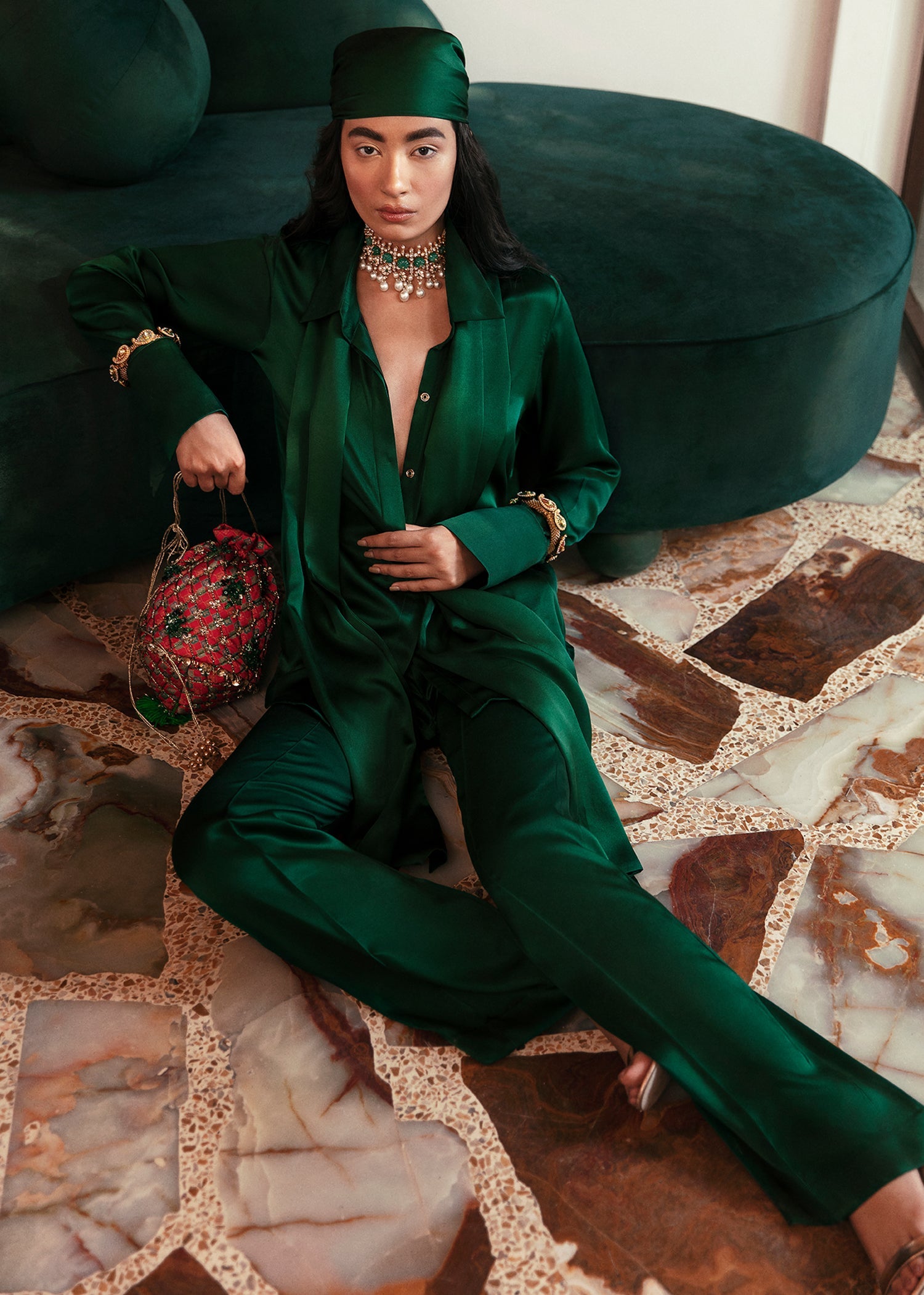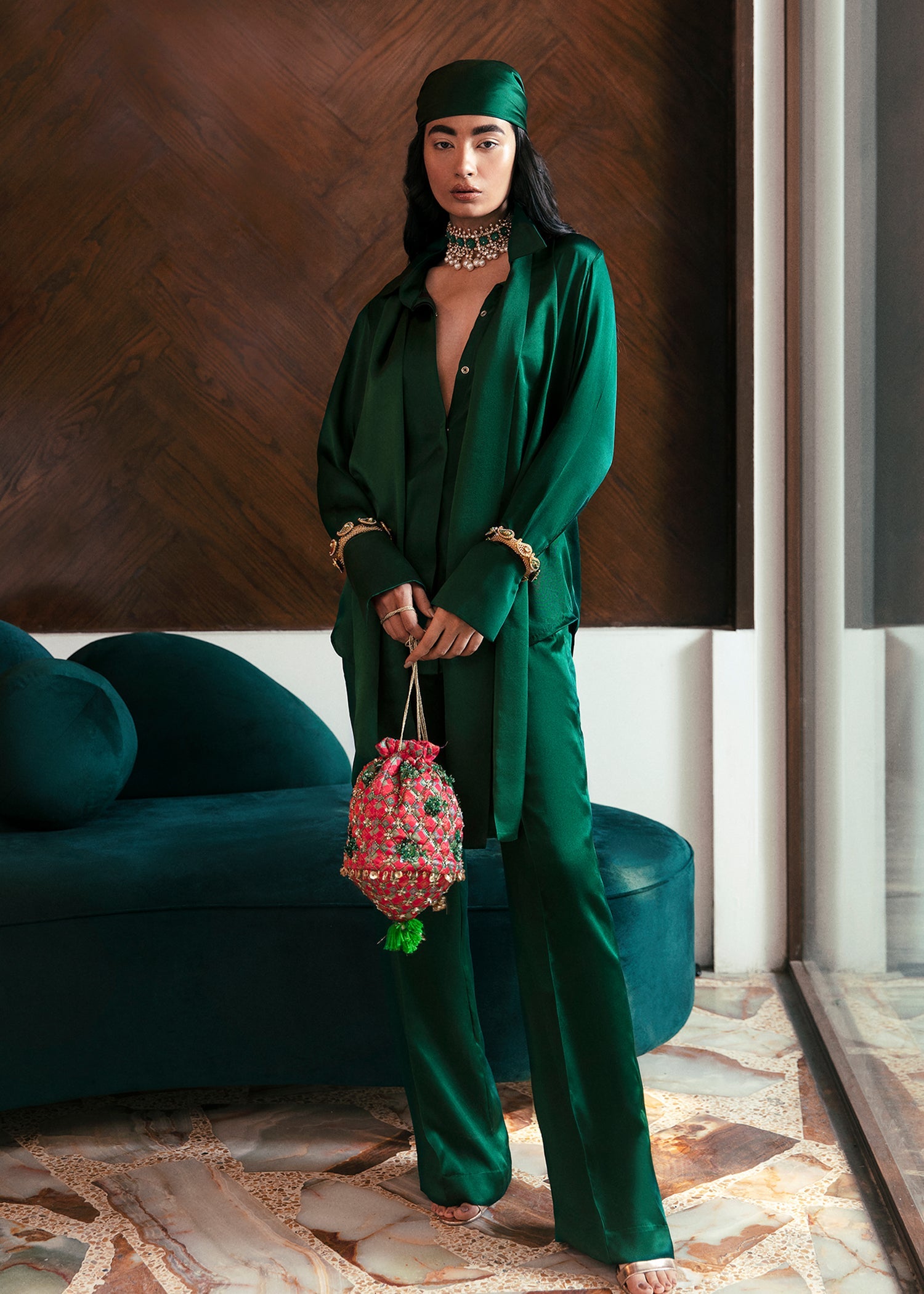 This emerald green satin set consists button down shirt and high-rise palazzo pants.