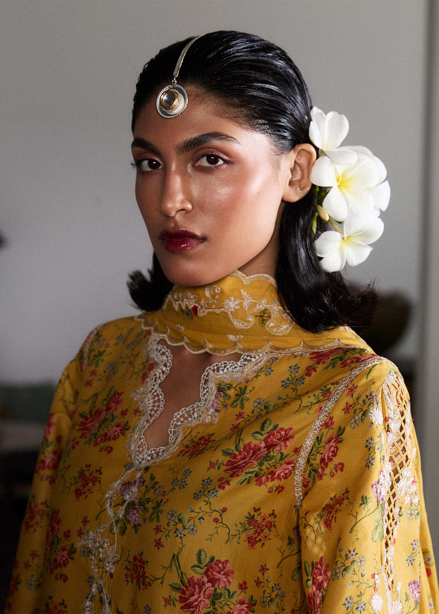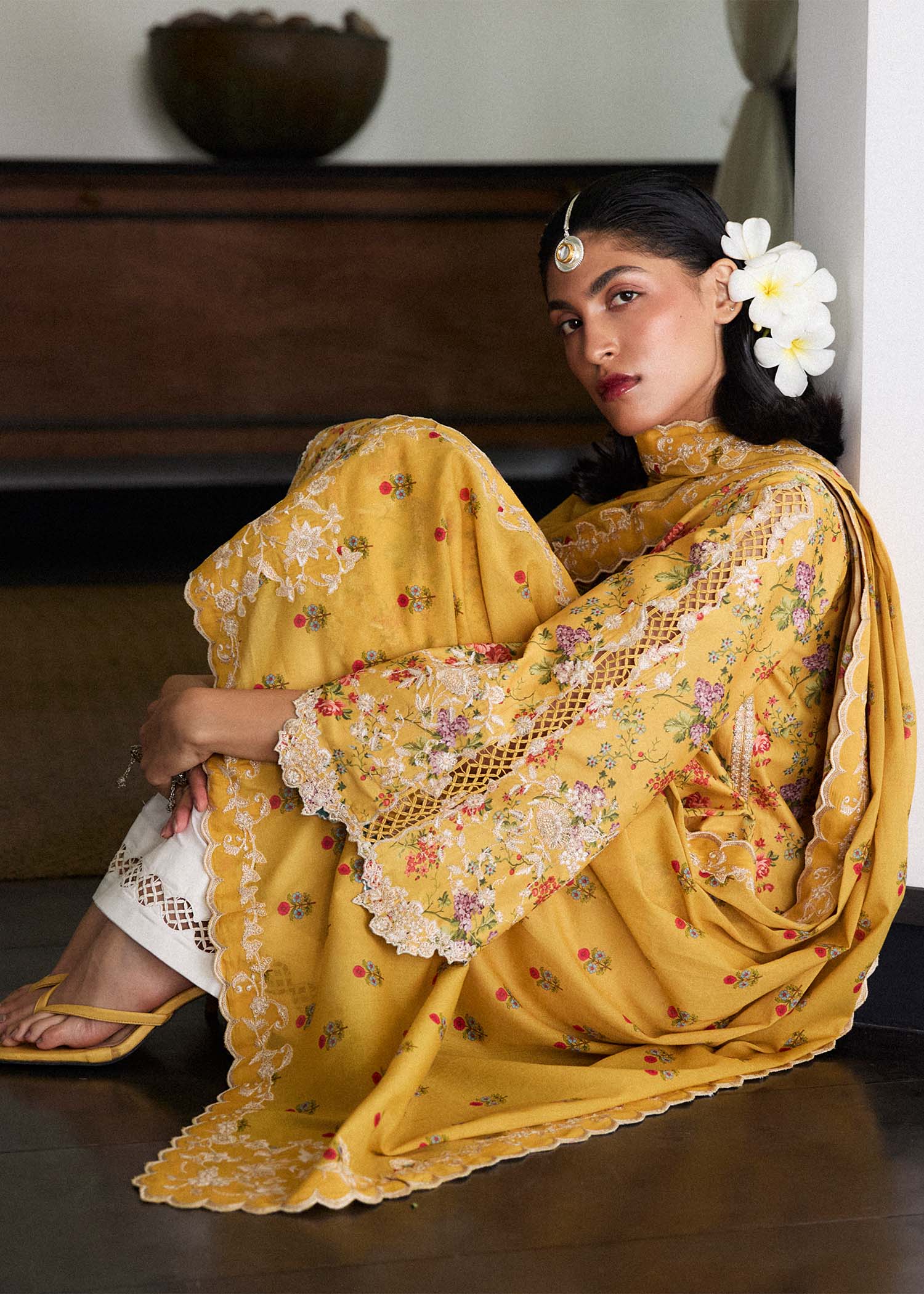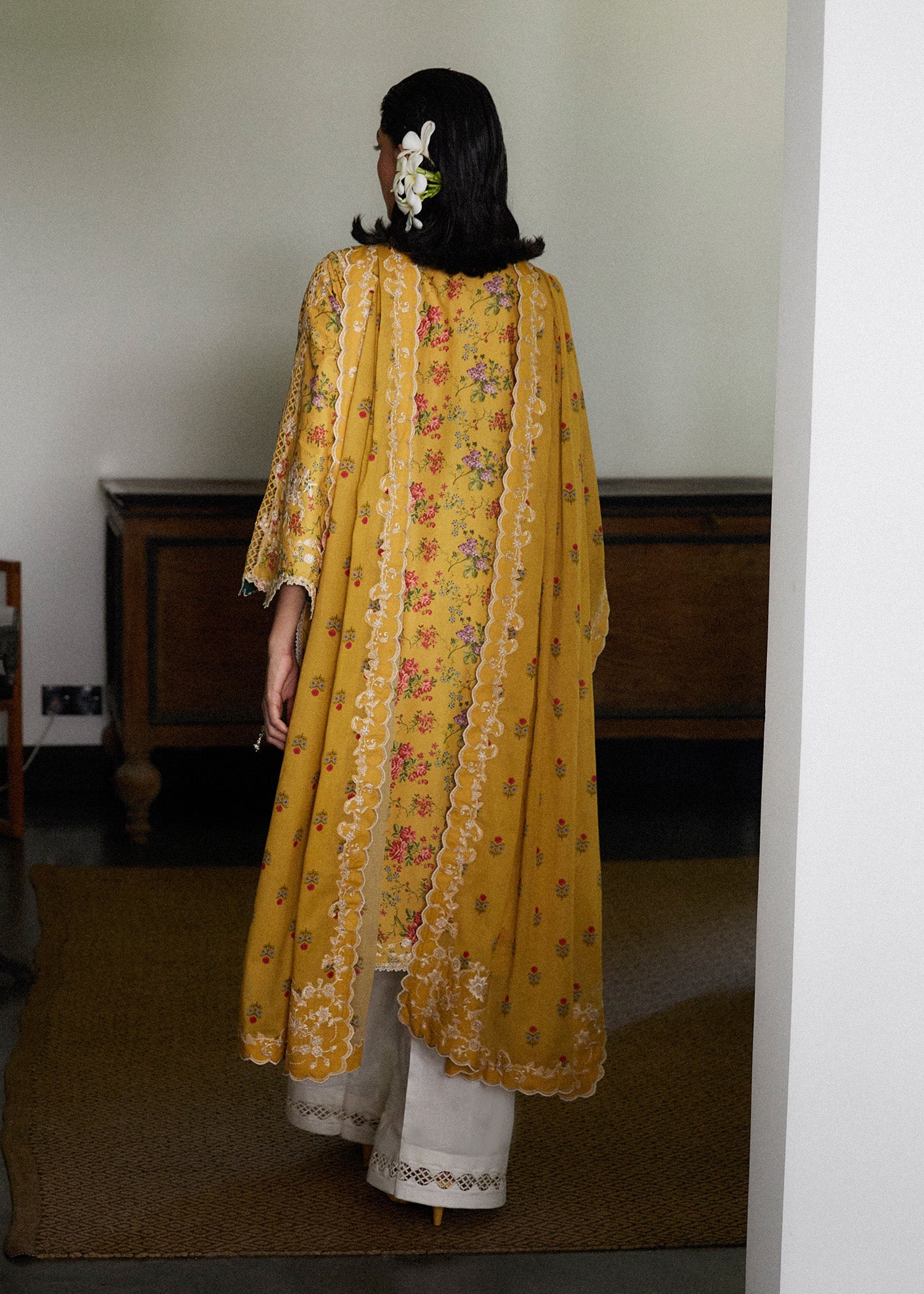 Breeze through summer in style with this elegant printed lawn outfit, featuring delicate ivory embroidery on the shirt, sleeves, and shalwar. Adorned with dainty floral prints, it’s paired with a lightweight lawn dupatta finished with four-sided corner embroideries for a refined touch. Perfect for warm days and festive moments.
