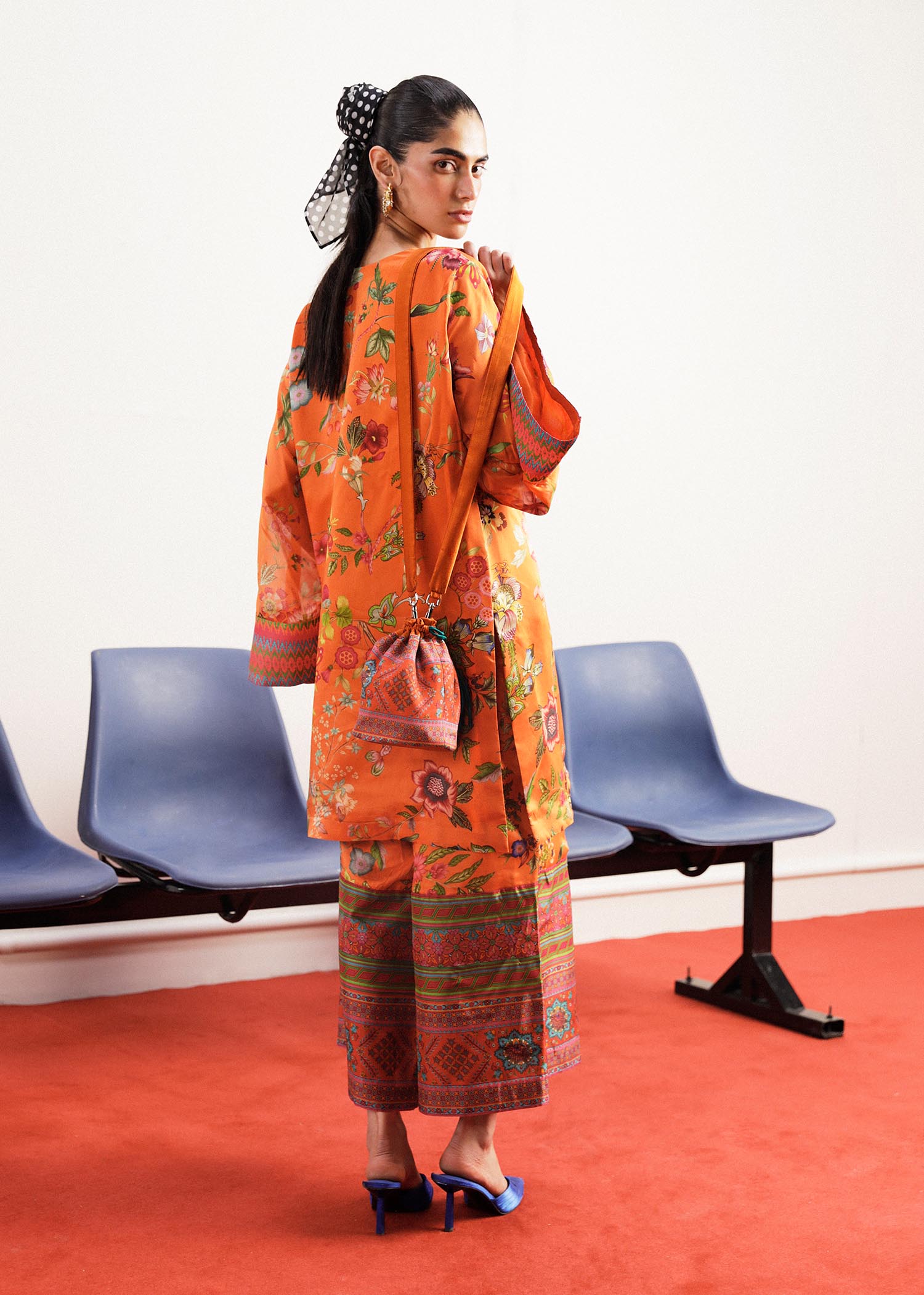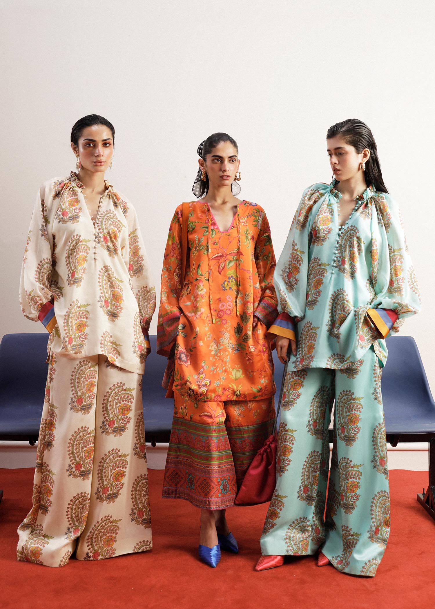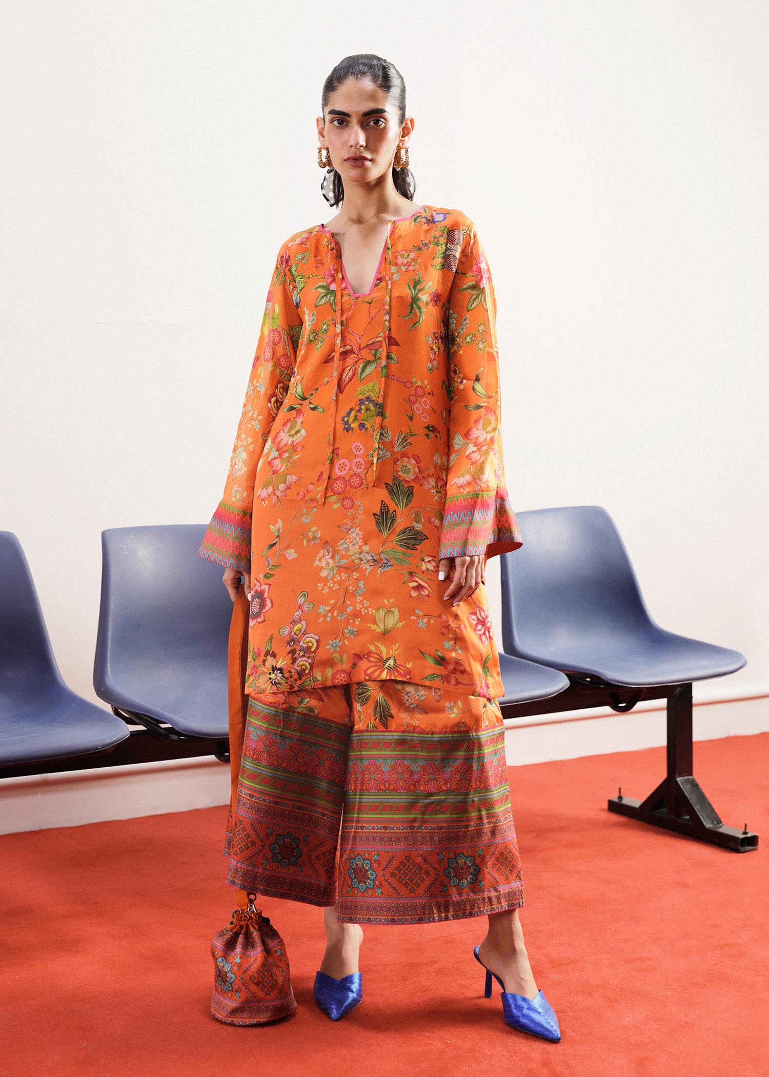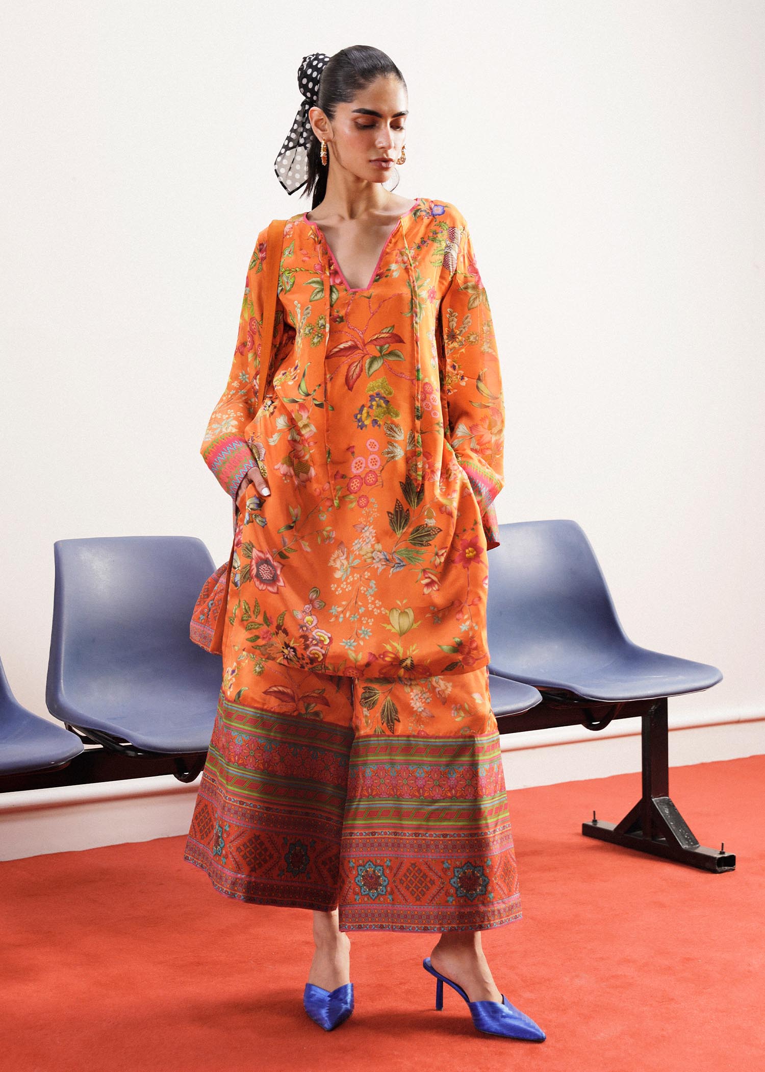 An endearing orange matching separate set covered in a beautiful floral print. The shirt has strings hanging down on the neckline. It’s paired with culottes with a beautiful printed border in satin silk.
