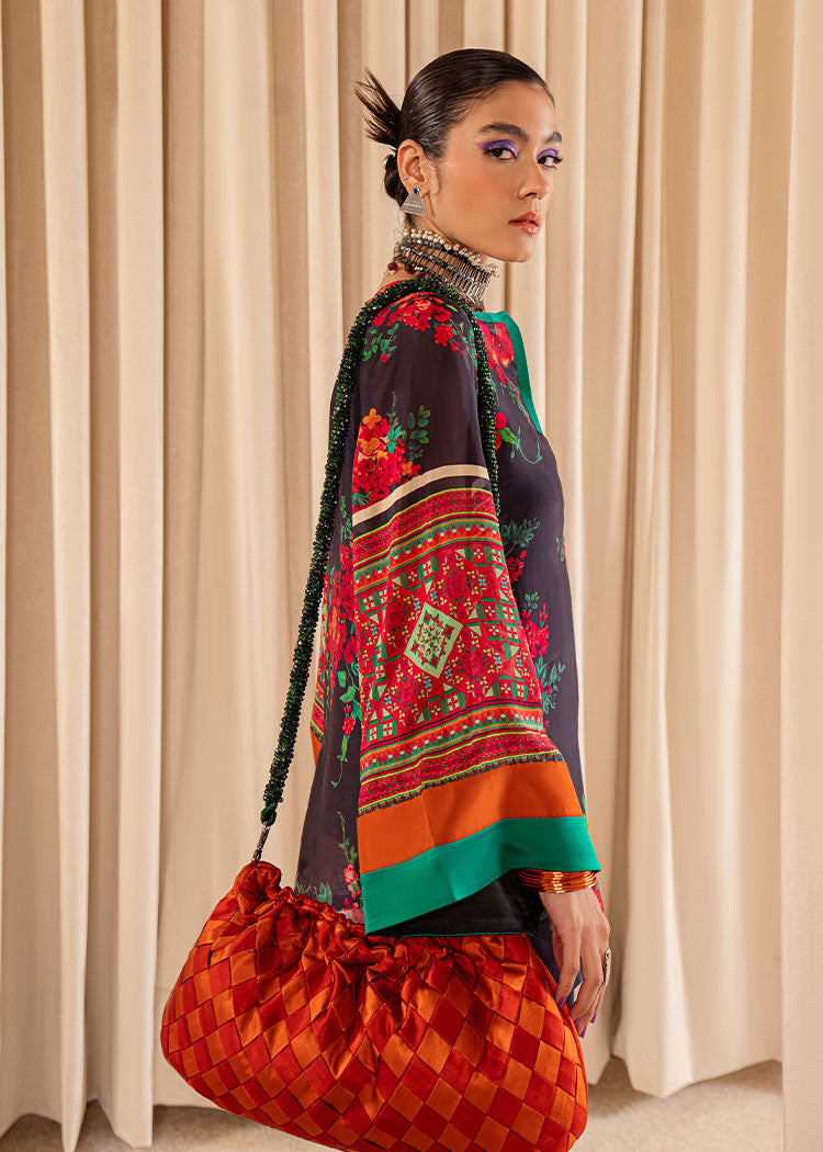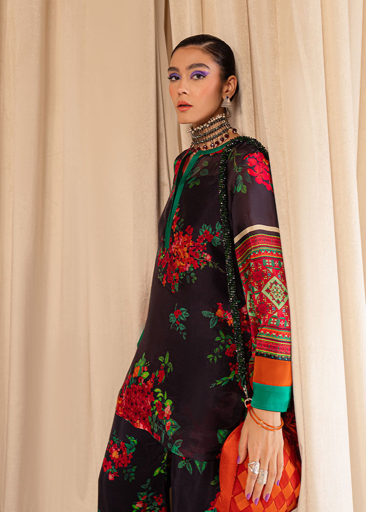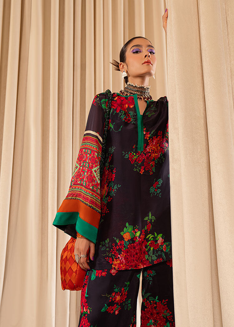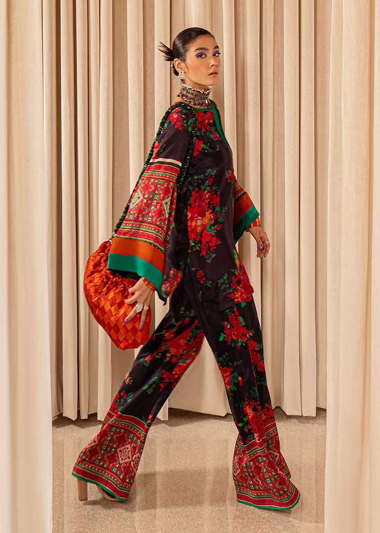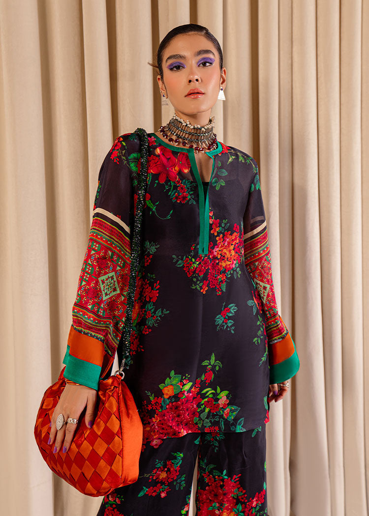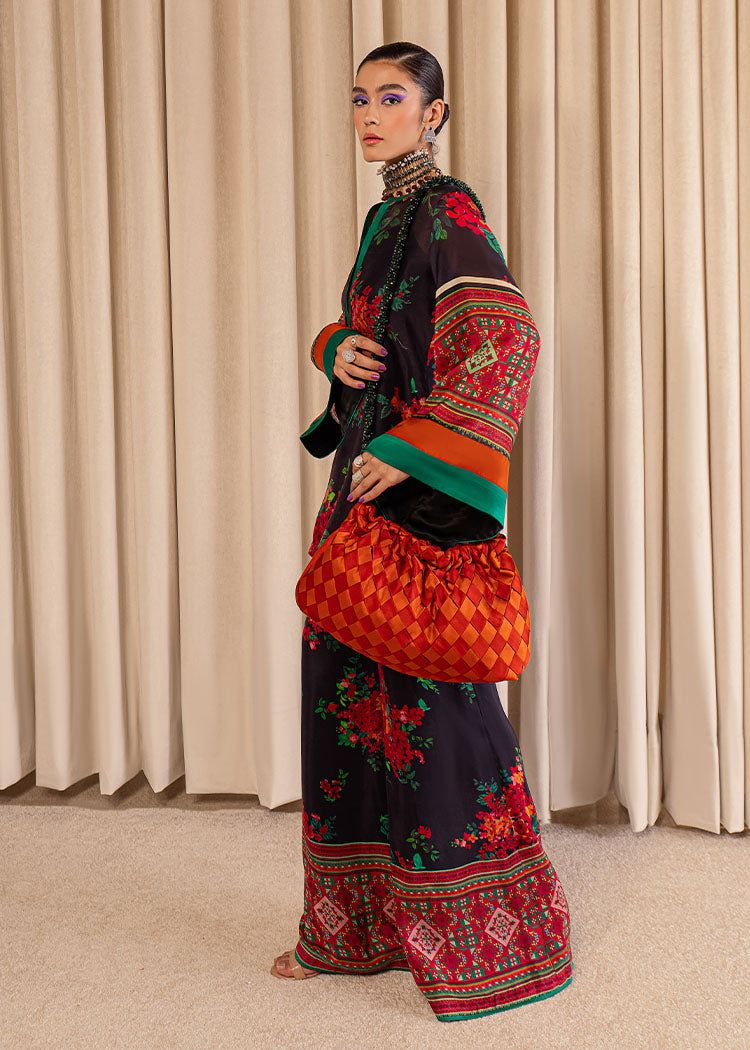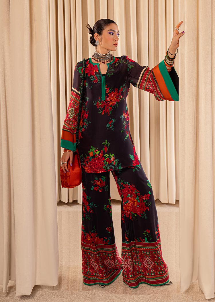 A gorgeous black floral printed short shirt with green satin edges on the neck and orange and green satin details on the hem of the sleeves. The outfit consists of palazzo pants with green satin edging on the hem of the pants.
