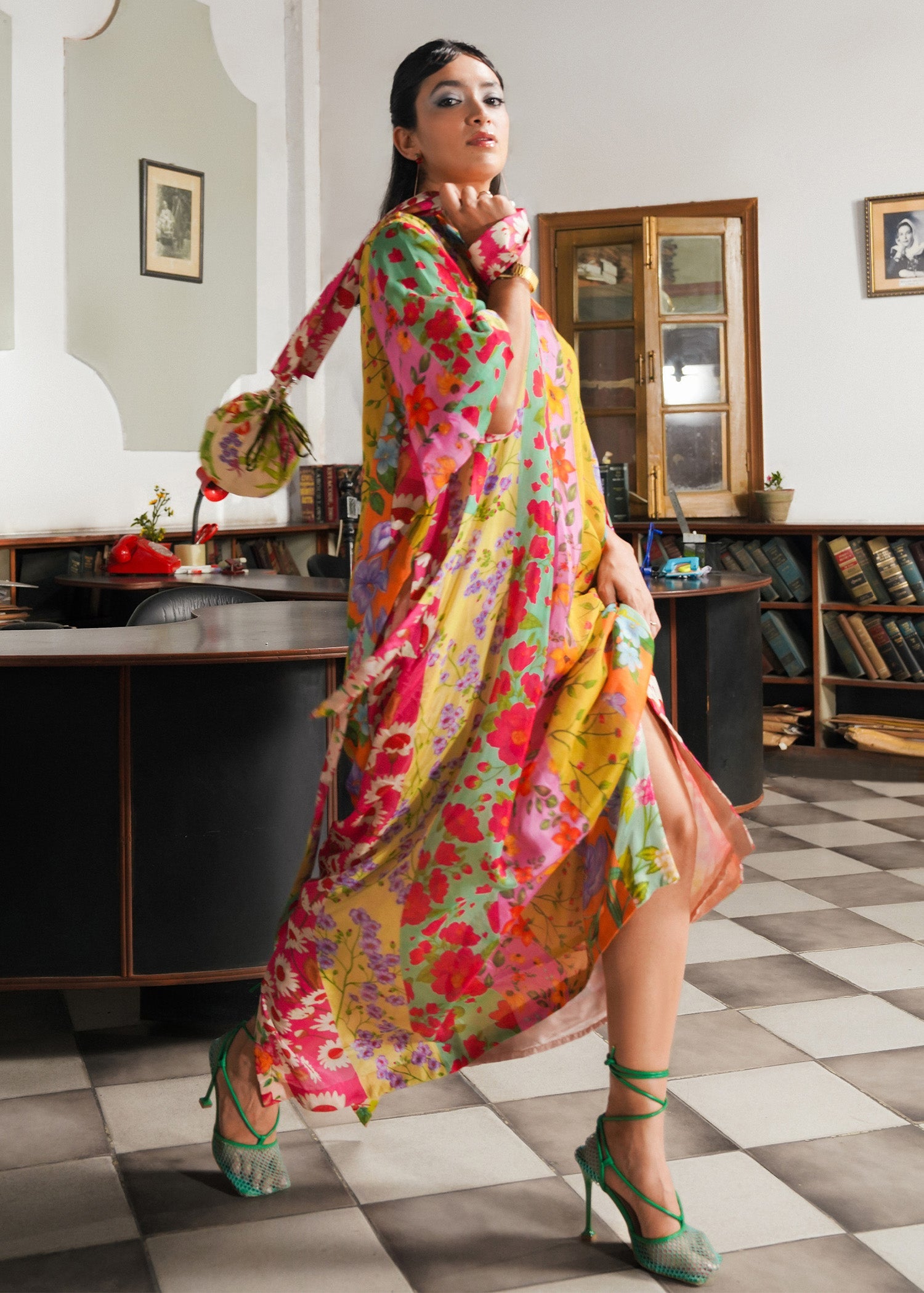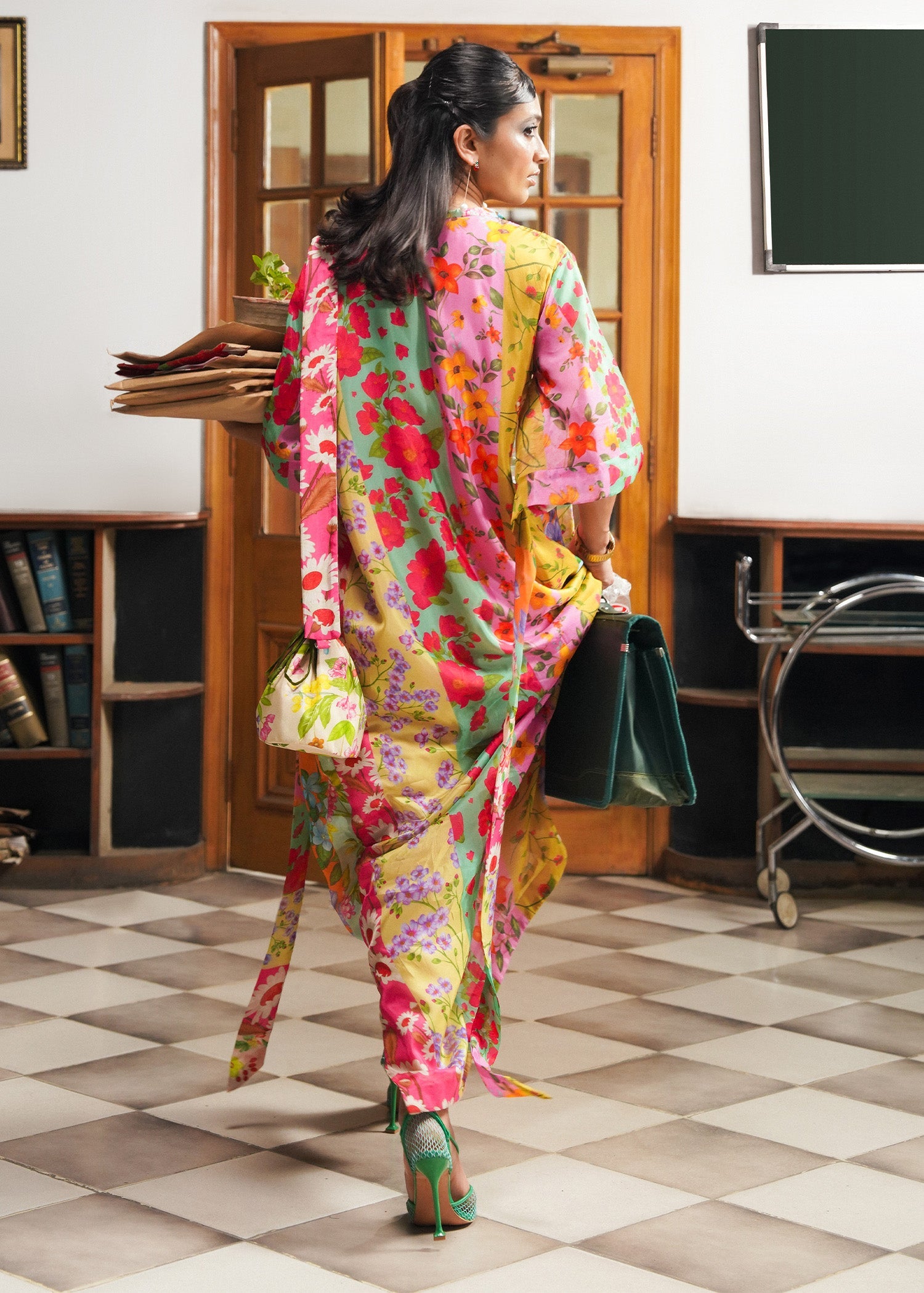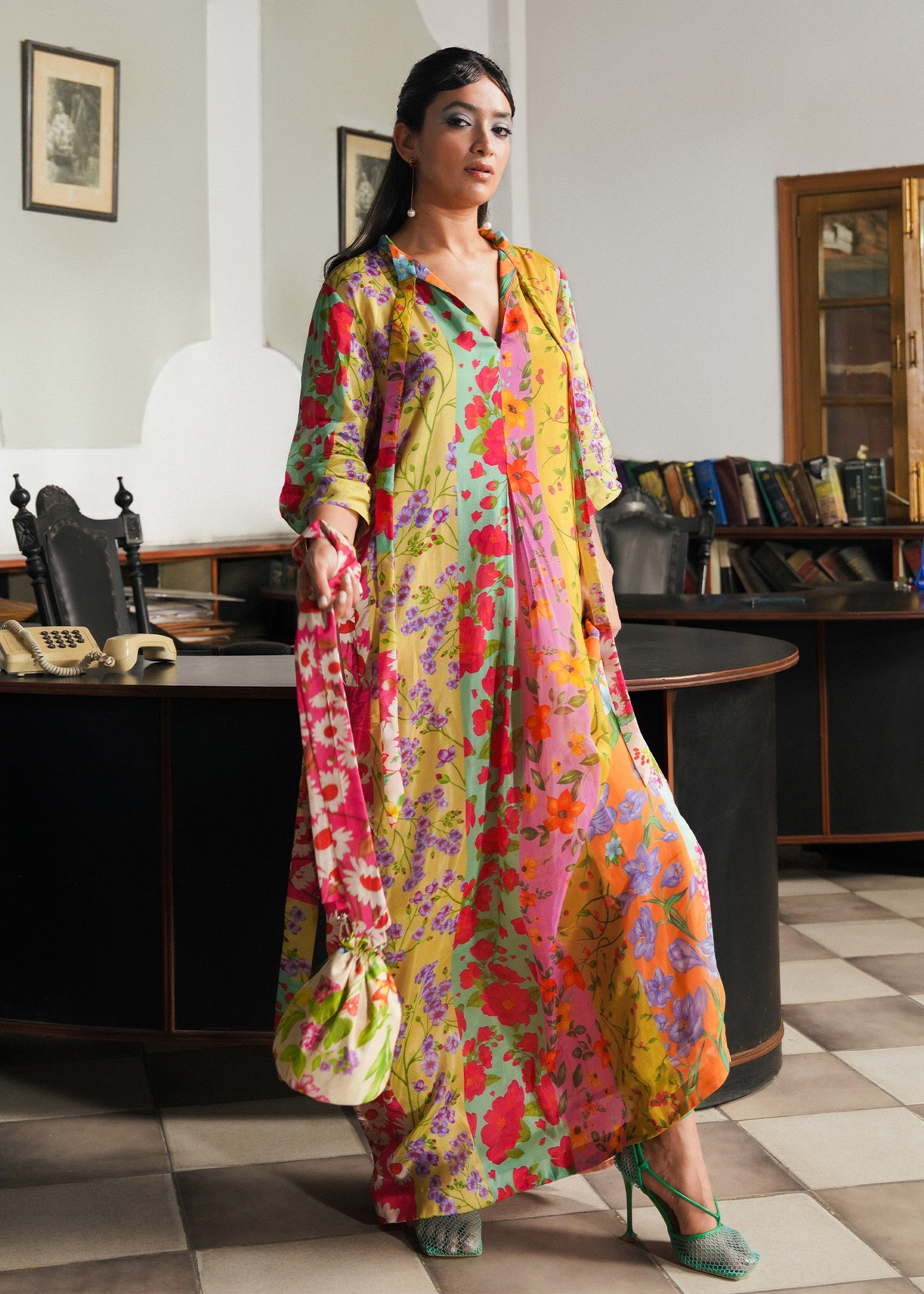 An exceptional multi-coloured full length printed silk shirt with long sleeves and cuffs and side slits. Make a style statement in this colourful ensemble this summer.