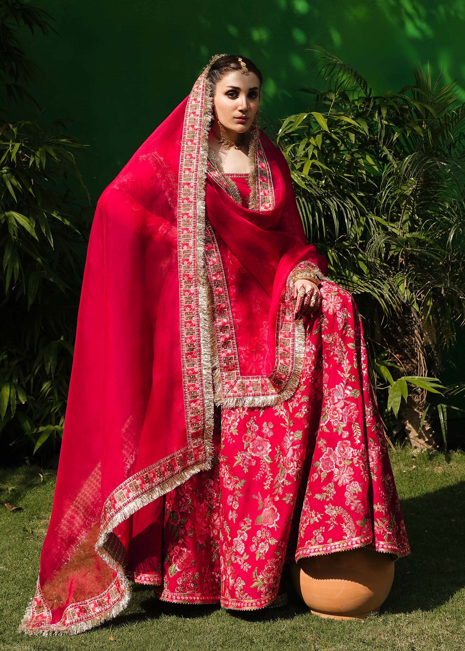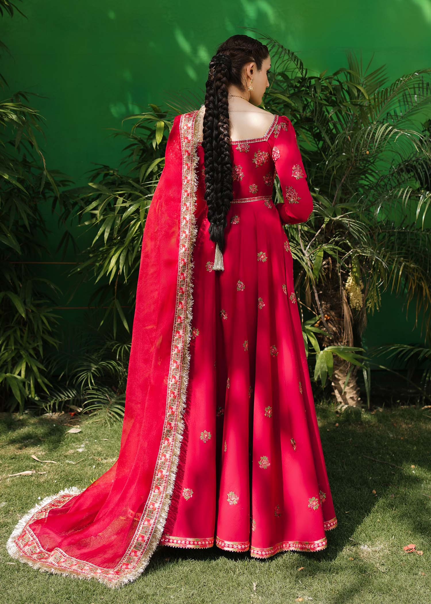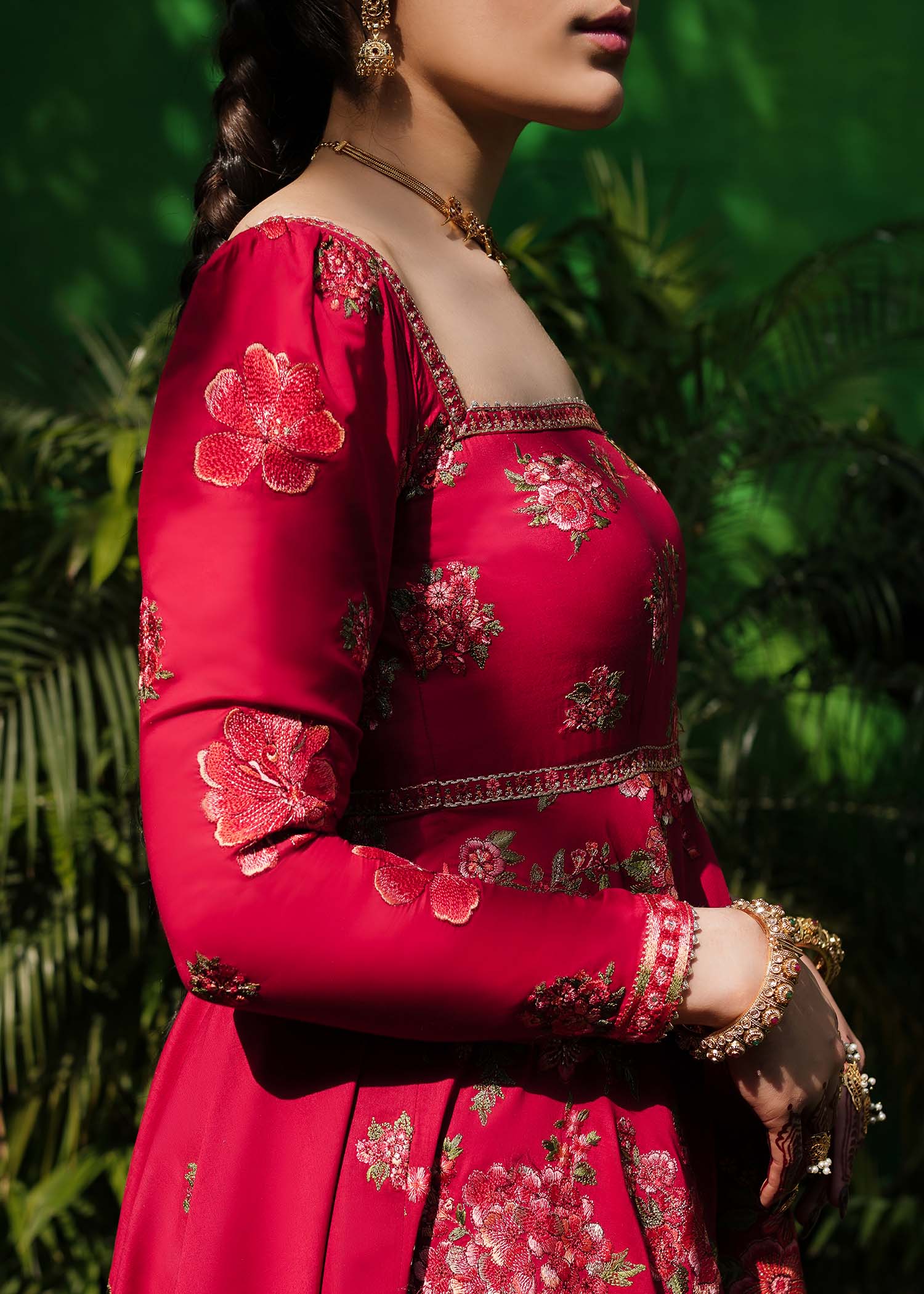 Quintessential pretty reddish pink peshwas curated with traditional floral bunch details on the panels. Muted cool tones of nude peach and greens create for a stunning Eid look. Paired with simple chooridar and embroidered organza dupatta finished with kiran detailing.