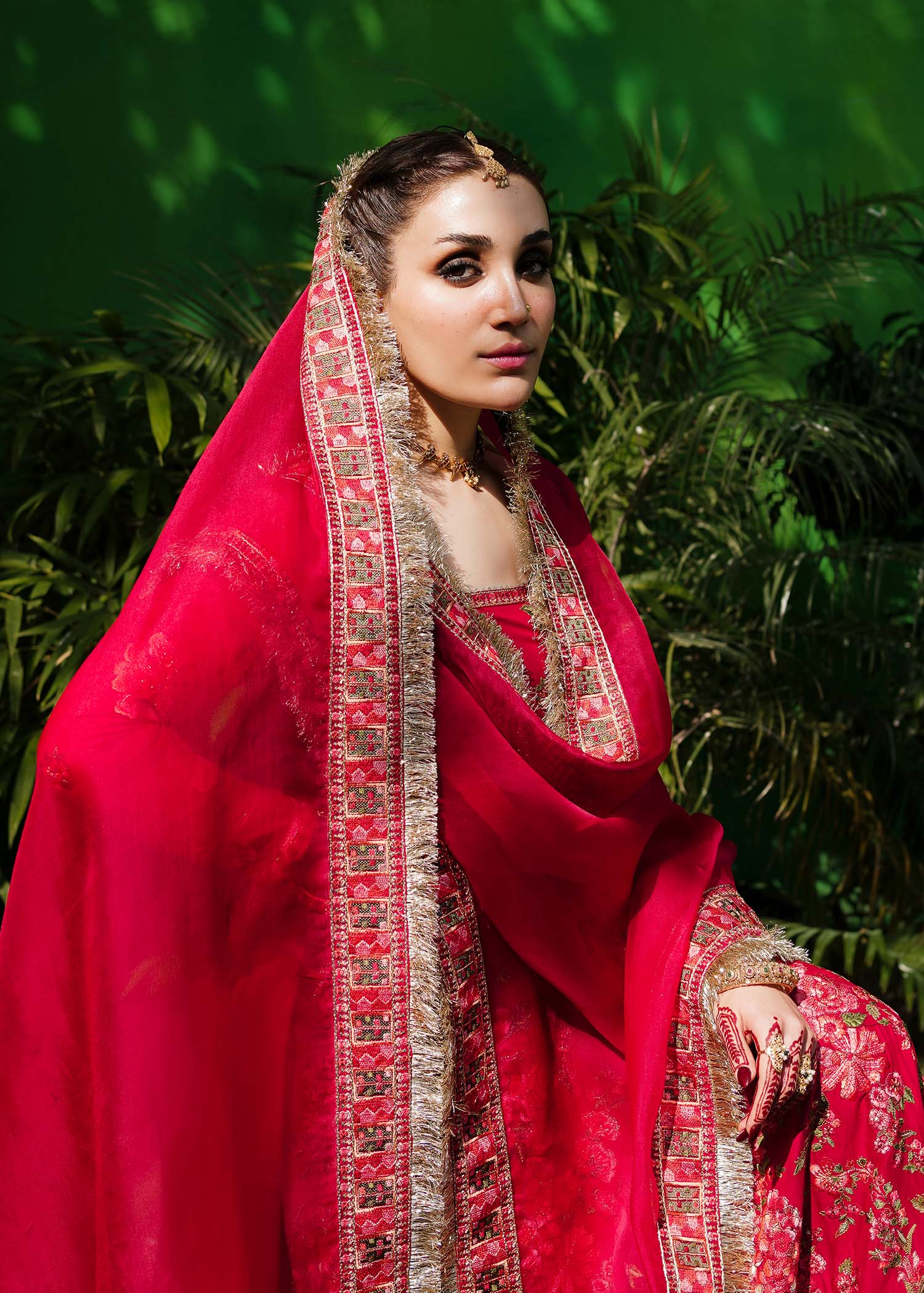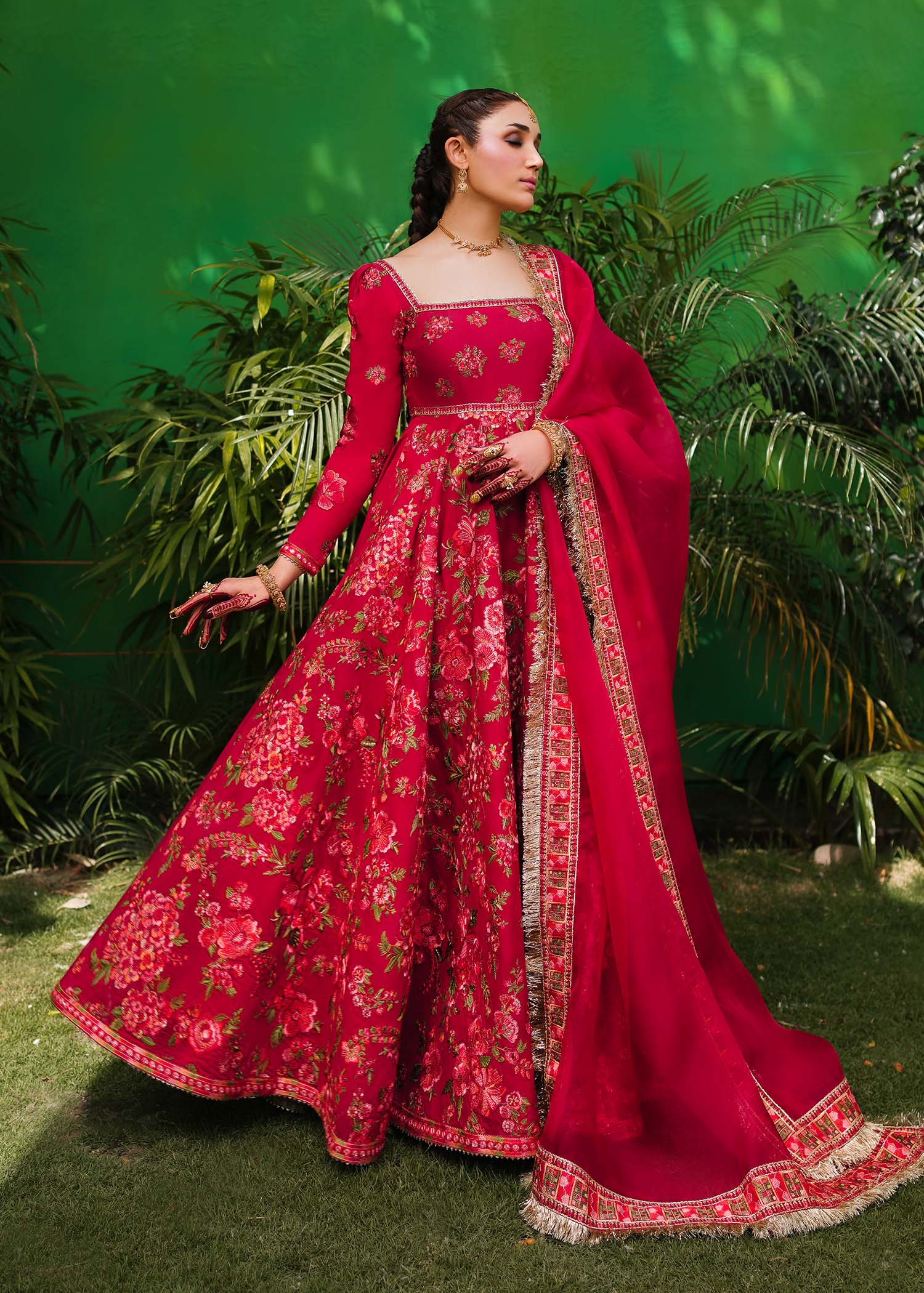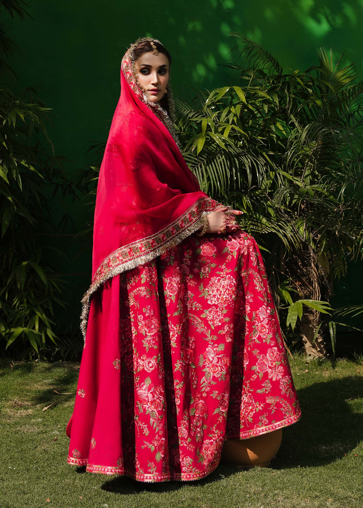 Quintessential pretty reddish pink peshwas curated with traditional floral bunch details on the panels. Muted cool tones of nude peach and greens create for a stunning Eid look. Paired with simple chooridar and embroidered organza dupatta finished with kiran detailing.