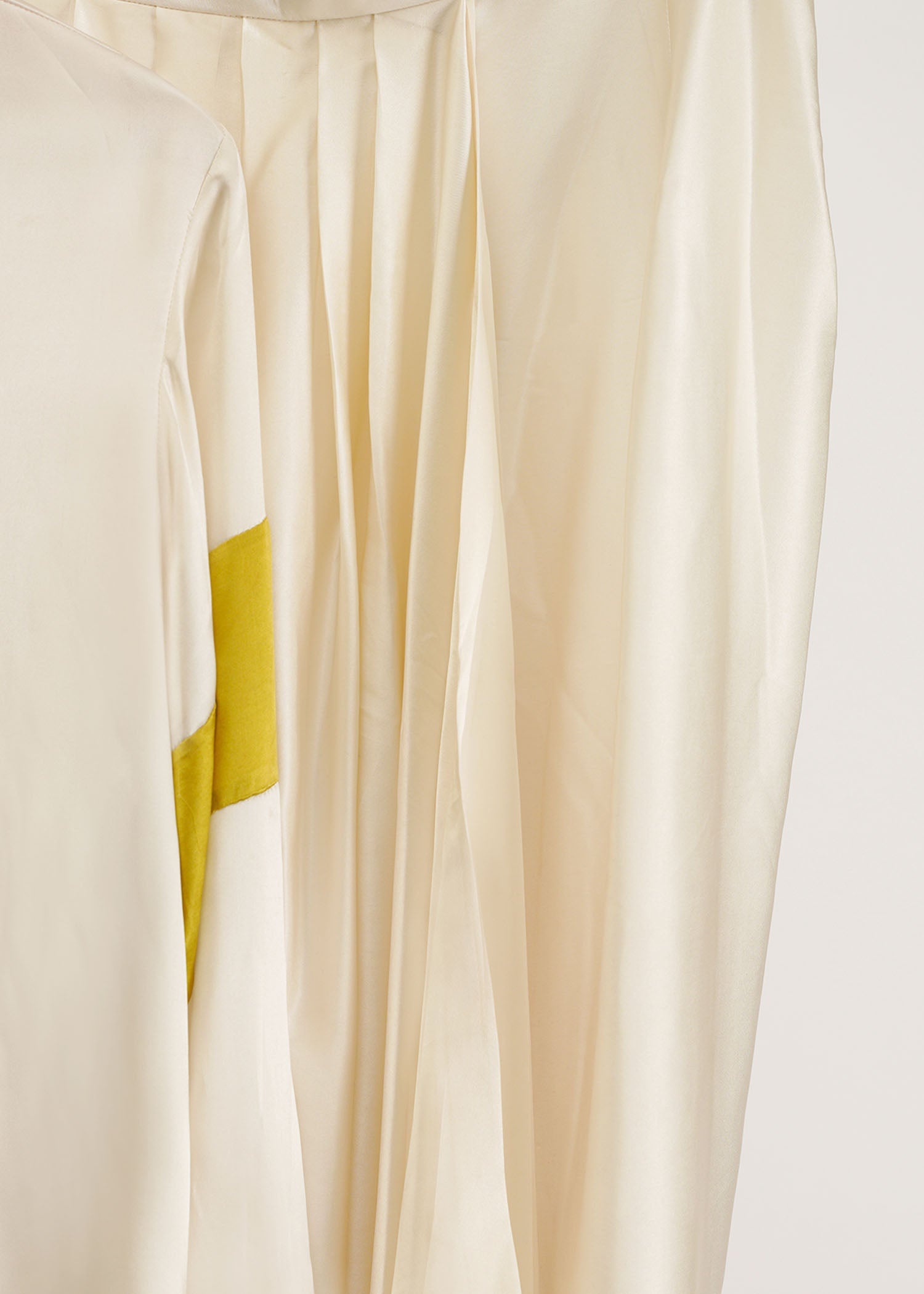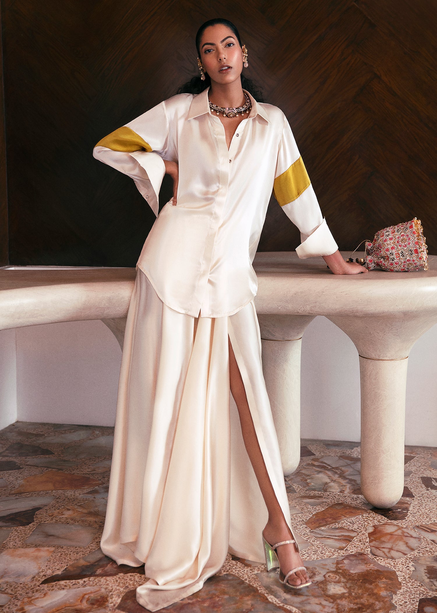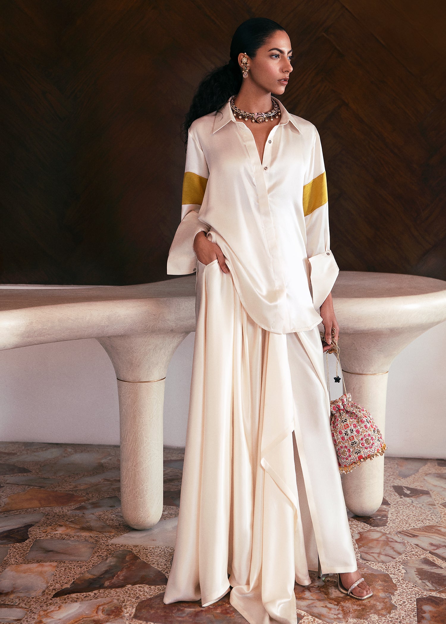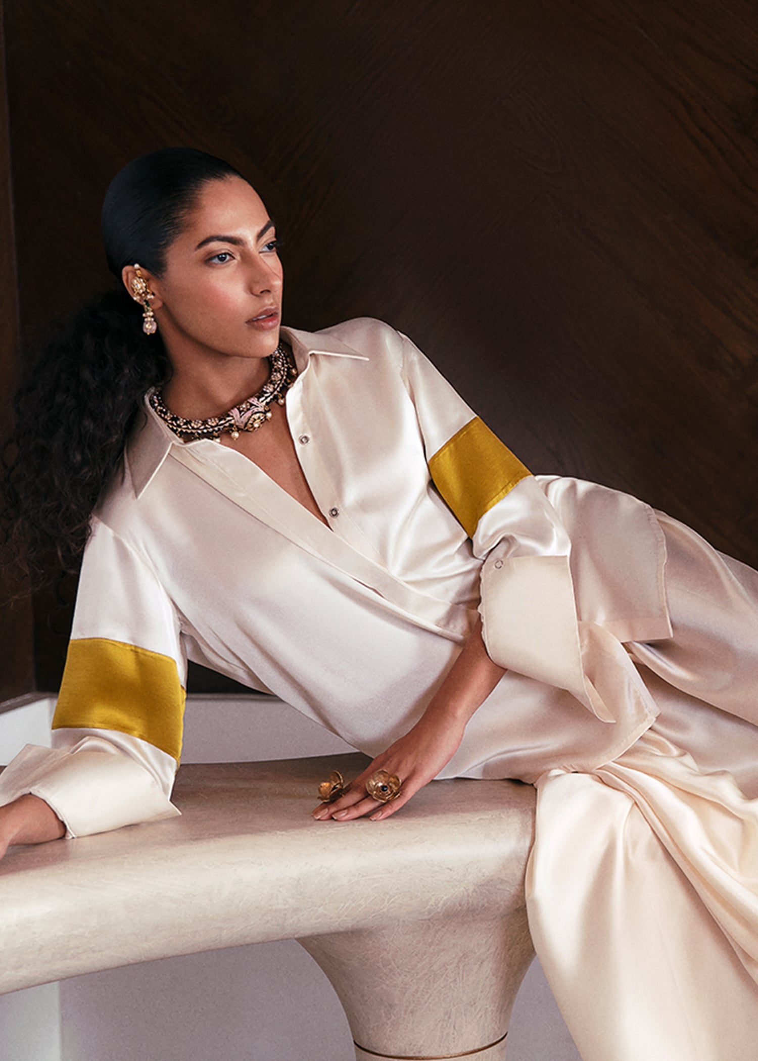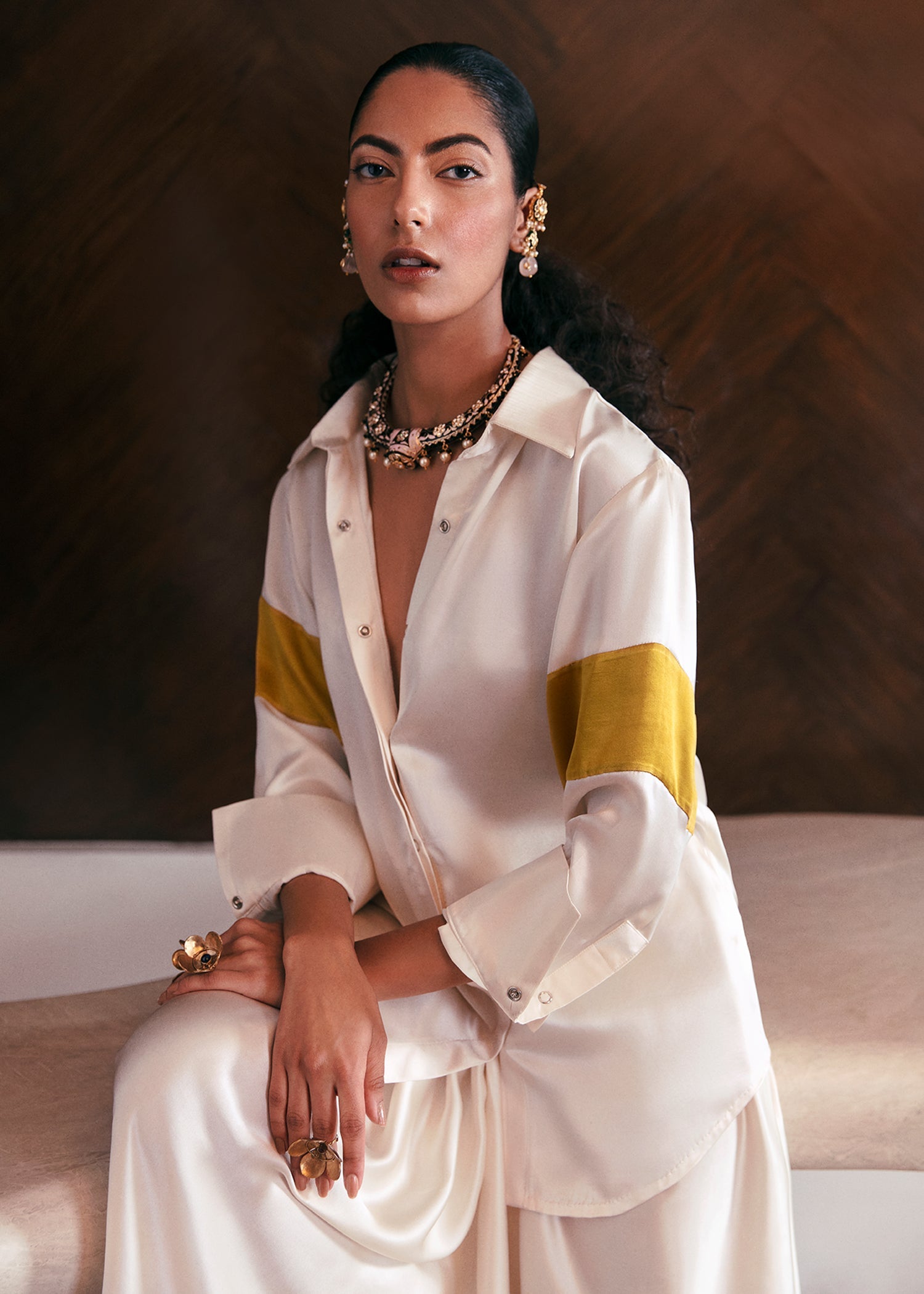 A fabulous dark green raw silk shirt consisting of hot pink loop buttons decsending from the neck till mid abdomen. the hem, sides and the edges of sleeves of the shirt, all have hot pink details. The sleeves also have gathered puffed details on the shoulders giving them a lifted chic look. The green raw silk palazzo pants also have hot pink details on the hem.