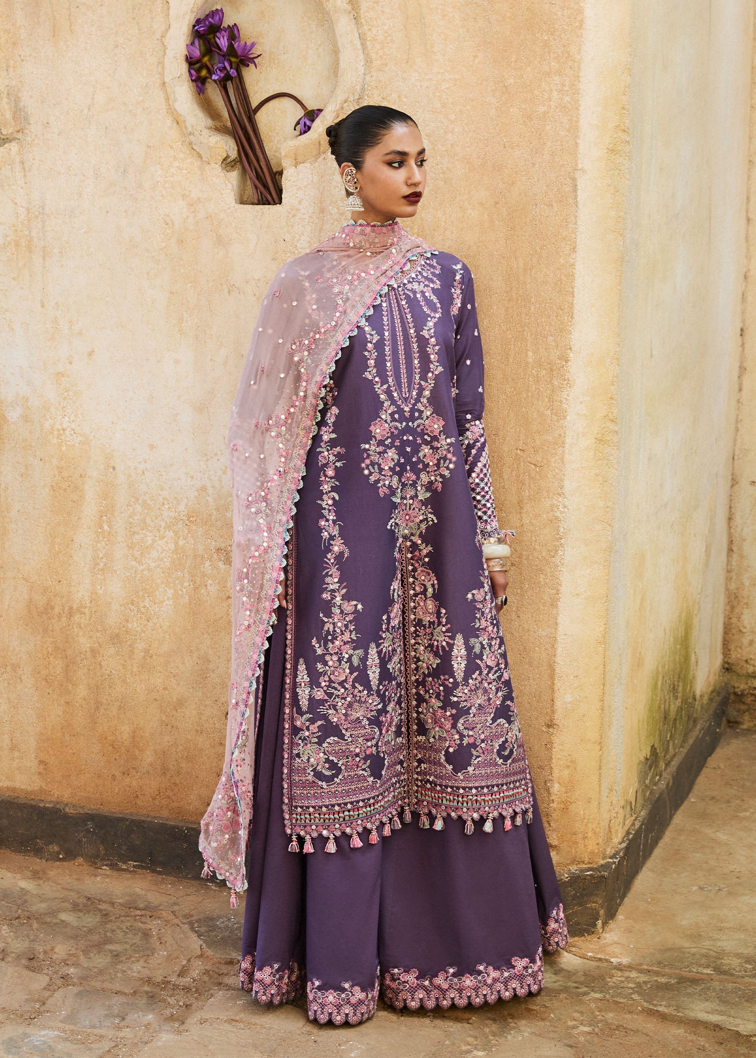 A purple ensemble presents a picturesque vision of rich tradition and sophistication, enhanced by meticulously executed embroidery on lawn fabric. Alluring floral motifs, combined with panni details in pink hues, lend an ethereal quality. The chiffon dupatta features complementary embroidery details. This traditional and elegant silhouette is completed by coordinating purple embroidered trousers.