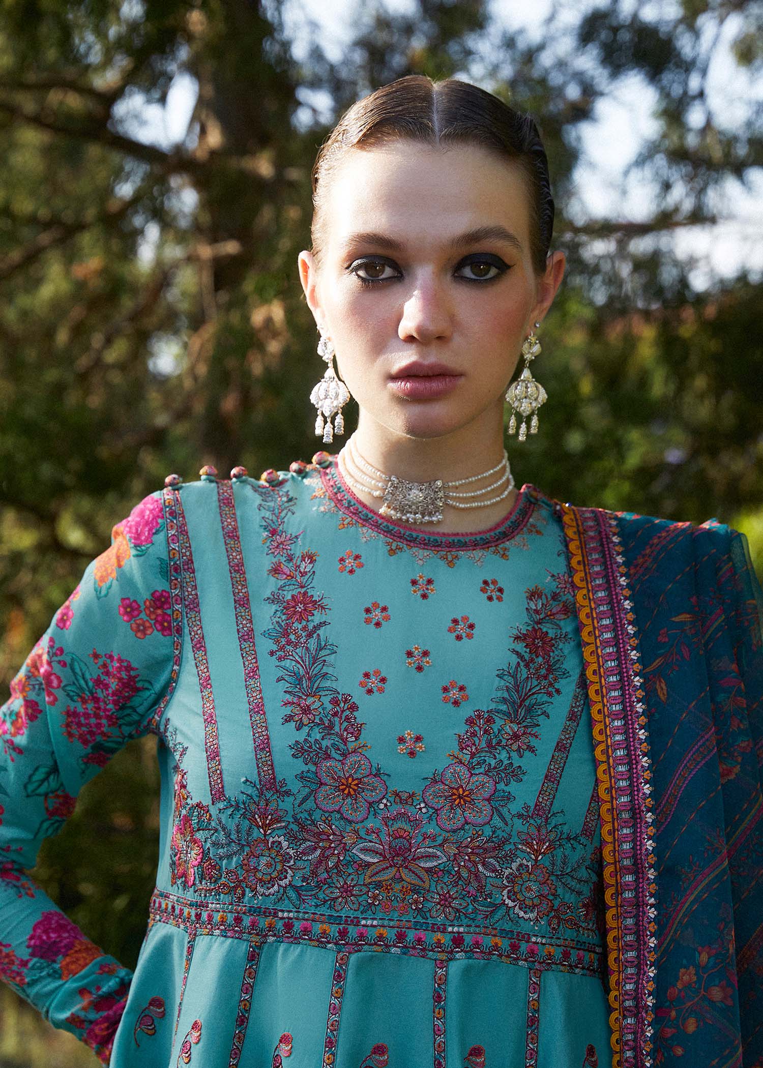 Pretty aqua green peshwas with bold floral composition on panels, floral diagonal printed chooridar with contrast color printed dupatta with four side embroidery border is harmonious blend of aesthetics and traditional embroideries.