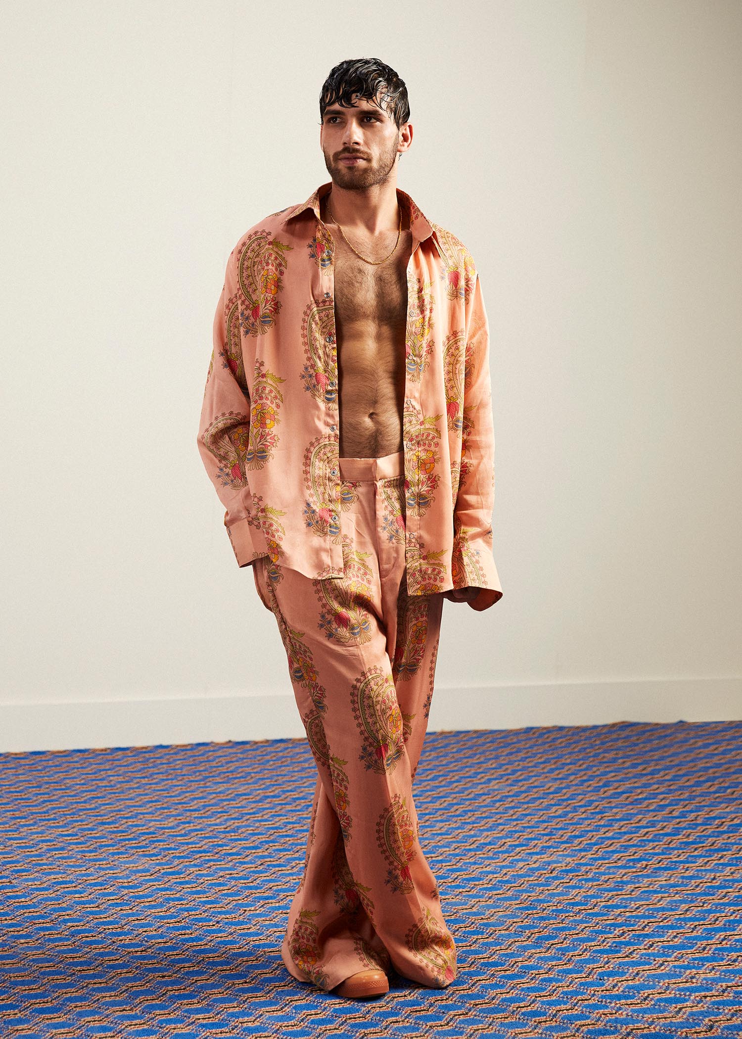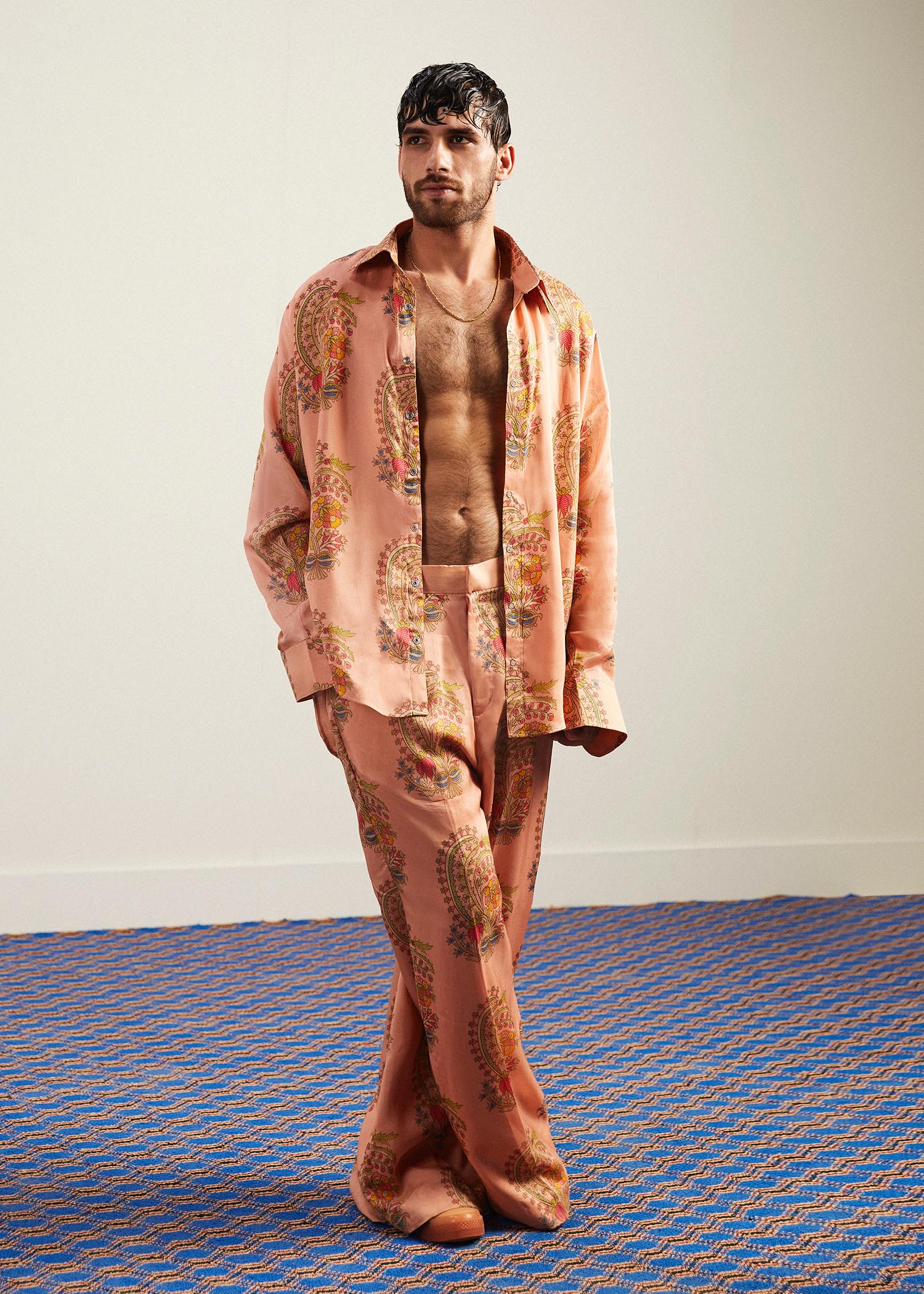 A Peach matching separate set, including a peach printed button down shirt with collar and a similarly printed trouser to pair it with.