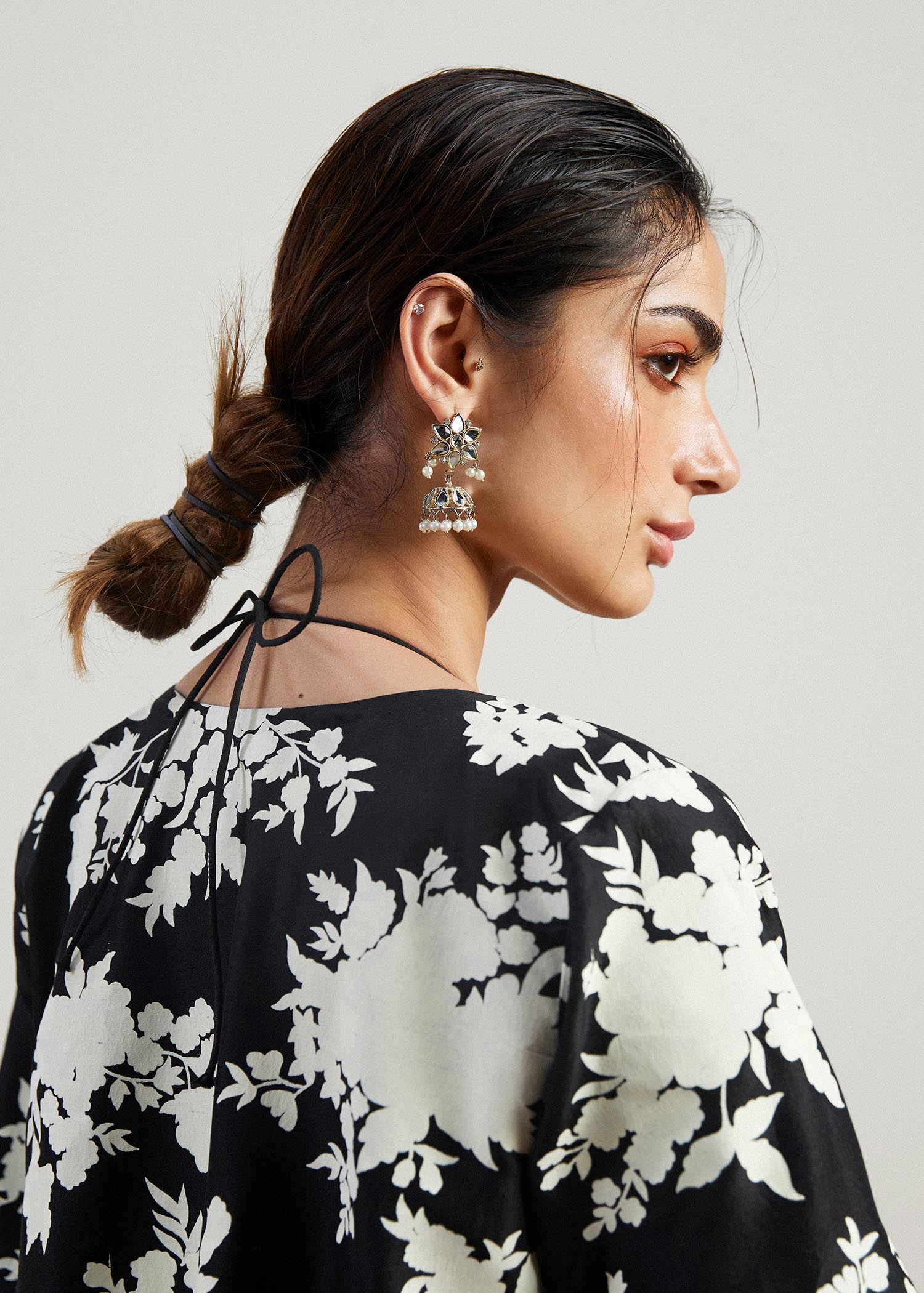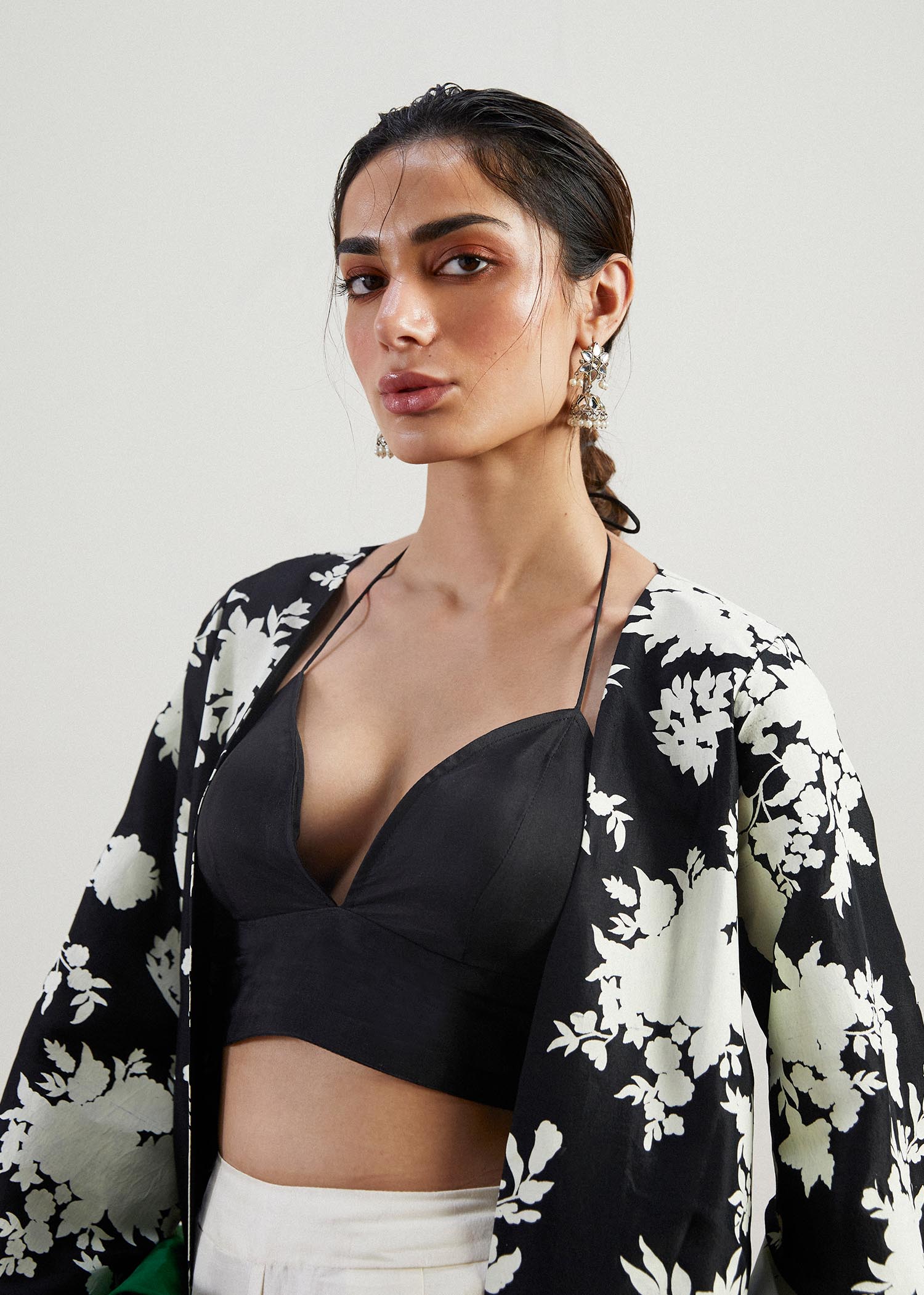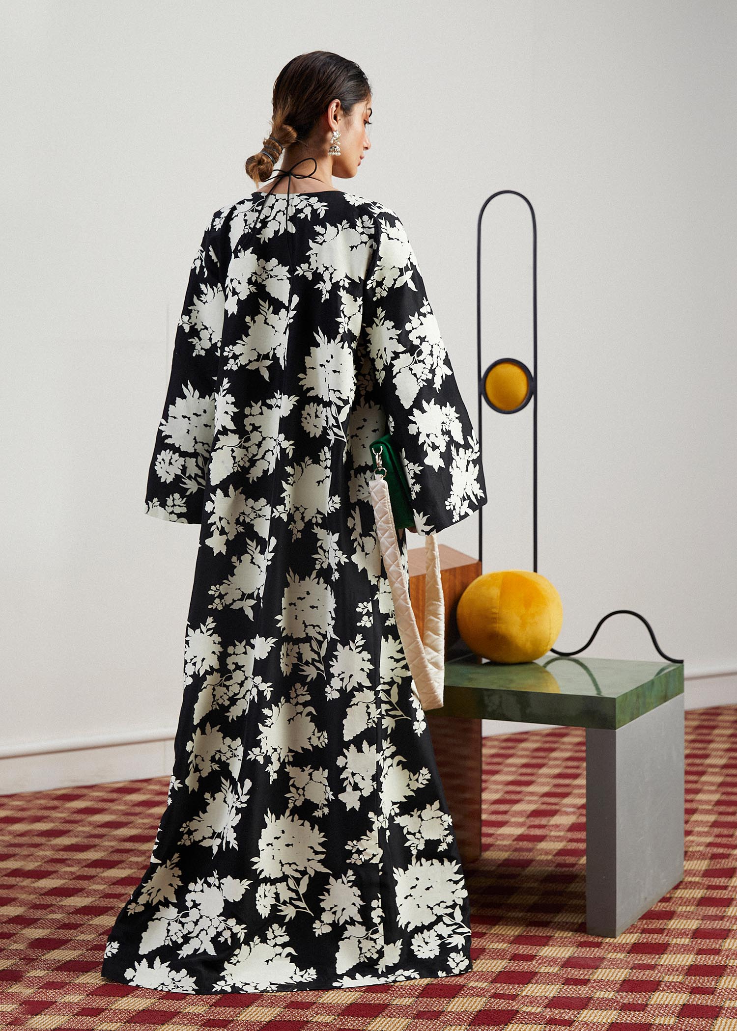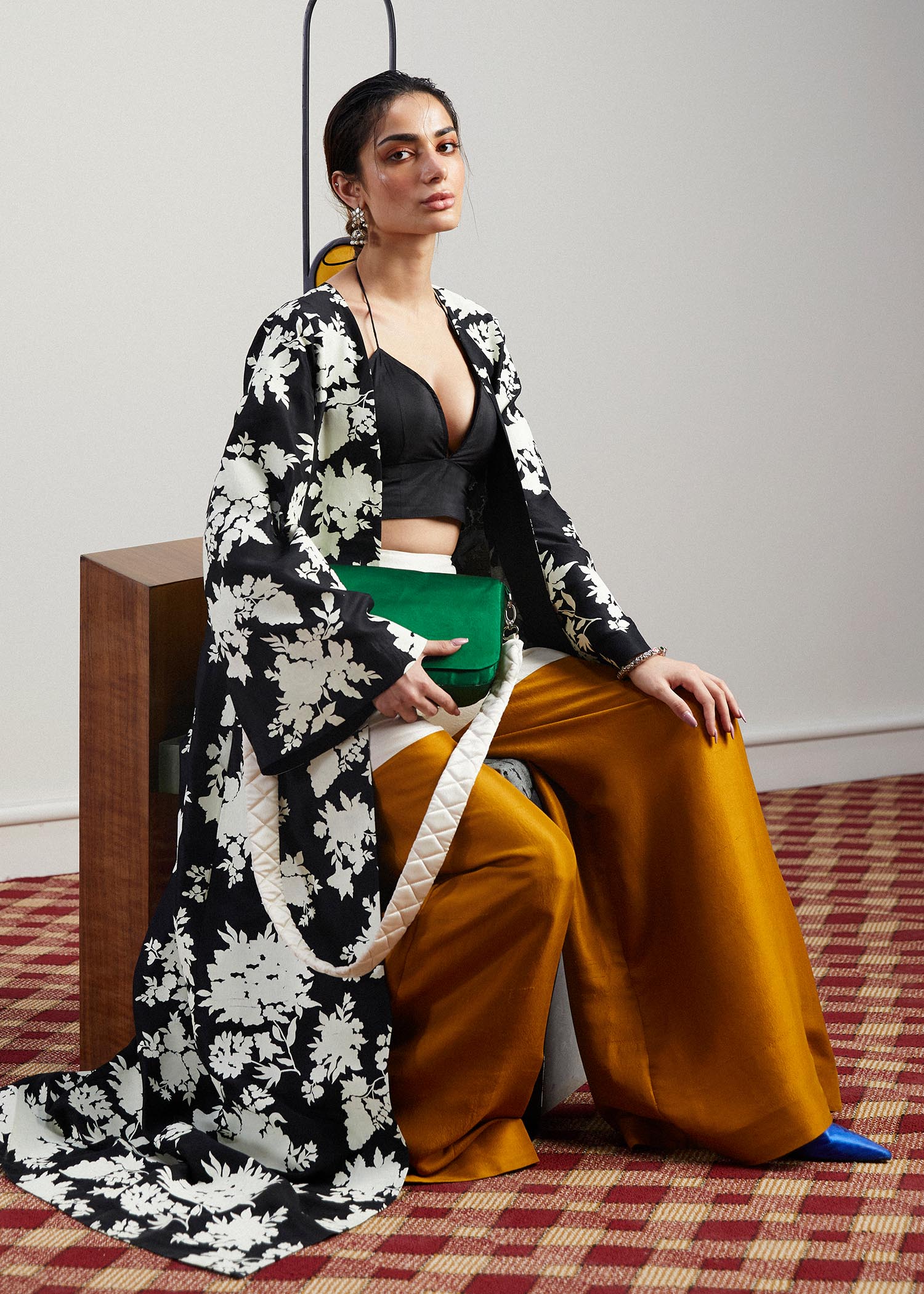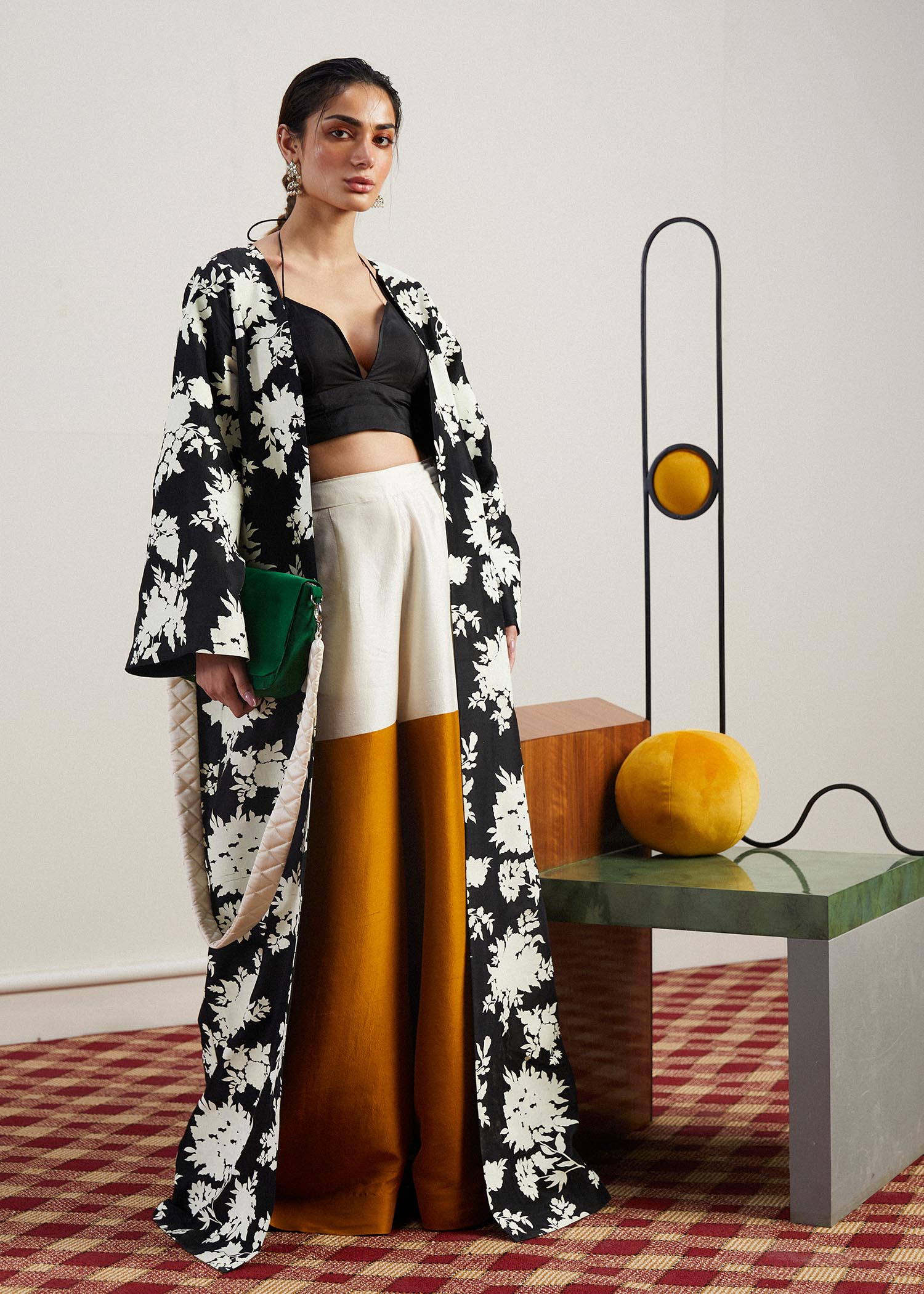 A chic black raw silk floor length printed jacket with long sleeves paired with classic raw silk palazzo pants in contrasting shades of white and mustard.