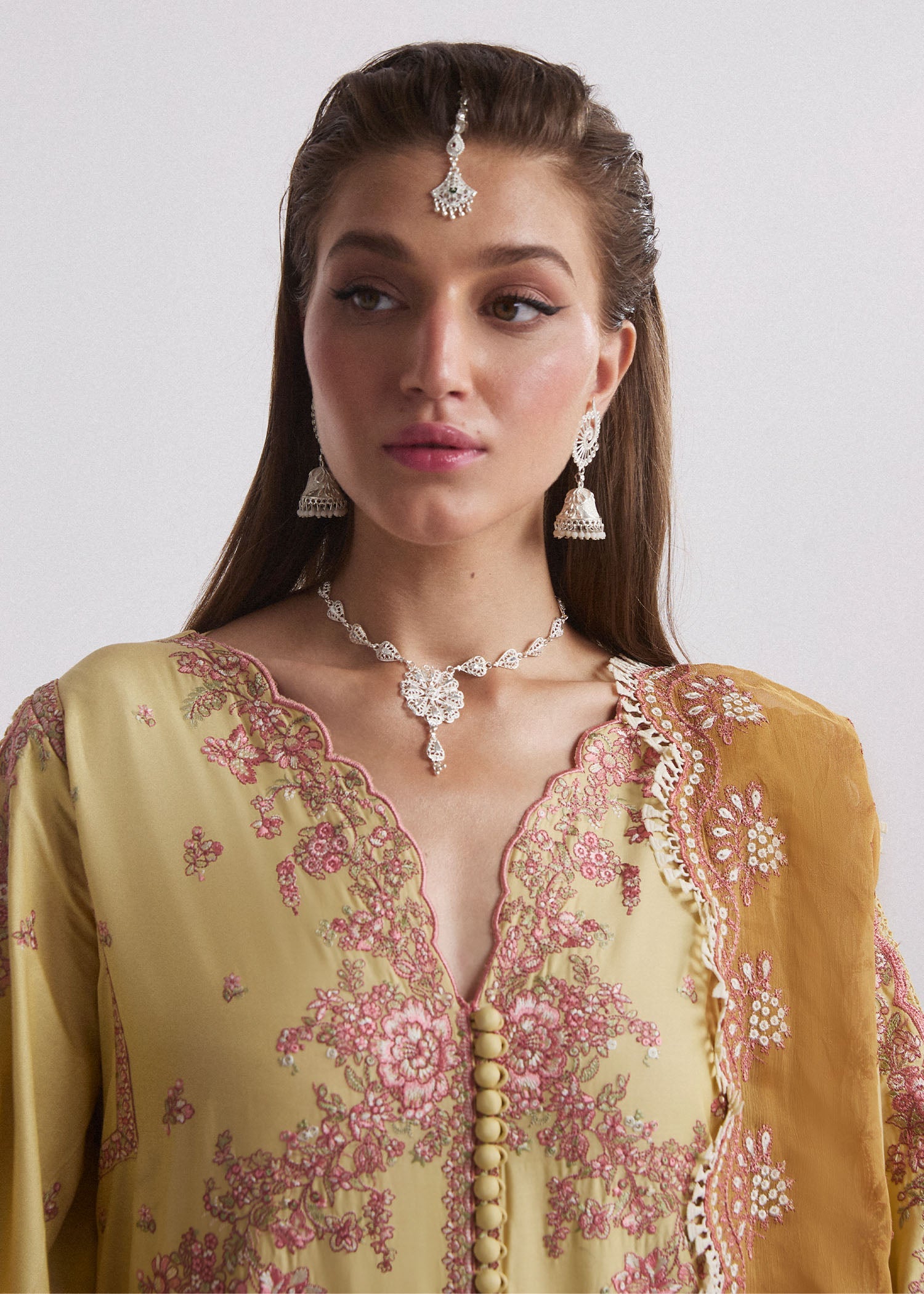 This pastel yellow summery resplendent shirt with complex floral embroideries merging with intricate details creating an amazing vibe. Interesting contrast of pink in embroideries adds a glimpse of freshness to the floral arrangement. Adding the trouser with floral print. Gold yellow chiffon dupatta perfectly compliments this light summer palette.