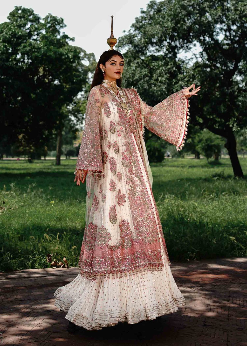 Ivory peshwas is all decked up with delicate floral motifs in shades of pinks,purple and green embroidery enhanced with gold tilla and sequin topped with buggle beads and sequins.It has been paired with sequined spray crushed sharara and completing this look with net dupatta and heavy pallu border.