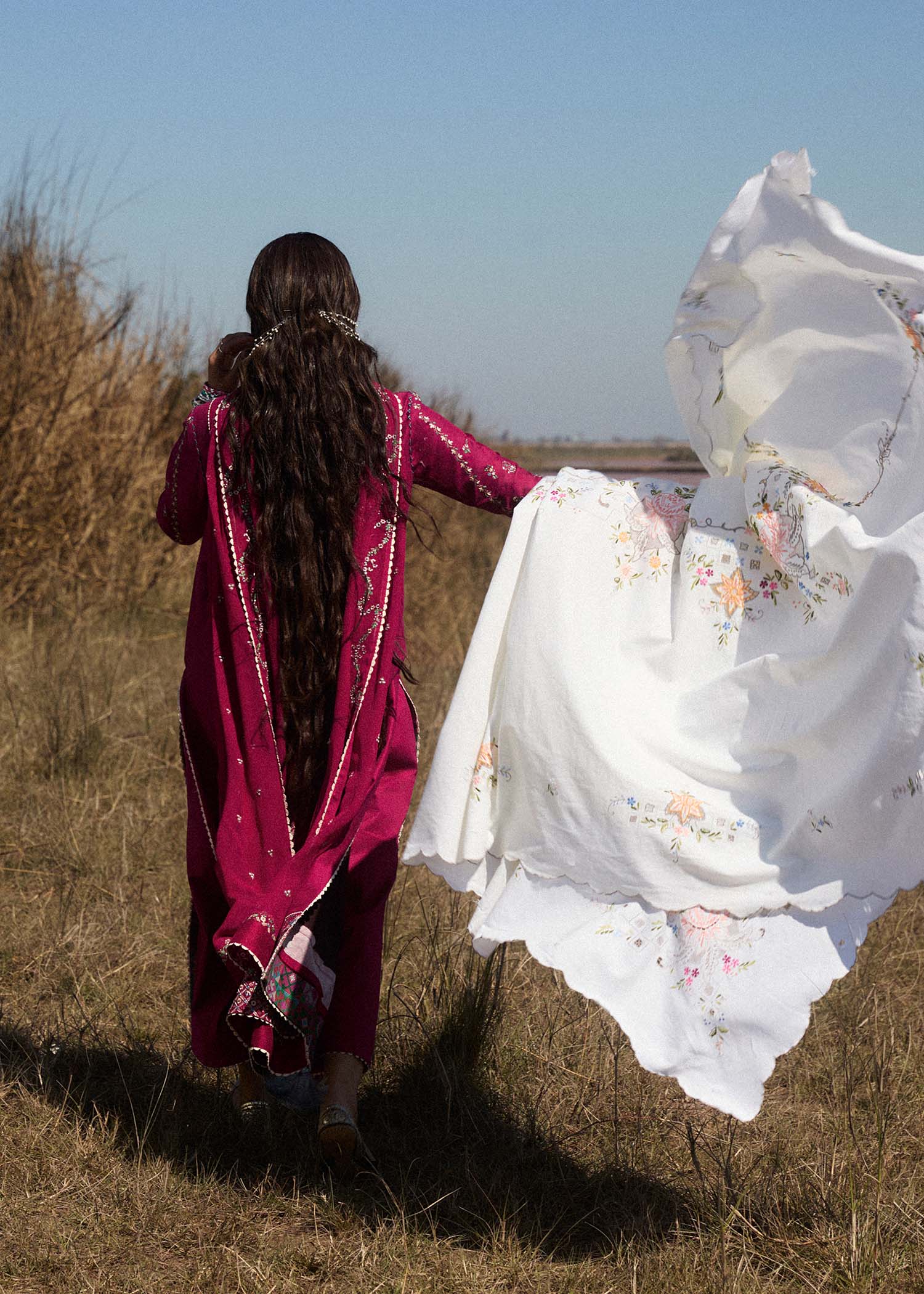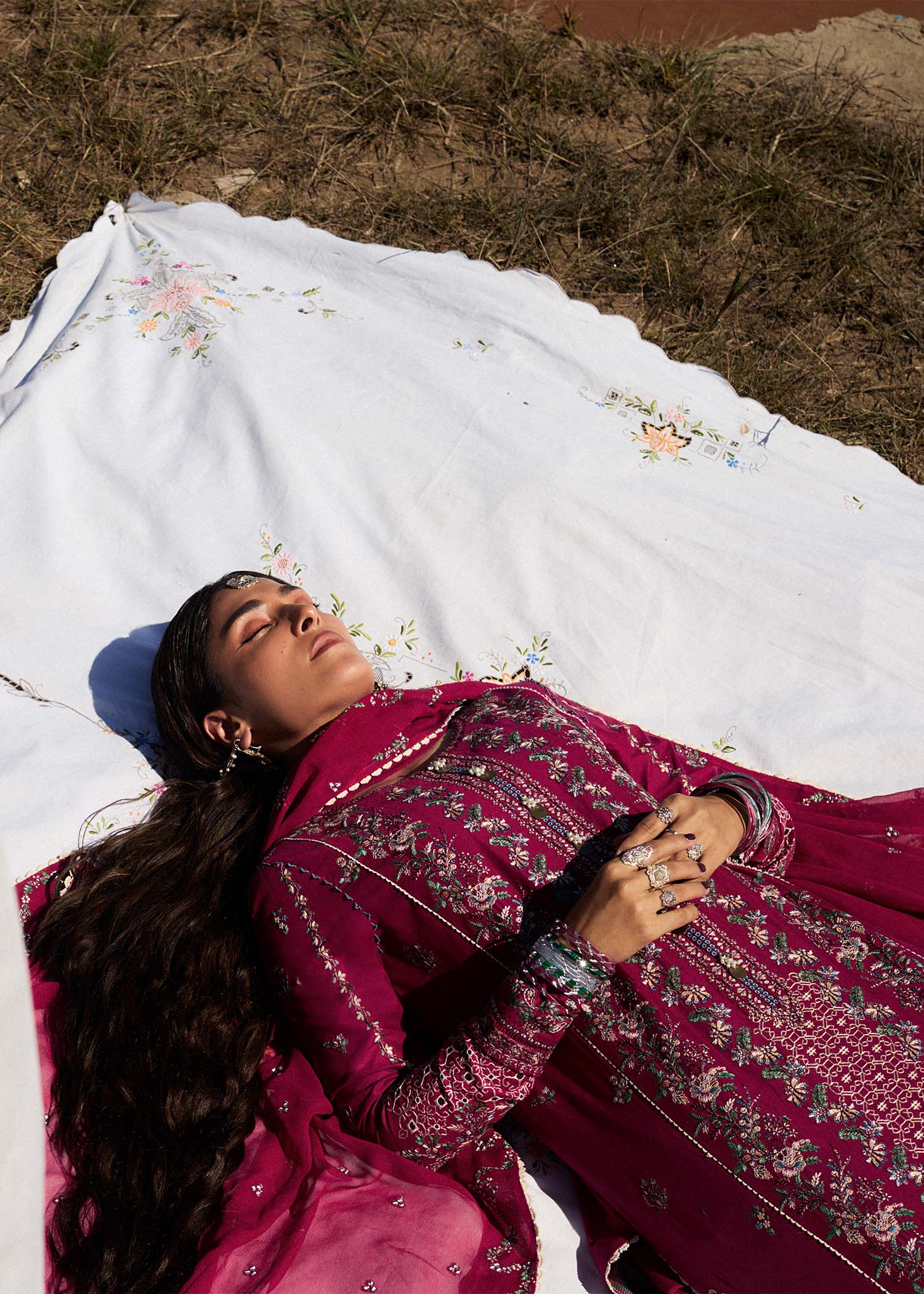 This is a beautifully embroidered hot pink lawn outfit with intricate detailing. The article consists of long fully embroidered lawn shirt featuring delicate floral patterns and traditional motifs in shades of gold, white, and blue. The embroidery runs vertically along the front, with heavily adorned borders at the hem and sleeves. The neckline is elegantly embellished, and the overall look is rich and festive. A plain matching hot pink culotte complementing the detailed shirt. An embroidered chiffon dupatta with minimal but elegant embellishments along the edges and corners, finished with small tassels for a refined touch. This ensemble is perfect for festive and semi-formal occasions, blending traditional charm with modern embroidery craftsmanship.