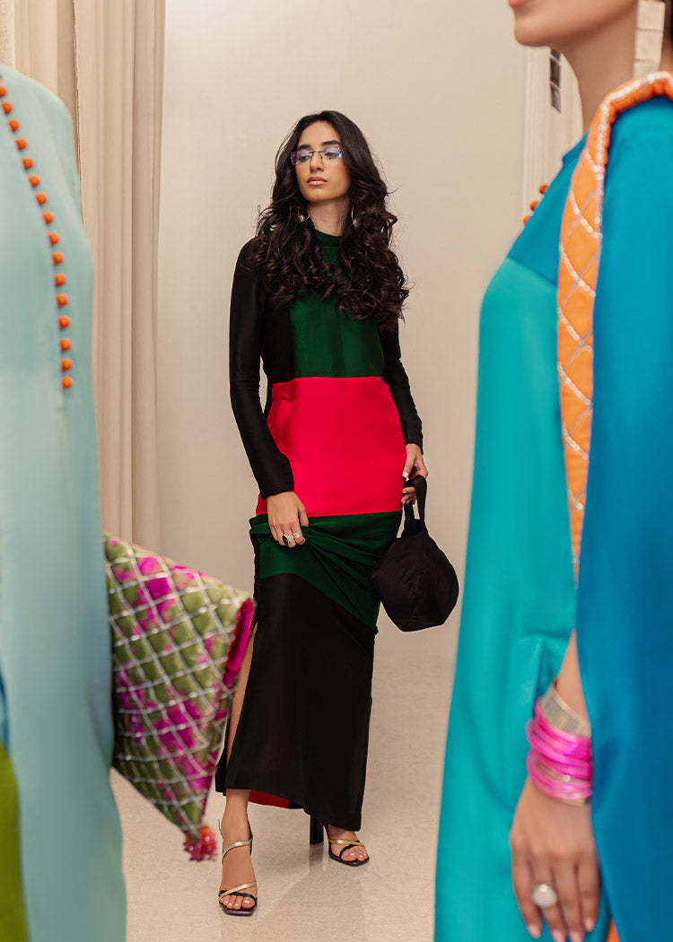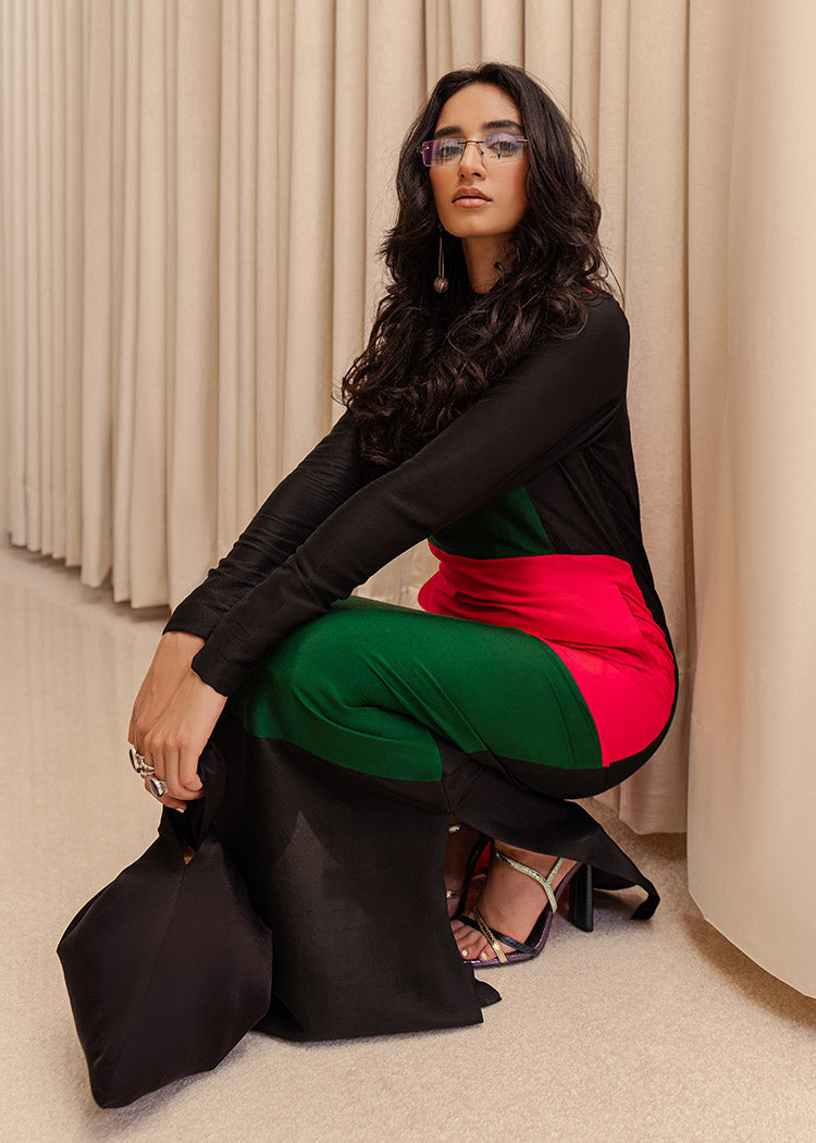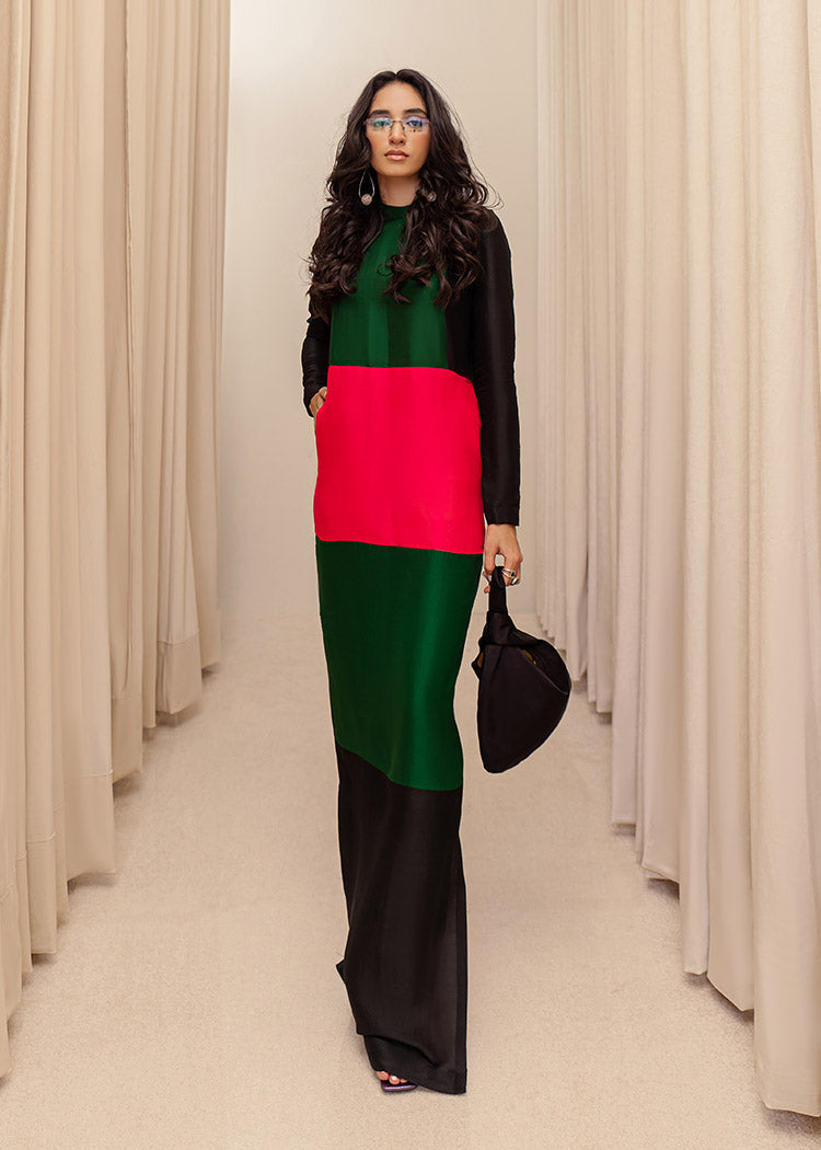 A sleek long floor length raw silk shirt with full black sleeves. The shirt has dark green, hot pink and black pieces of fabric attached together to give an over all smooth satiny look along with short slits on the sides.