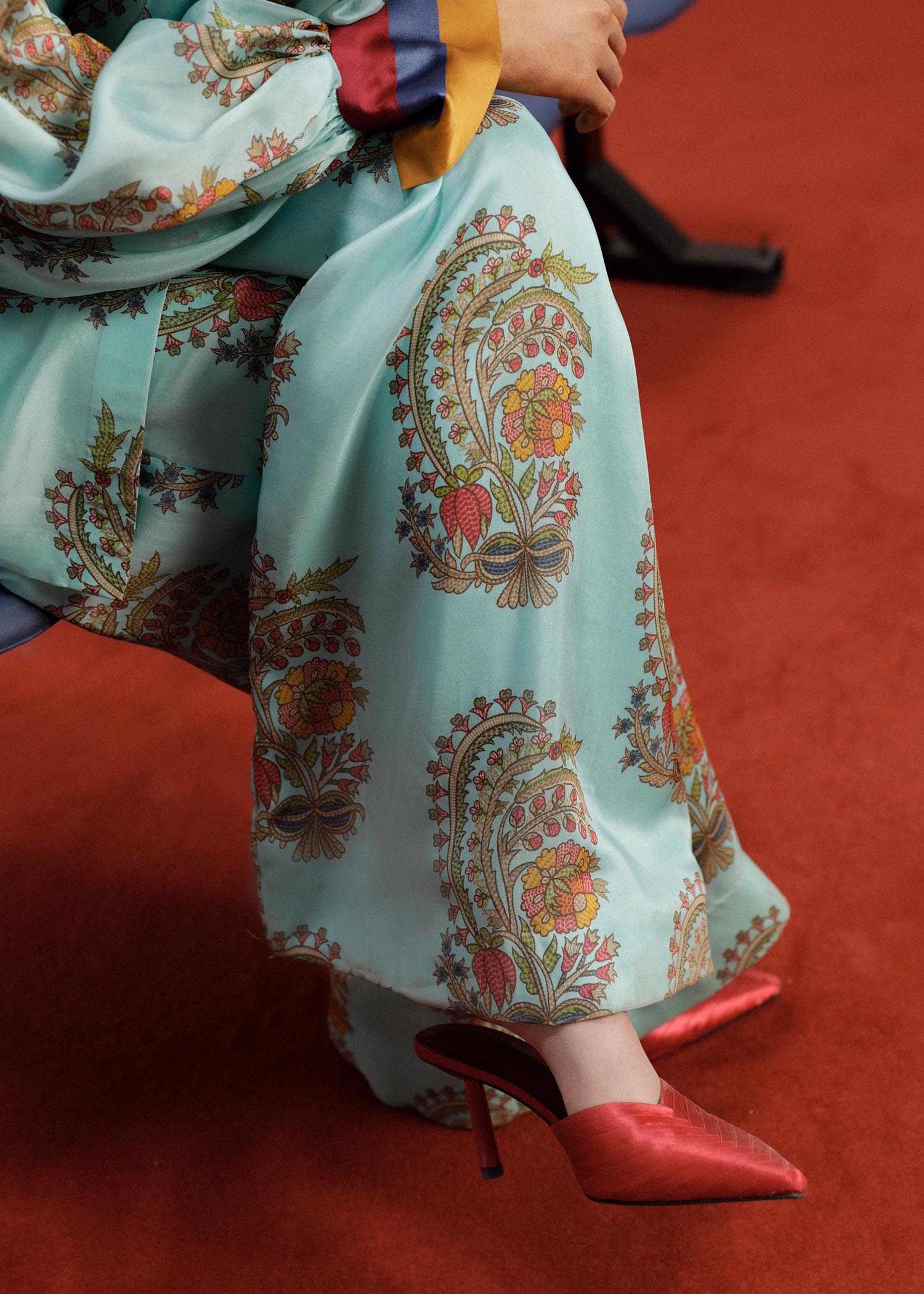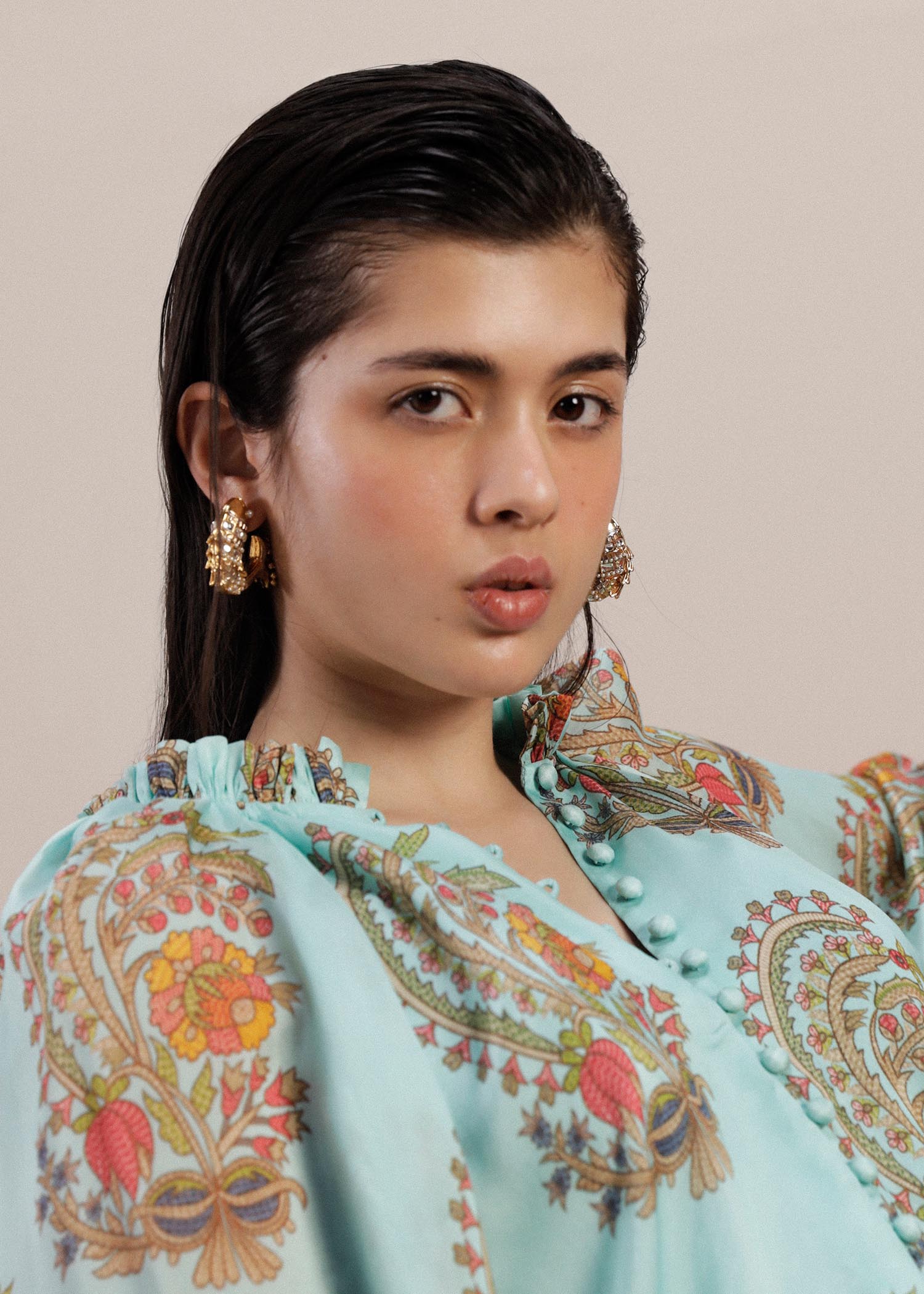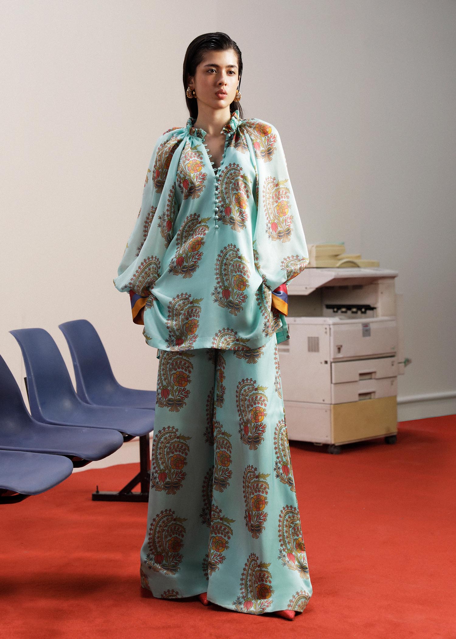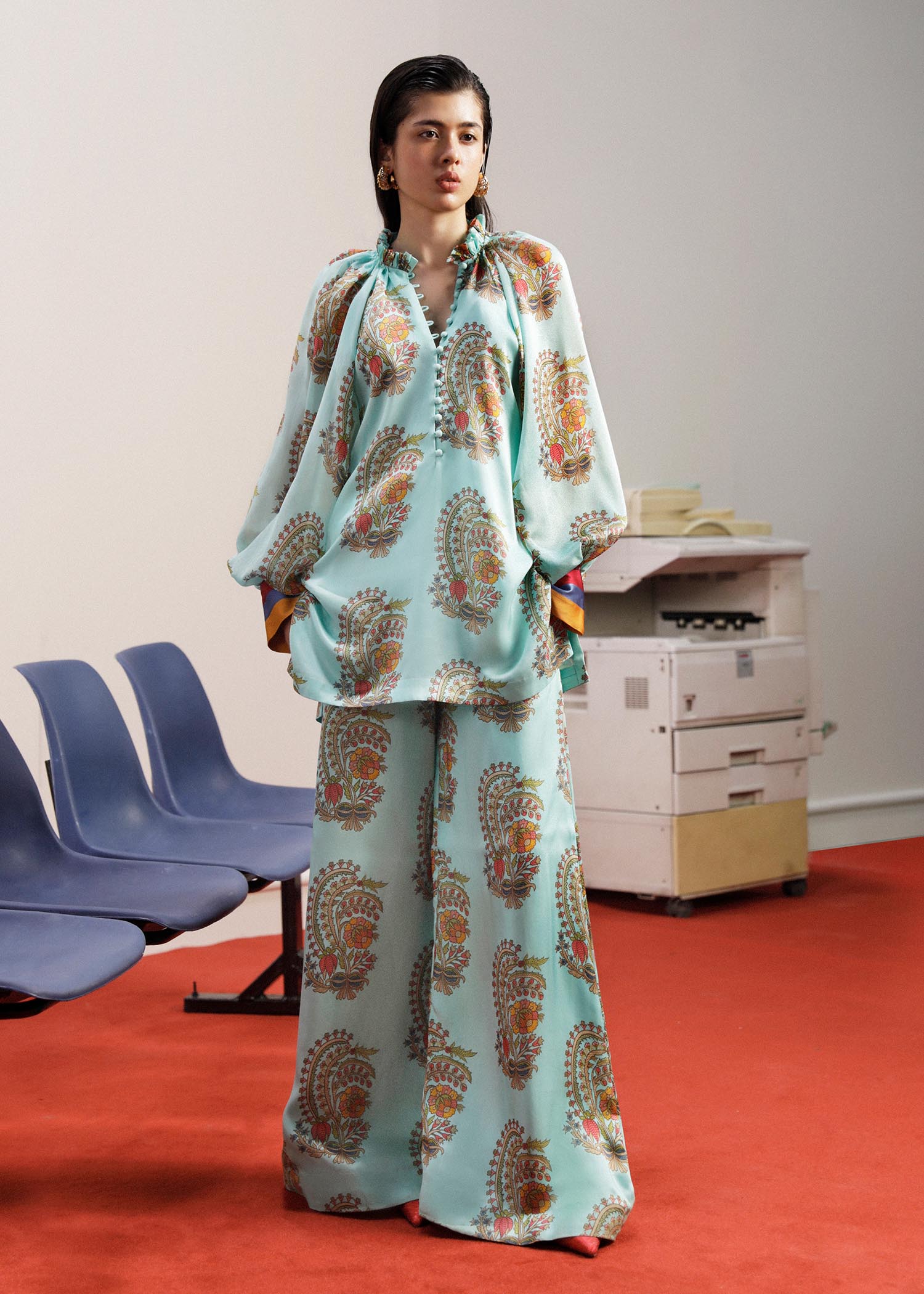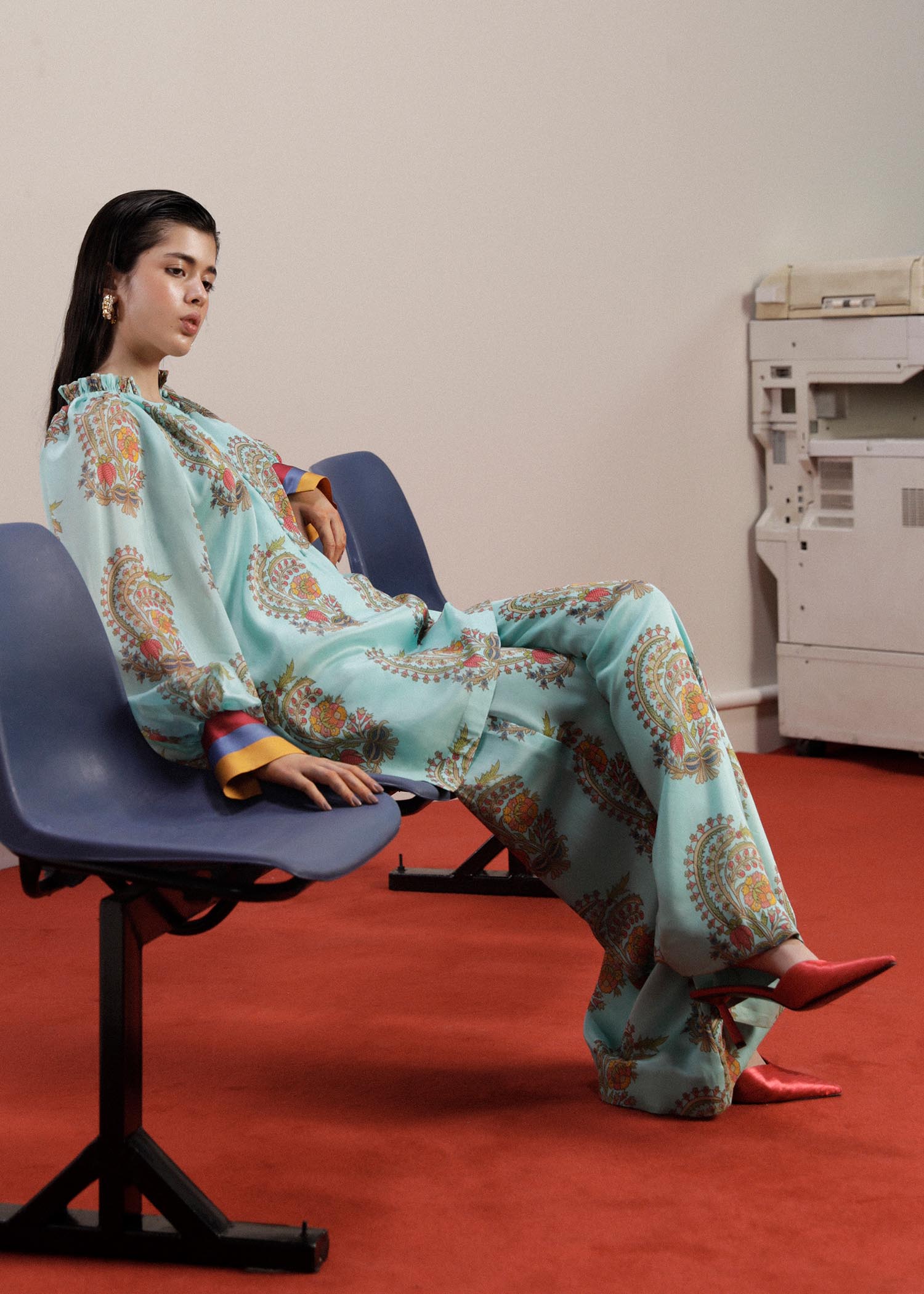 A decent ice blue matching separates set that has ravelled floral print spread all over the silk silhouette. The neckline has loop buttons descending to the mid of the shirt. Its sleeves have satin silk yellow, blue and red stripes on the cuffs.