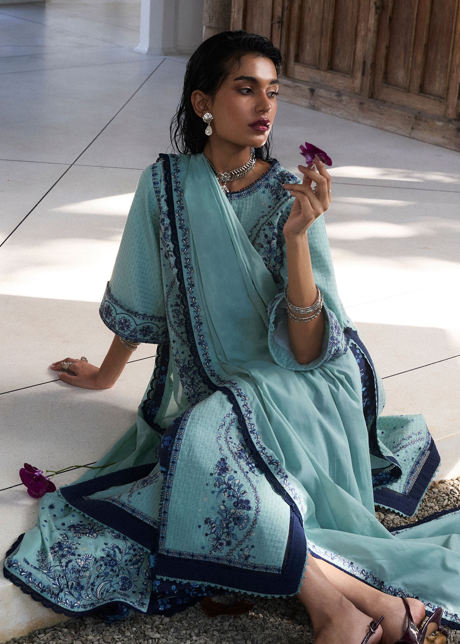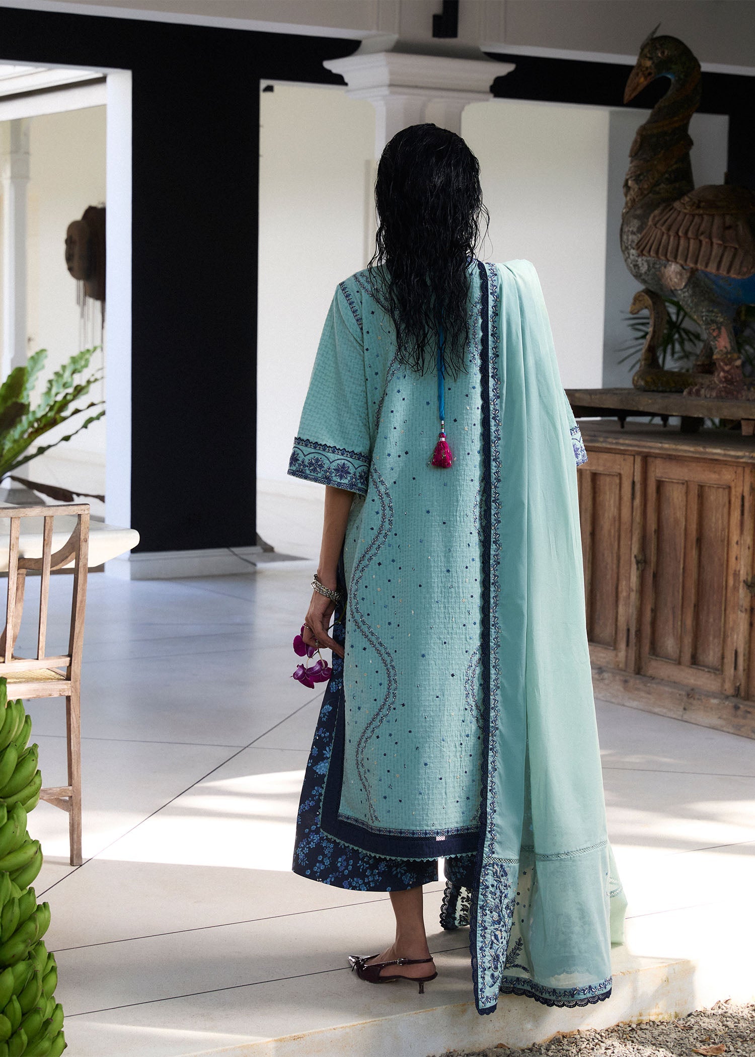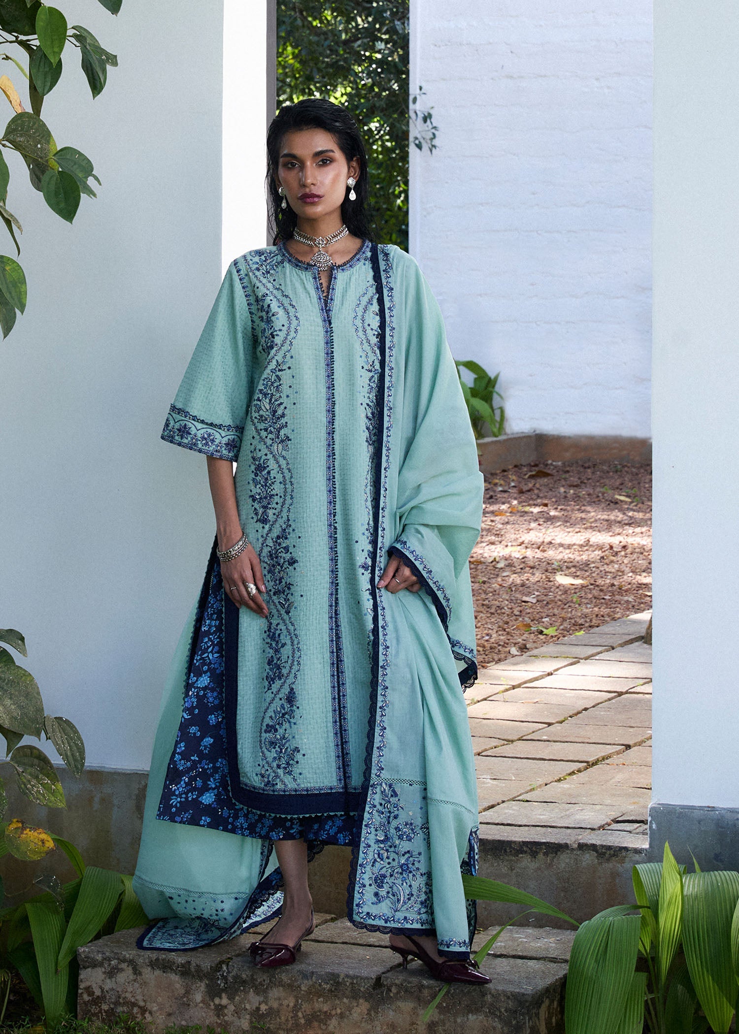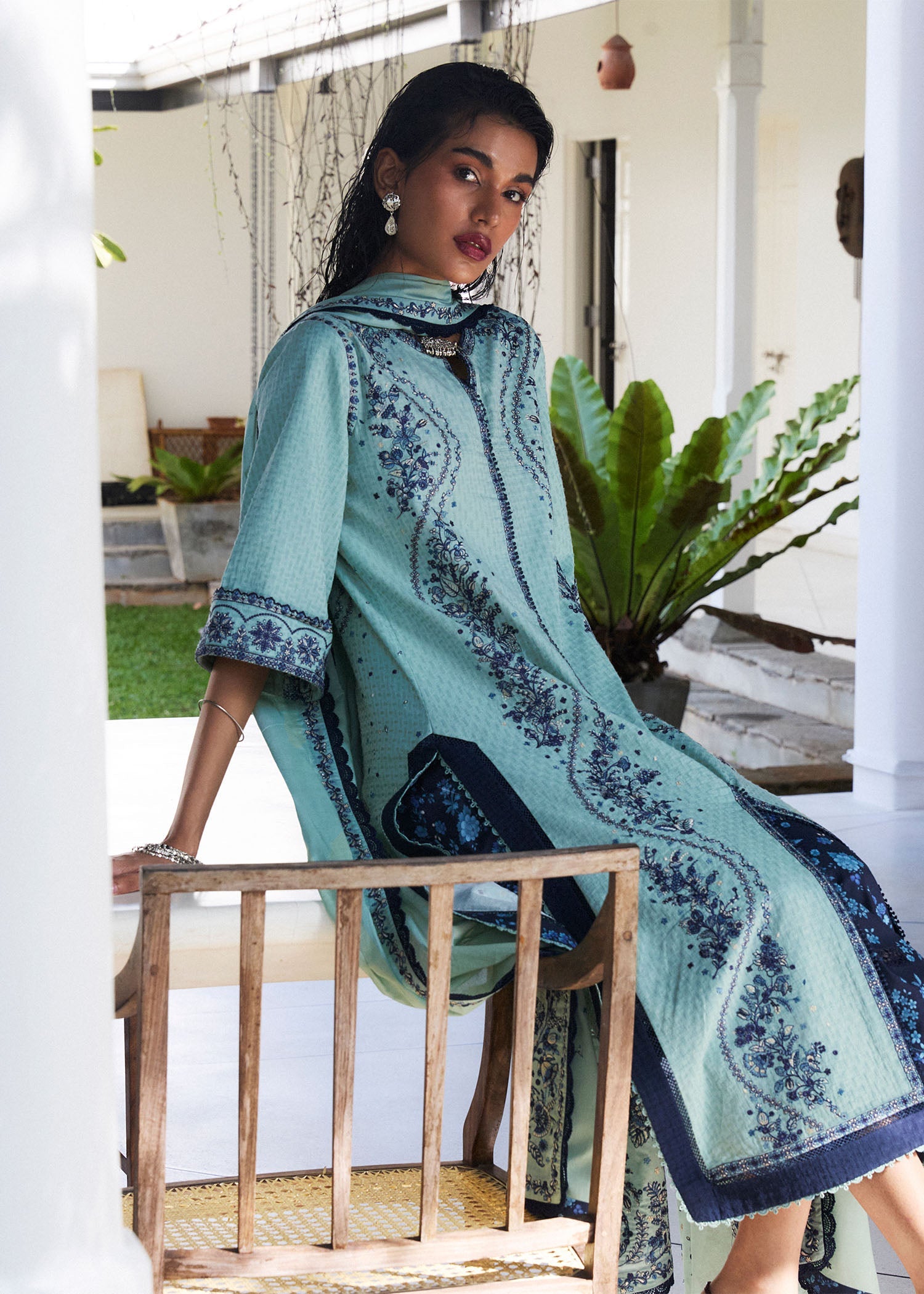 Stay cool and stylish in this ice blue jacquard outfit, featuring elegant navy blue embroidery on a breathable fabric. Paired with a delicately embroidered lawn dupatta and standout printed culottes, this look blends comfort with effortless charm. Perfect for elevating your everyday style.