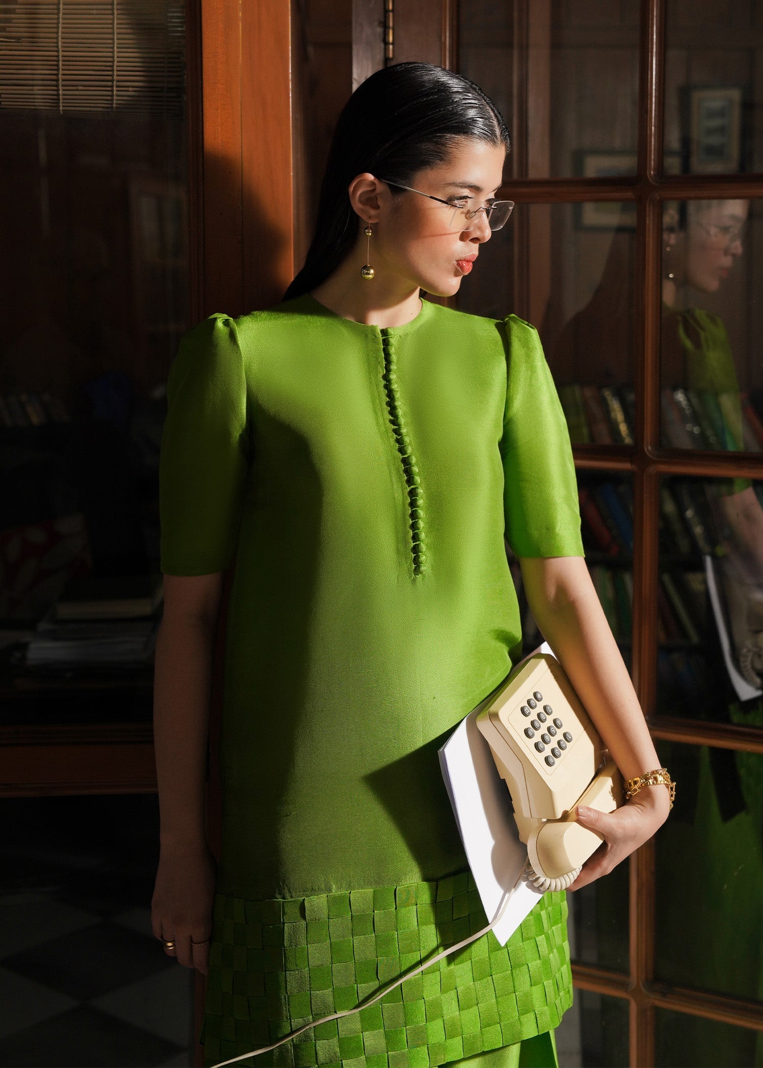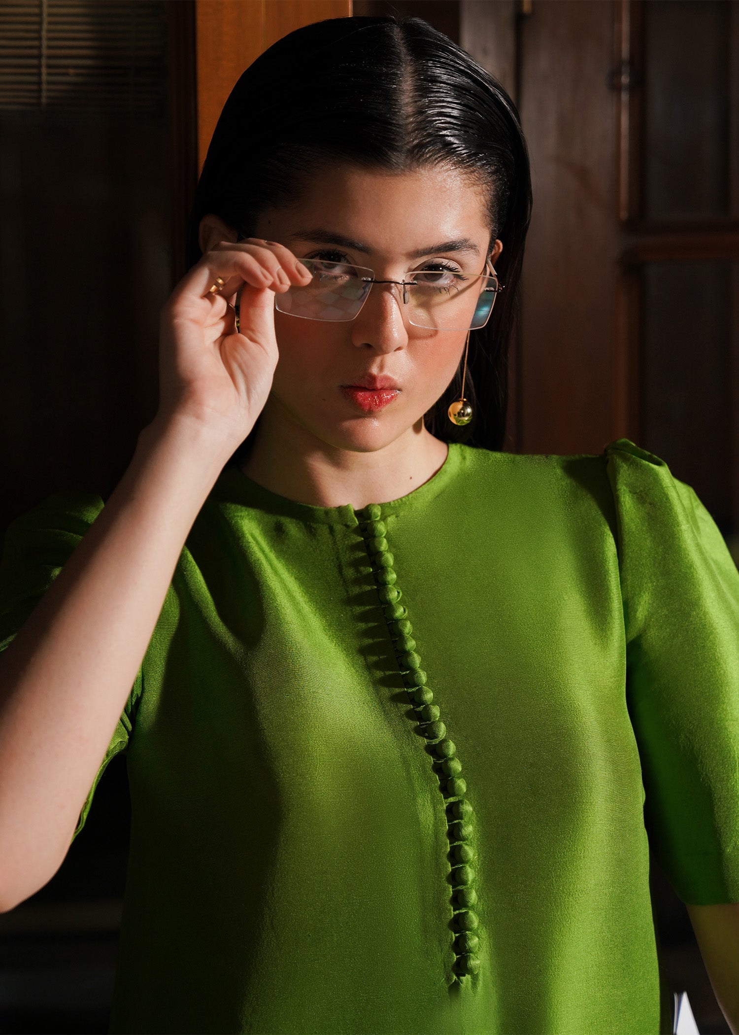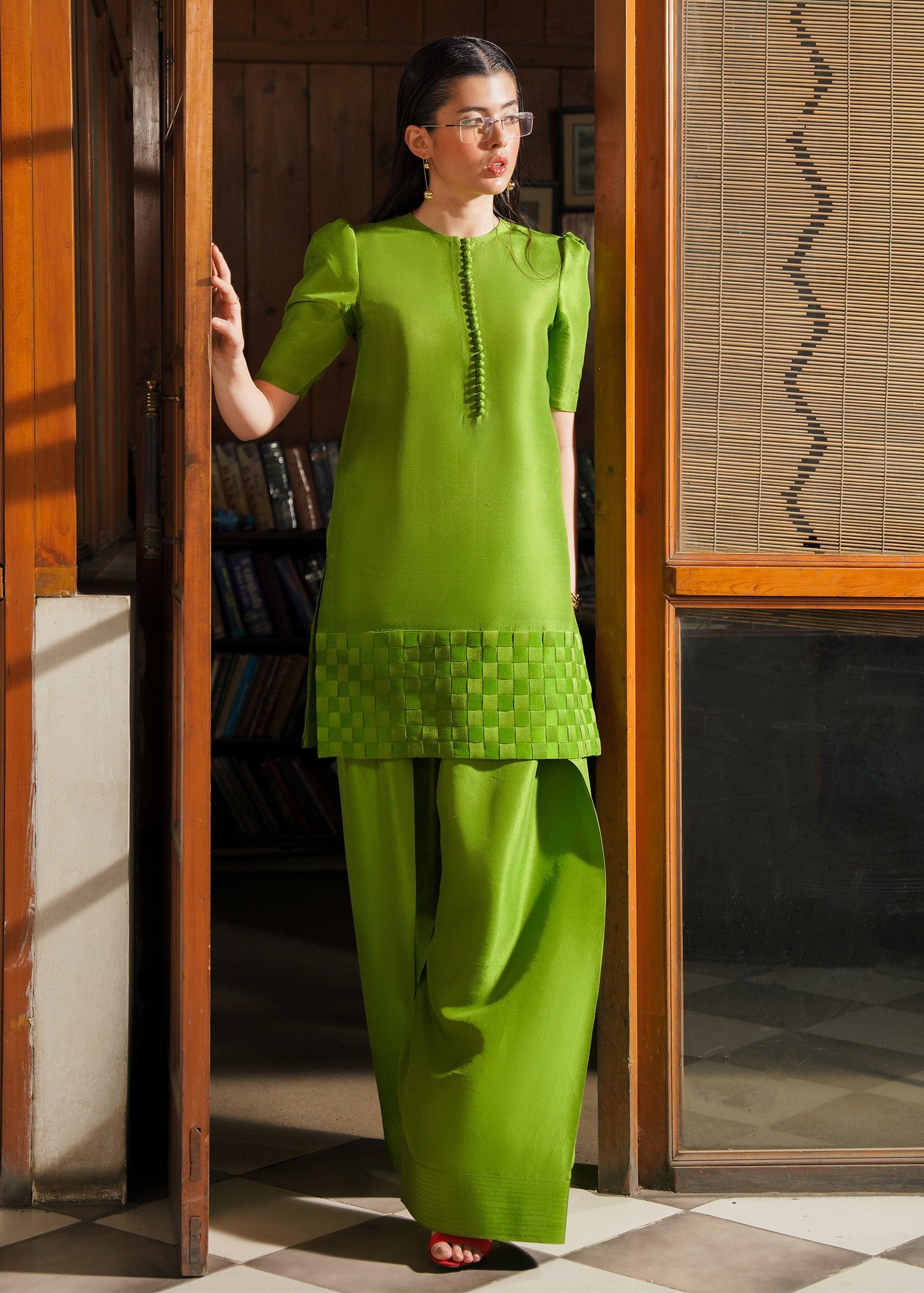 A green raw silk shirt with loop buttons detail on the crew neckline and puff sleeves with weaving details on the hem in same and darker shade of green which is giving it a chic look. It is paired with same green shalwar.