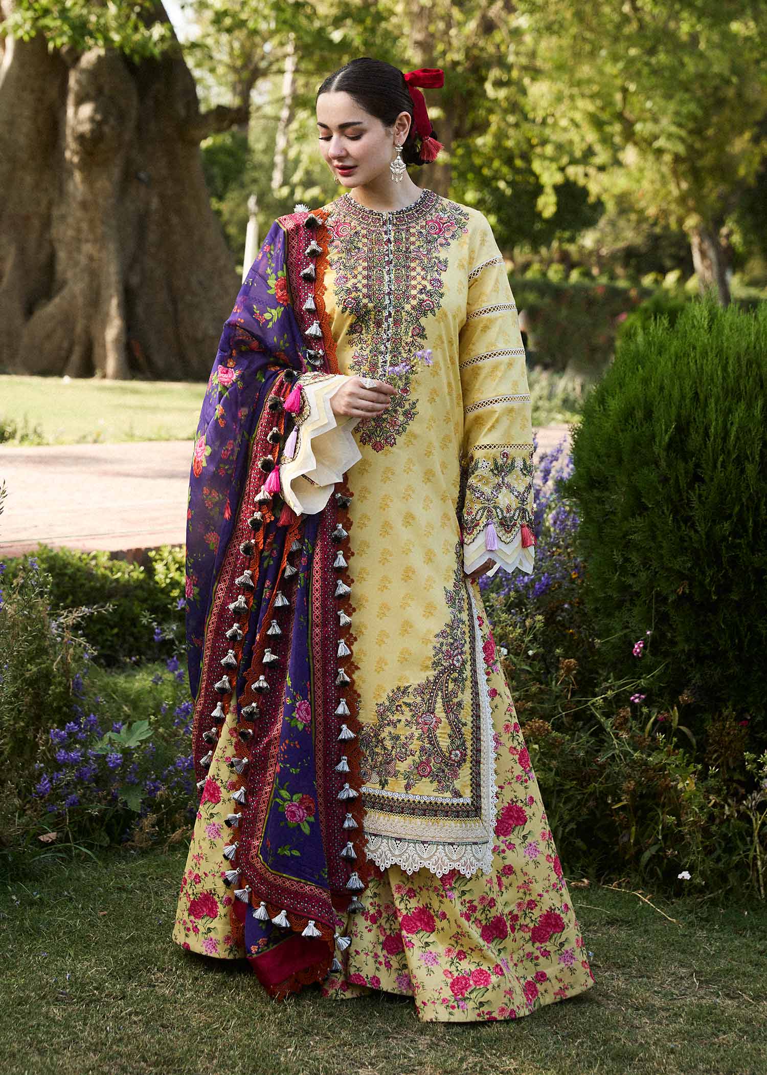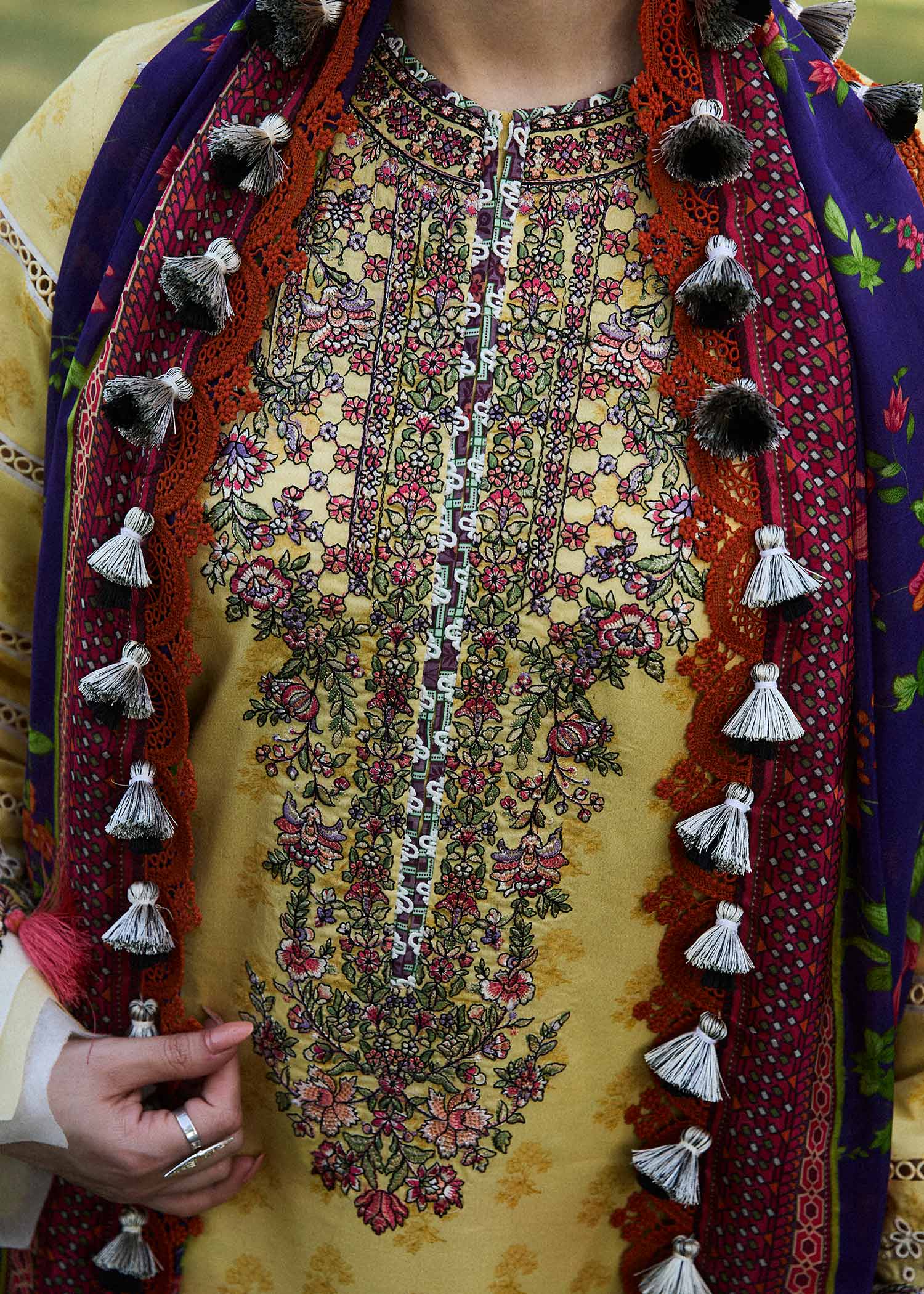 This pastel yellow summery resplendant shirt with complex floral embroideries merging with intricate details creating an amazing vibe. Interesting contrast of pink in embroideries adds a glimpse of freshness to the floral arrangement. Adding the printed silk dupatta with floral print. Ivory trouser perfectly compliments this light summer palette.