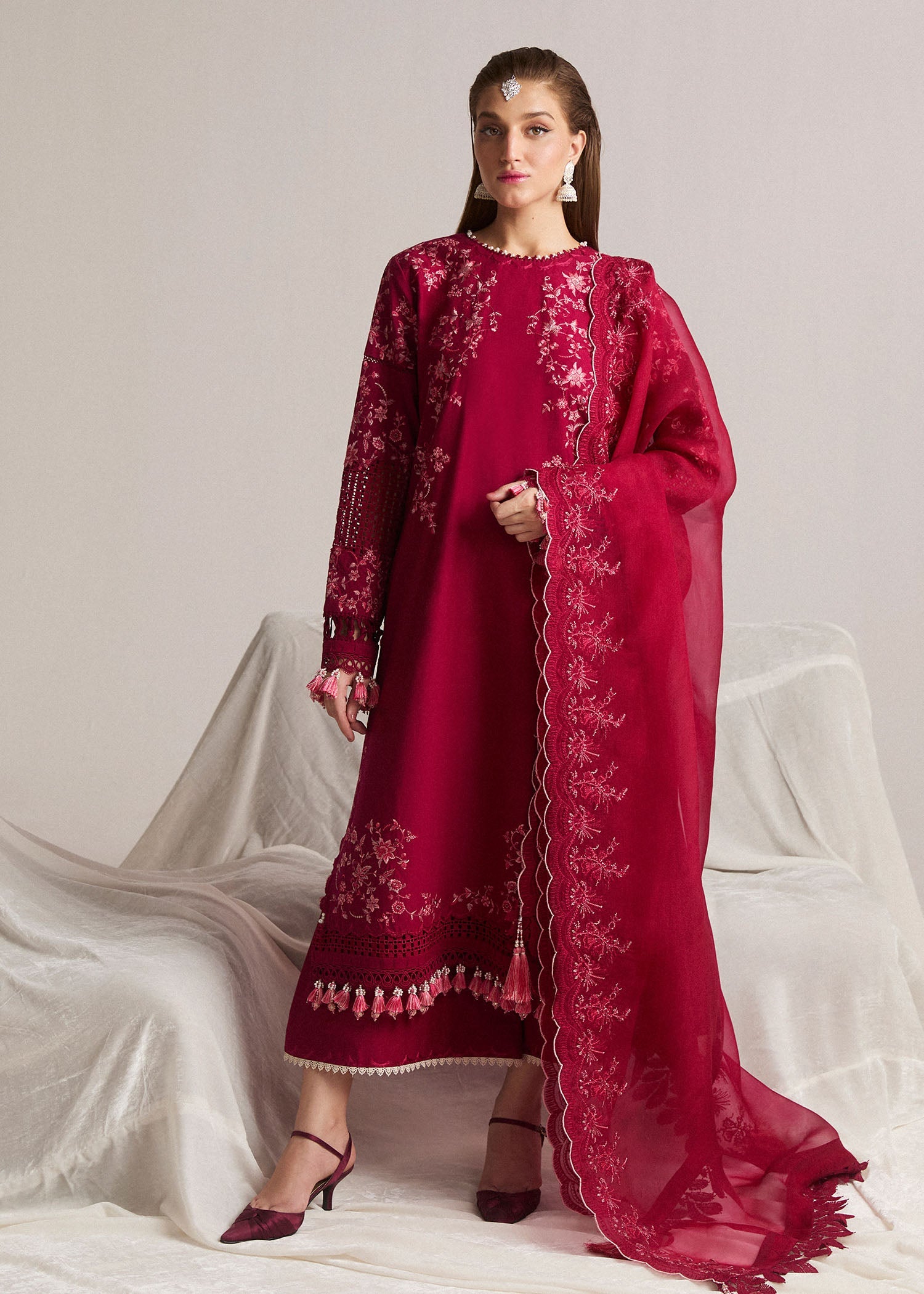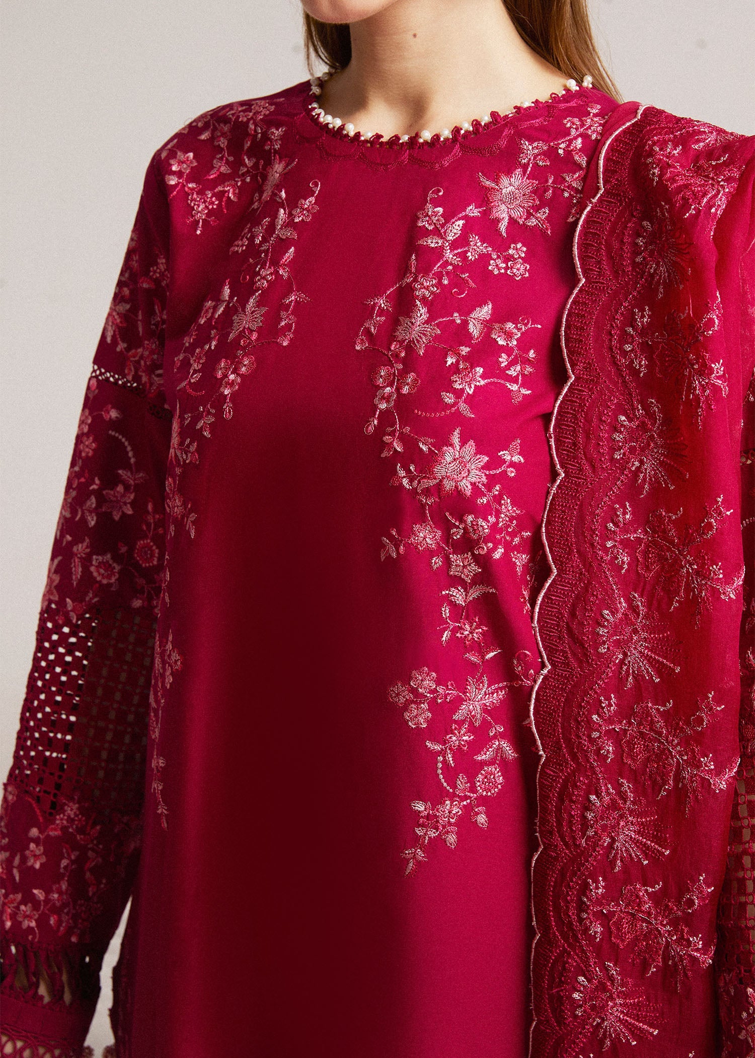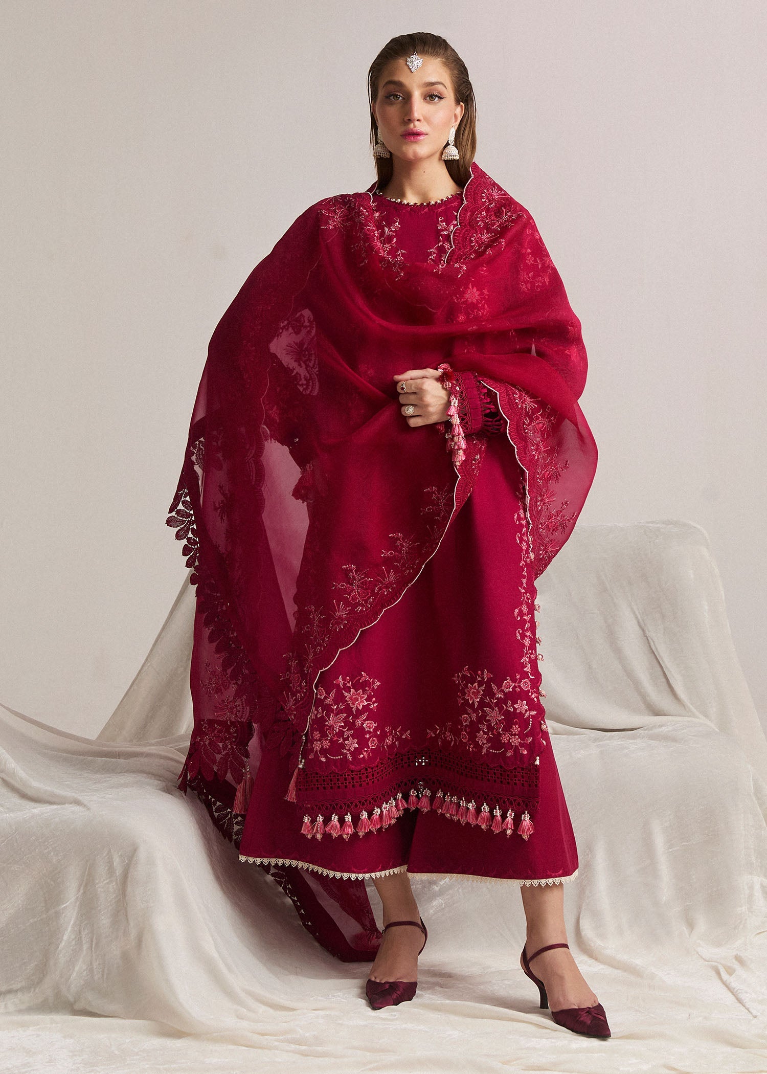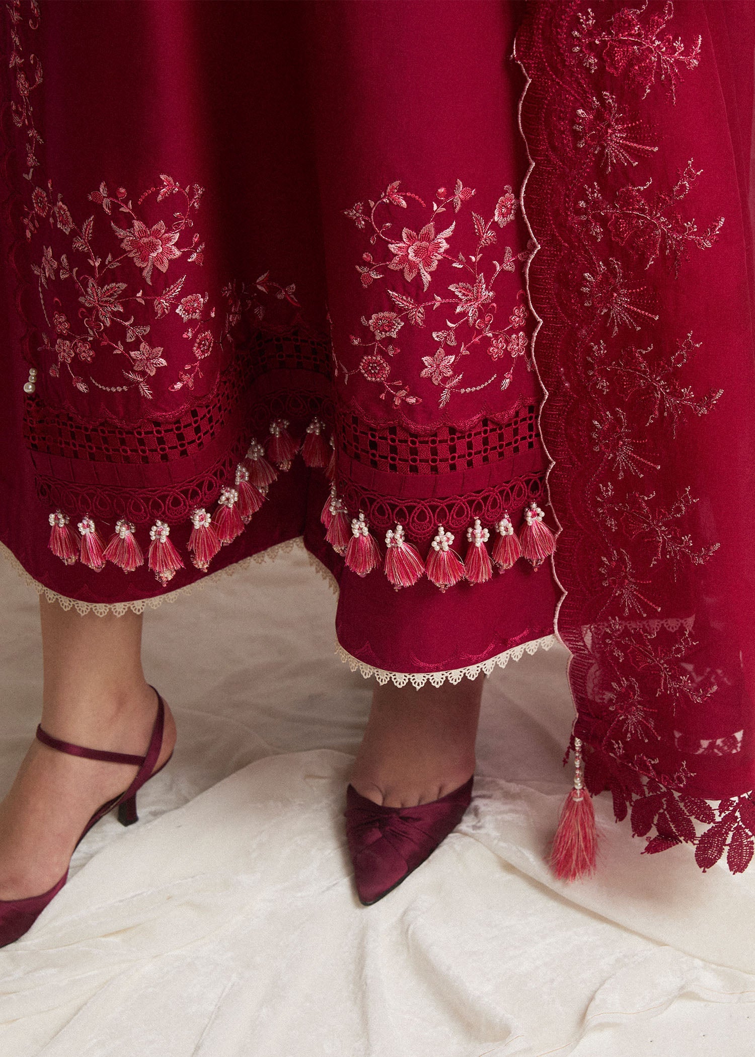 Embrace the elegance of summer season with this maroon ensemble, adorned with intricate floral embroidery. Paired with Same color dyed shalwar and a sublime organza embroidered dupatta, it's a timeless ode to floral beauty.
