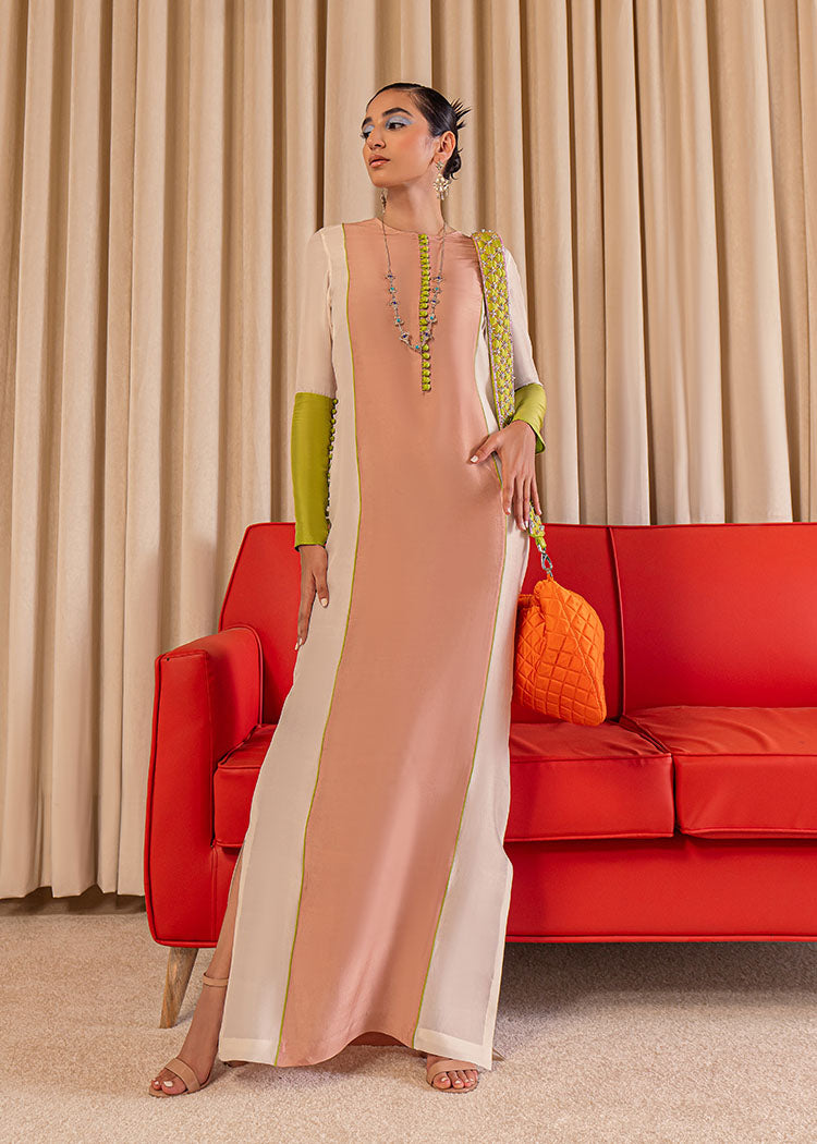 A long floor length raw silk shirt with peach panel in the mid front and ivory panels on the sides along with ivory sleeves and green details from middle to the wrists. The shirt also has side slits and loop buttons descending from the neck giving it a perfect chic look.