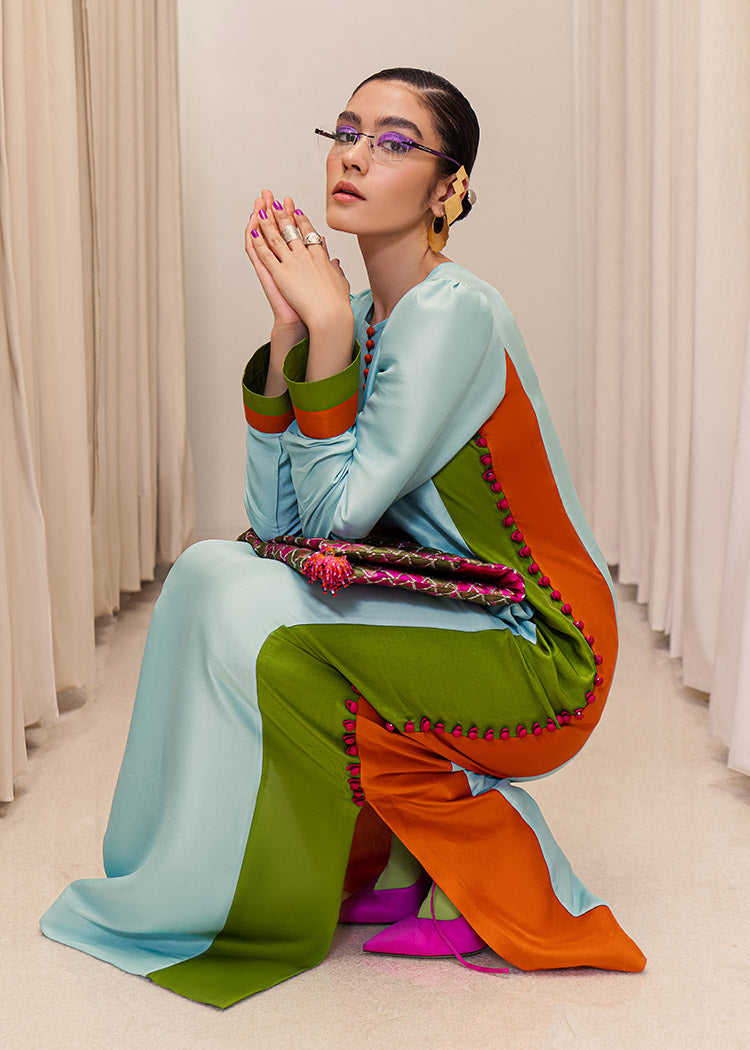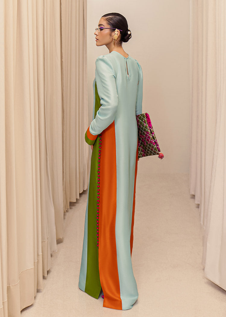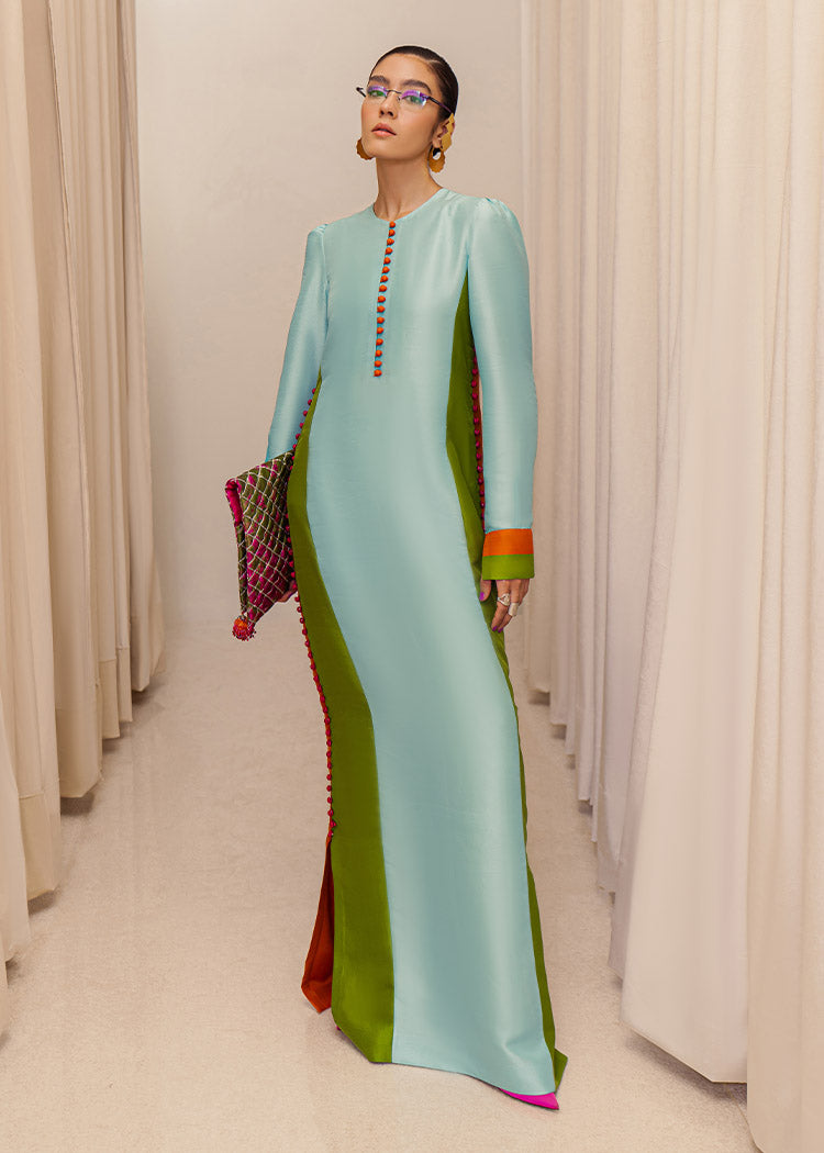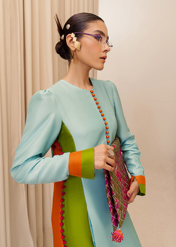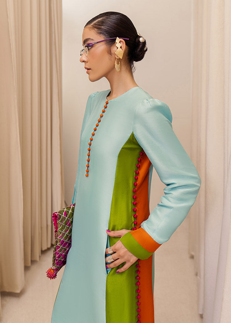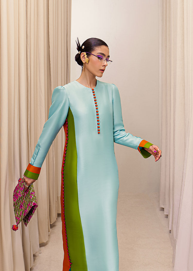 A long floor length ice blue shirt the sides of the shirt a detailed with long green and orange panels along with loop buttons descending down till the slits. It also has orange and green detail on the cuffs of the shirt, the shirt has short slits on the sides.