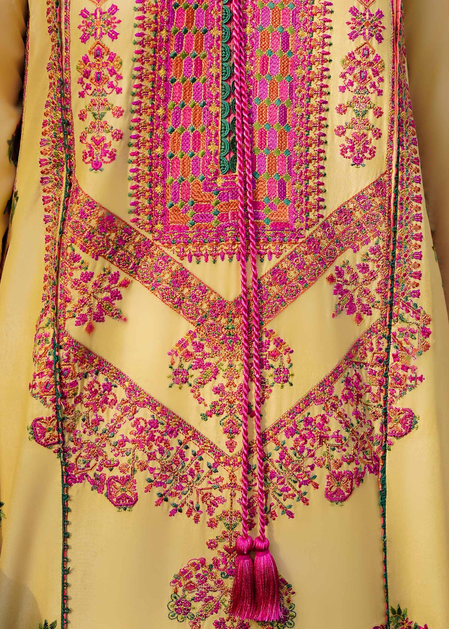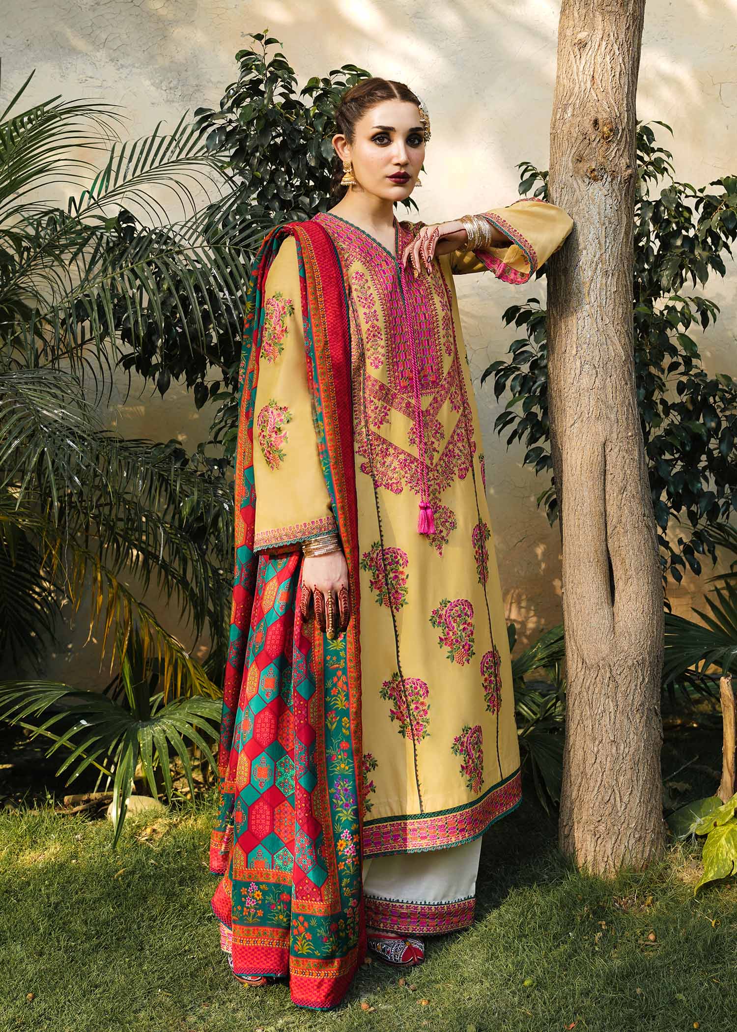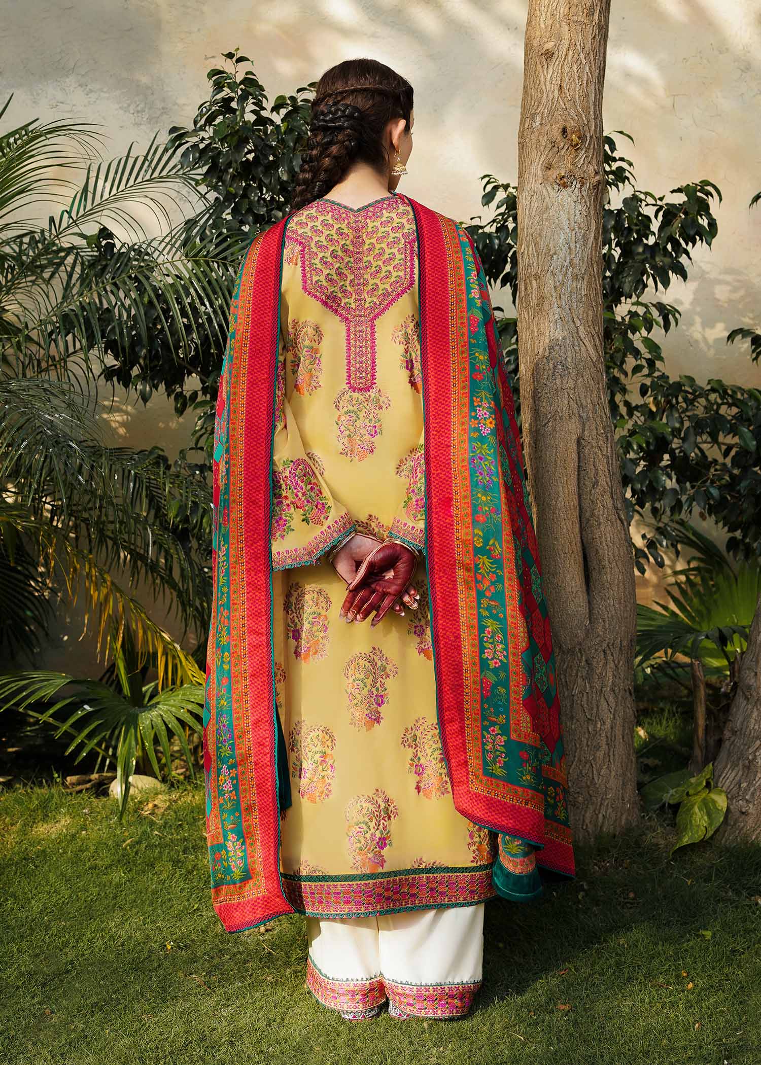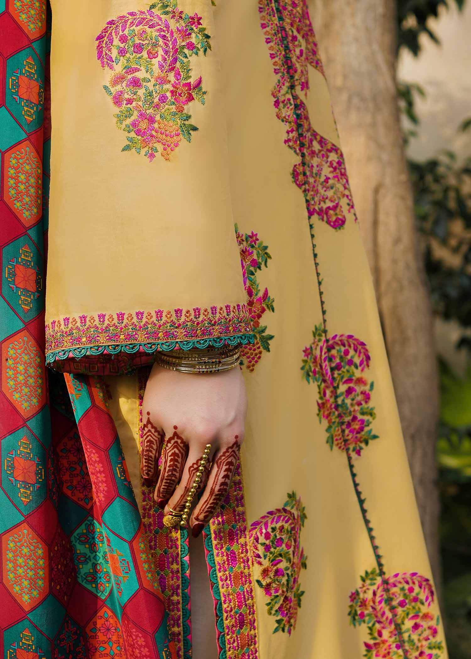 A gorgeous curation of traditional Mughal floral motifs combined with intricate tribal neckline, create a whimsical symphony of colors. A printed silk dupatta paired with ivory shalwar create a swoon worthy summer outfit.
