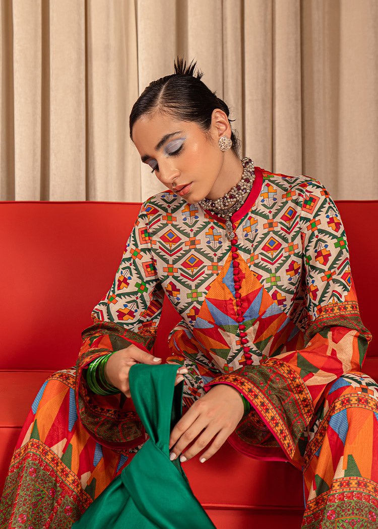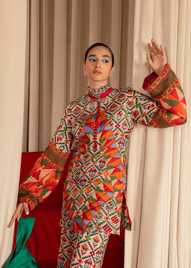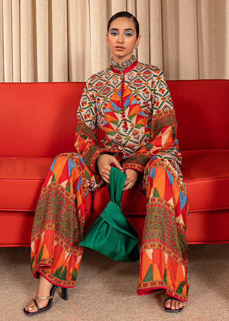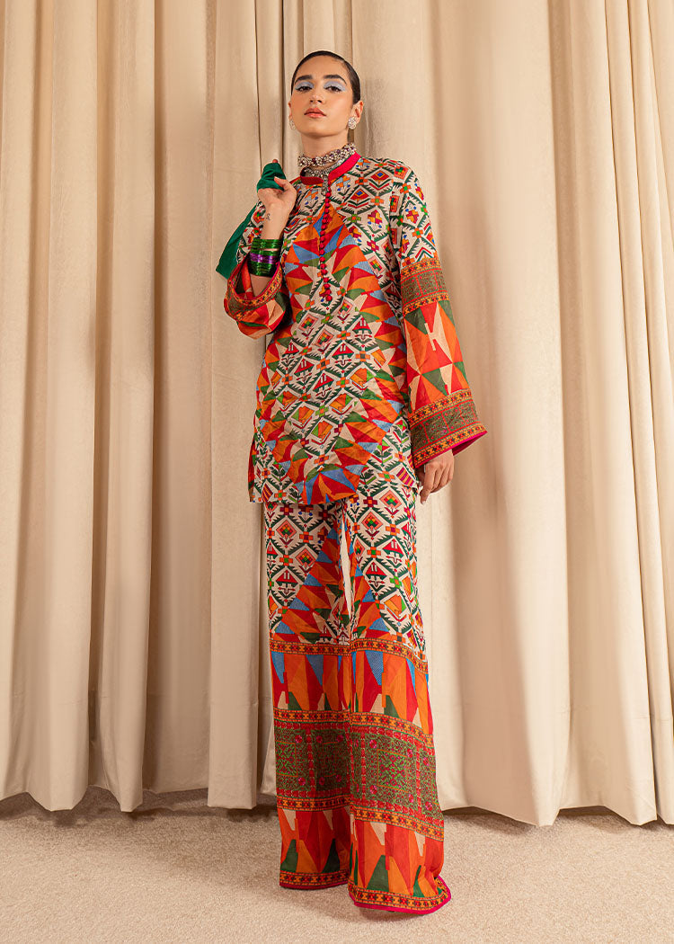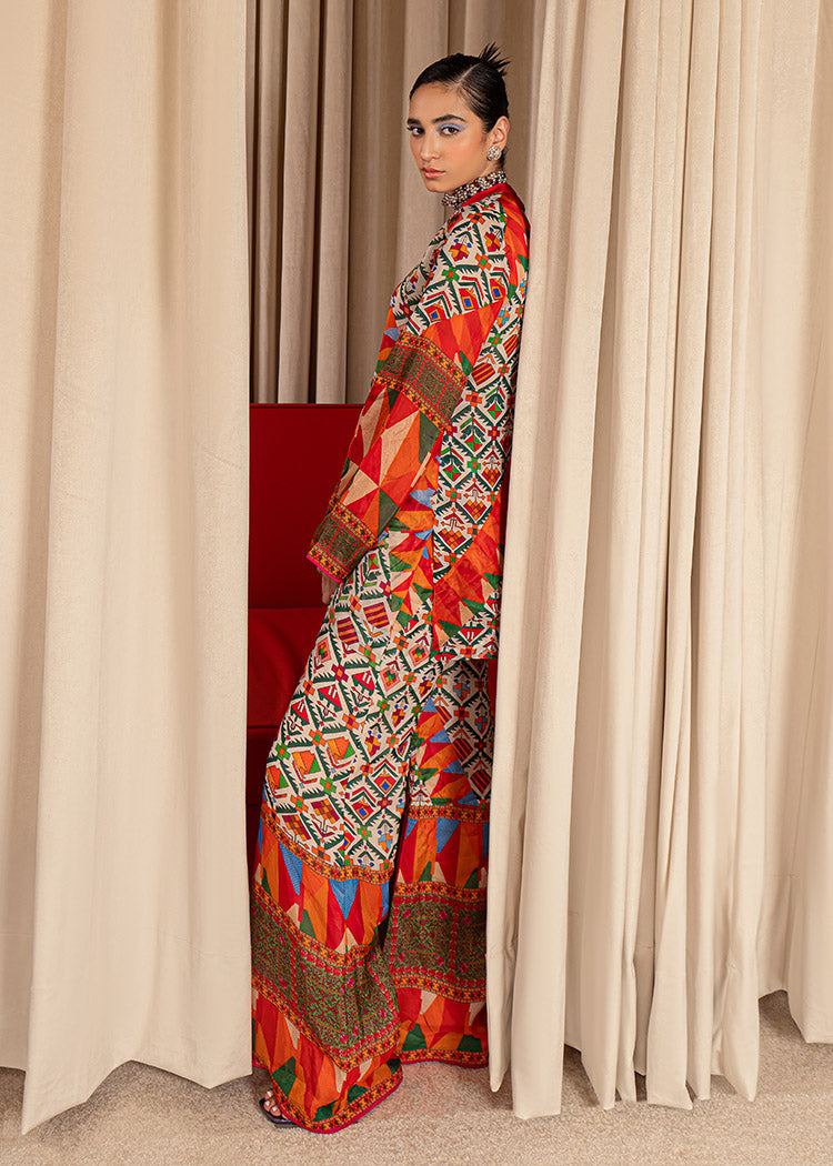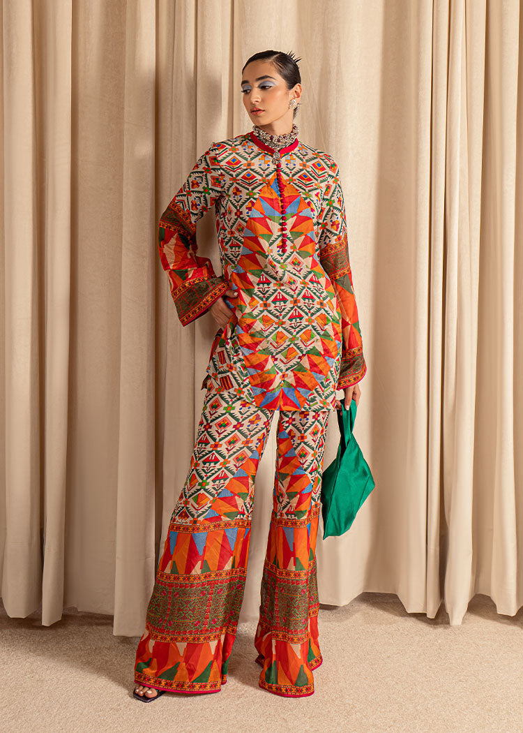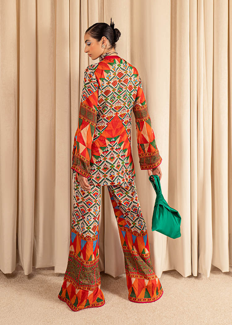 A classy tribal printed co-ord set that has phenomenal details of red satin on the hem and edges of the shirt, sleeves as well as the palazzo pants.
