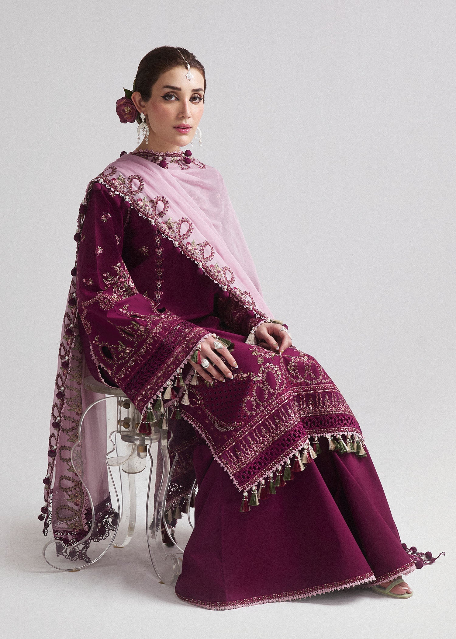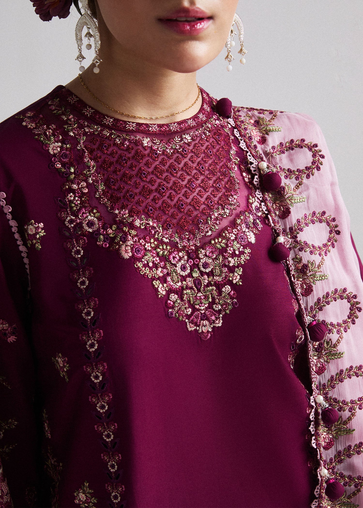 A ravishing plum ensemble including a beautiful Lawn shirt front and sleeve with detailing in embroidery .paired with dyed trouser. Contrast color embroidered Chiffon Dupatta balanced the complete look.