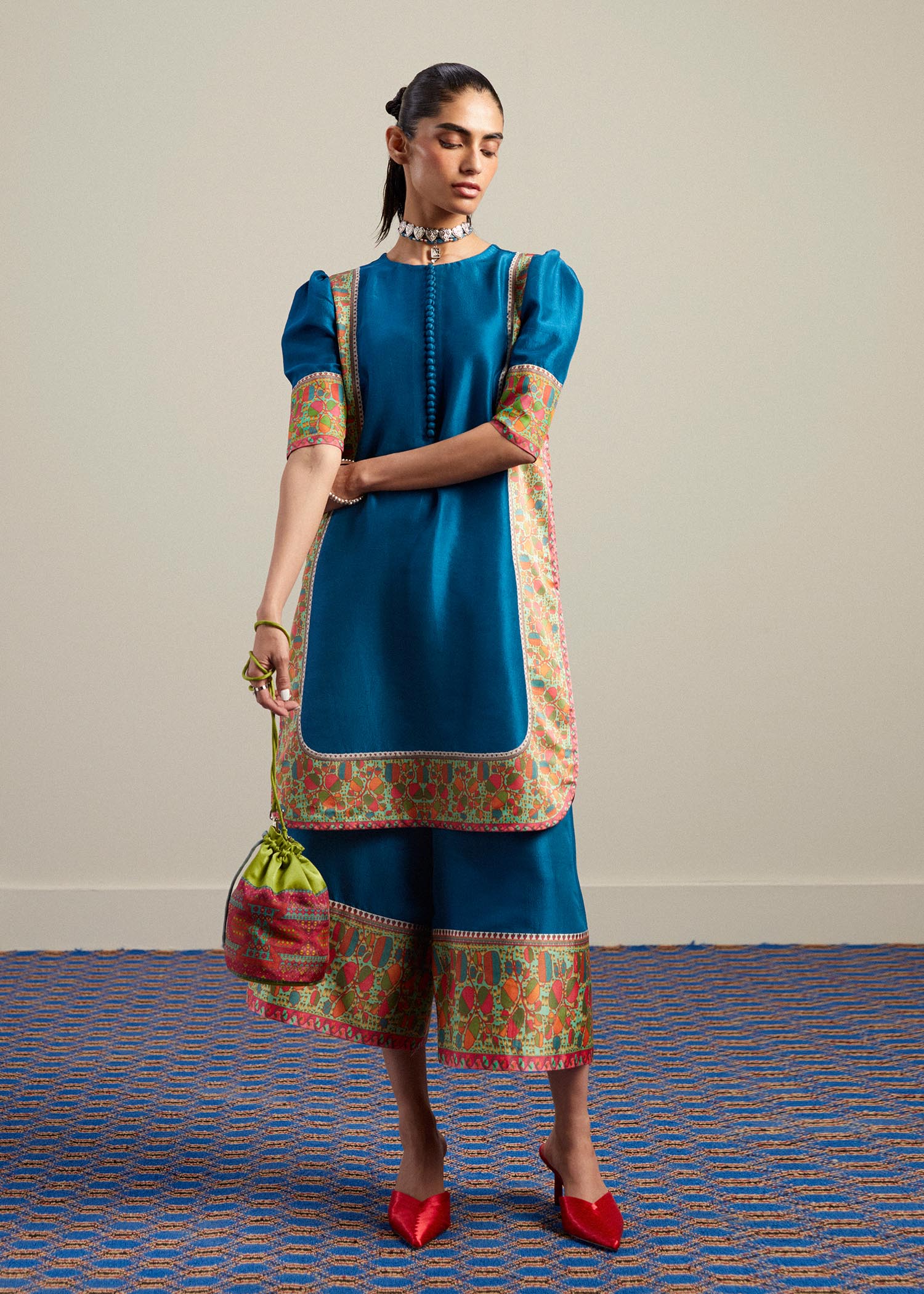An outstanding set including a teal raw silk shirt with printed borders aligned all of the way down to hem of the shirt and sleeves. The neckline has classic loop buttons descending down to the middle of the shirt. It is further paired with teal raw silk culottes with similarly printed borders on the hem.