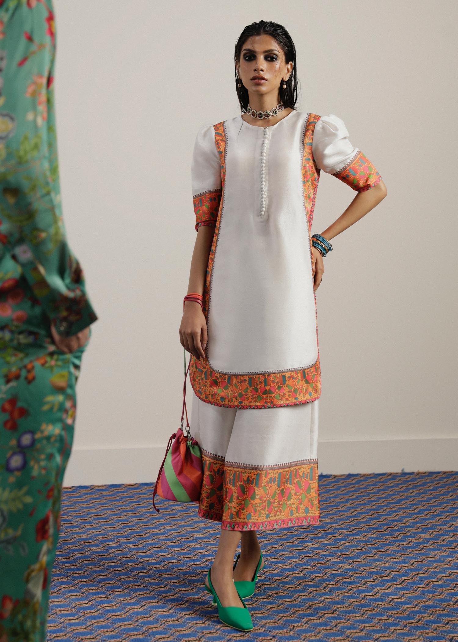 An outstanding set including an ivory raw silk shirt with printed orange borders aligned all of the way down to hem of the shirt and sleeves. The neckline has classic loop buttons descending down to the middle of the shirt. It is further paired with ivory raw silk culottes with similarly printed borders on the hem.