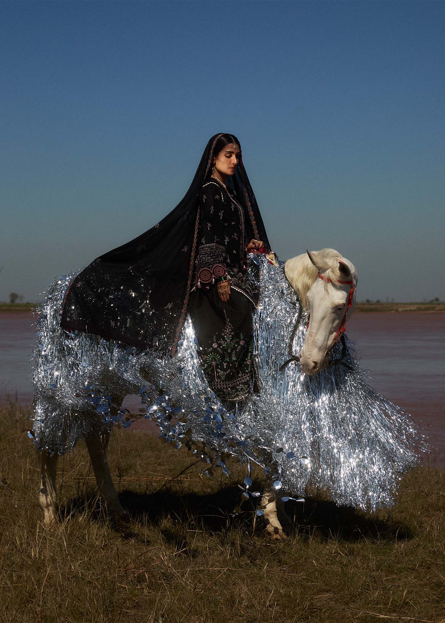 This is a stunning 3-piece embroidered dress featuring intricate detailing and an elegant design. The outfit consists of long black tunic with exquisite embroidery in pink, green, and white tones. The floral and botanical patterns are concentrated around the neckline, center, and hem, enhancing its beauty. The sleeves are wide with detailed boring embroidery and delicate tassels, adding a touch of sophistication. Matching black trousers with subtle embroidered detailing along the hem, ensuring a cohesive and stylish look. The set includes a beautiful organza technique lawn dupatta, which complements the embroidery on the outfit. It has tassel embellishments, making it perfect for festive or formal occasions. It’s ideal for cultural events, celebrations, or evening gatherings also perfect choice for Eid.