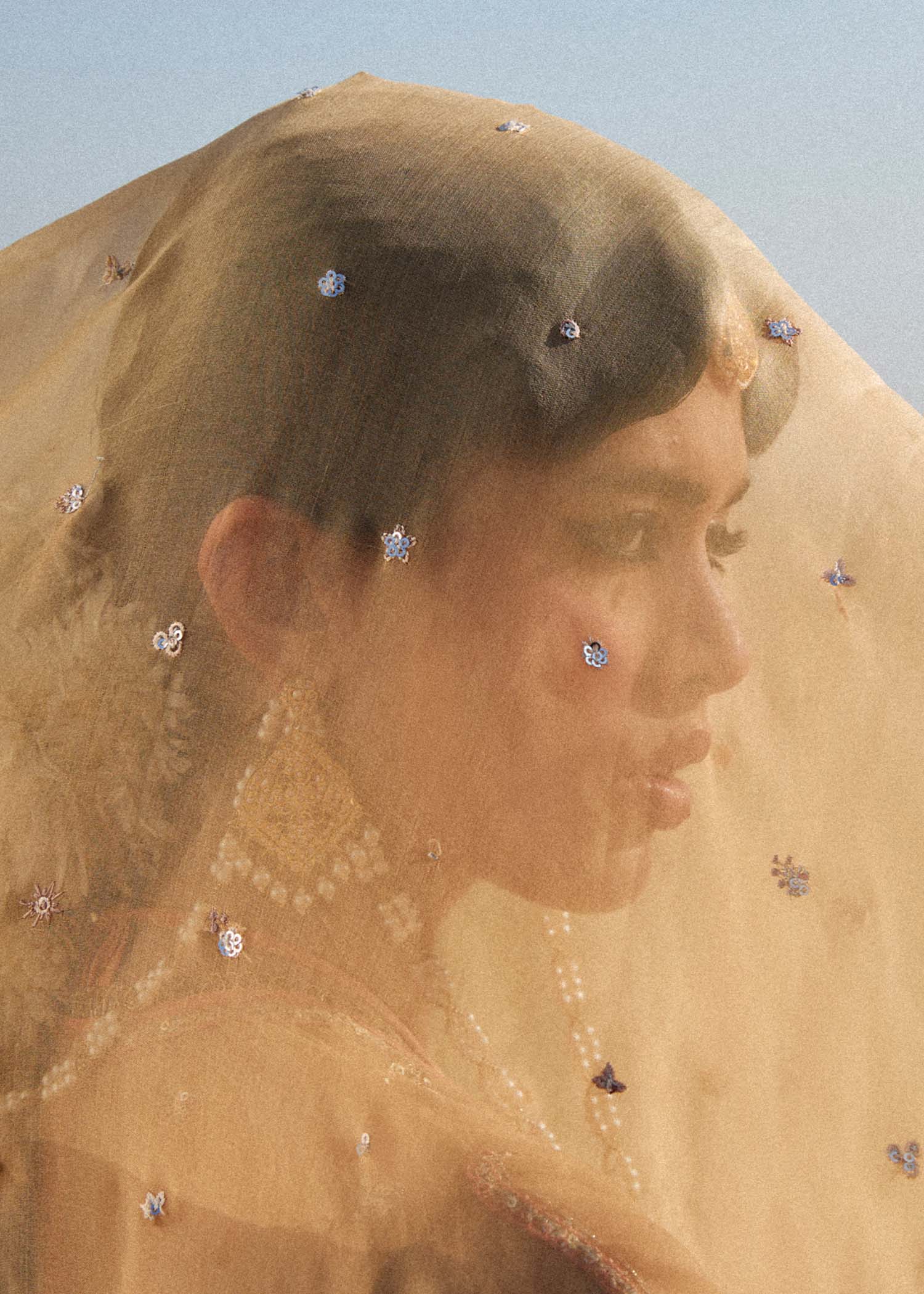 The organza jacket, composed of intricate sequin embroidery, is paired with a Korean raw-silk printed inner, creating a beautiful amalgamation of fabrics. The Korean raw-silk sharara, adorned with sequins embroidery, adds a touch of elegance. Heavy embroidered organza dupatta borders add a glamorous touch to the overall attire. This outfit is both elegant and beautiful, making you feel like a true fashion icon.
