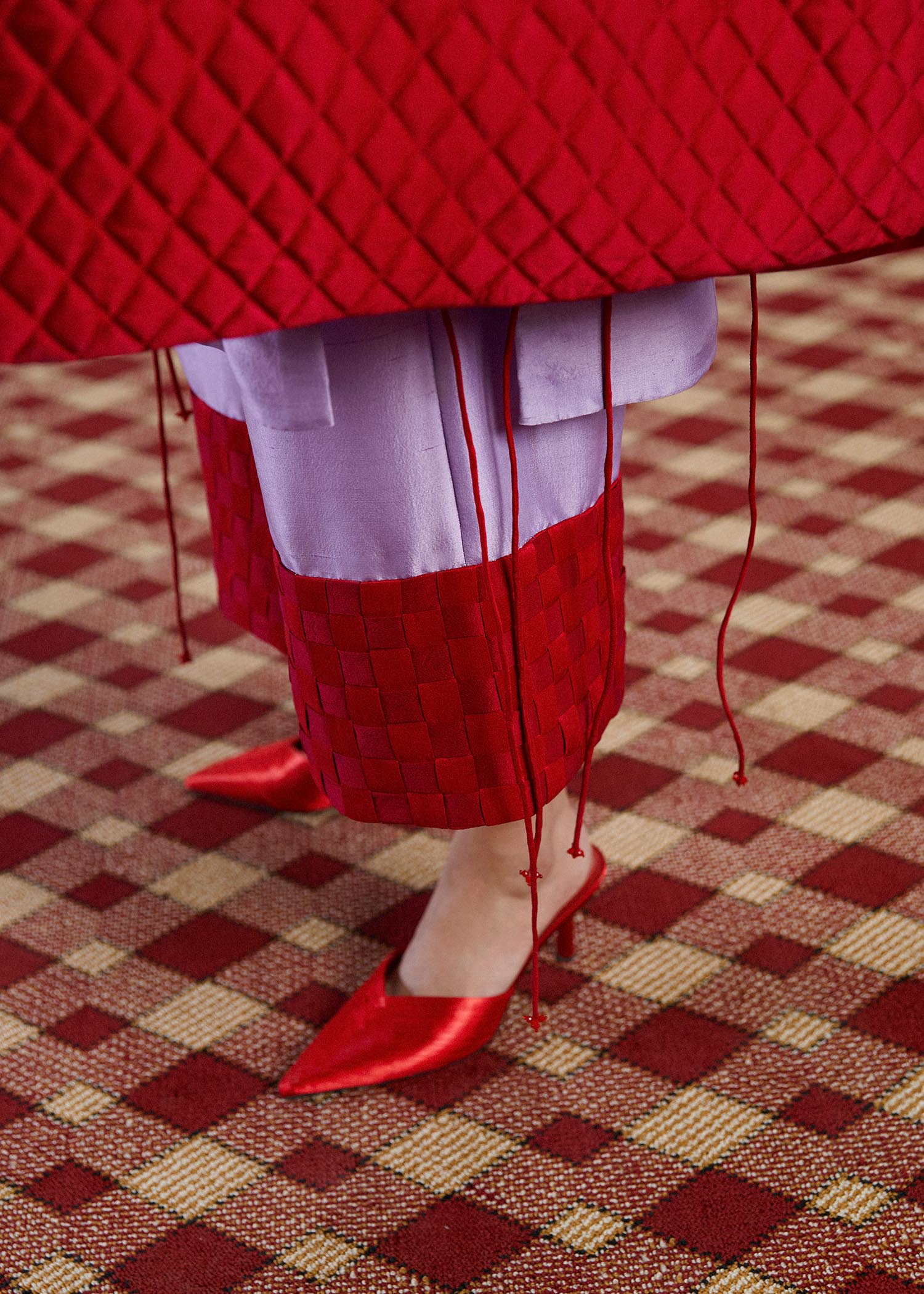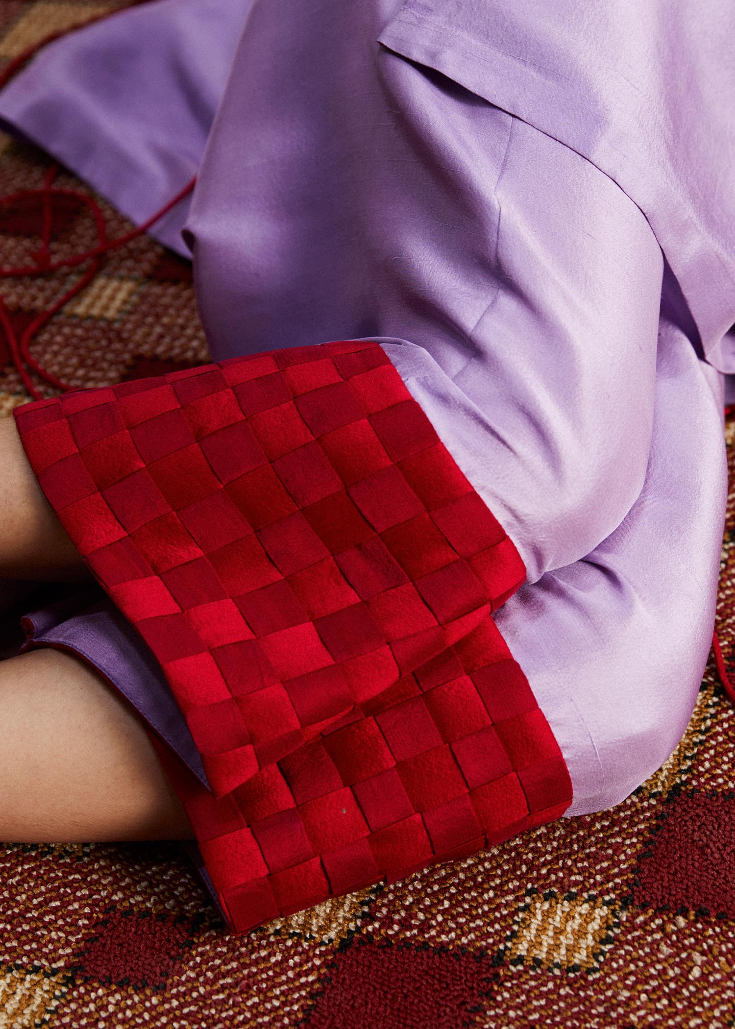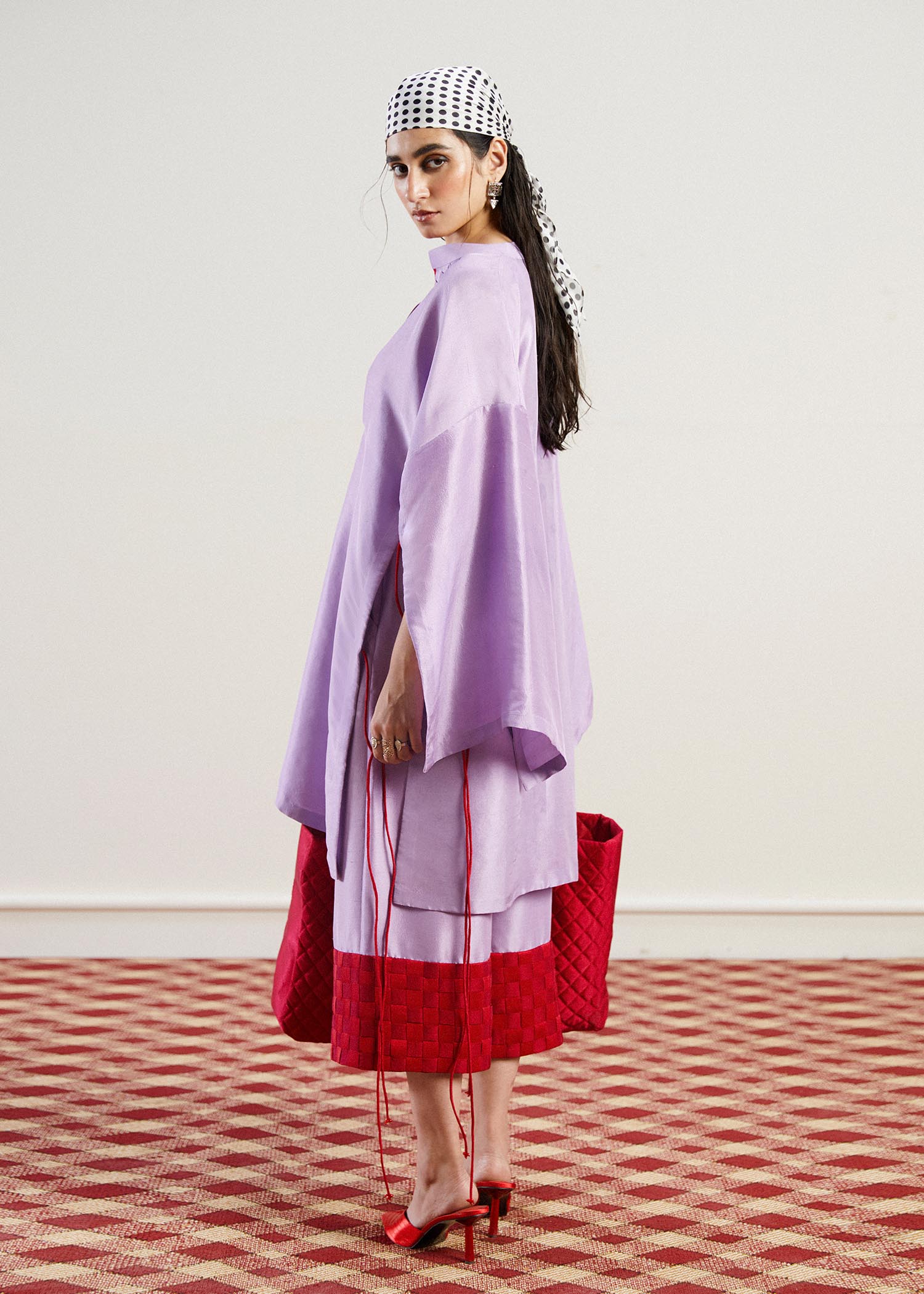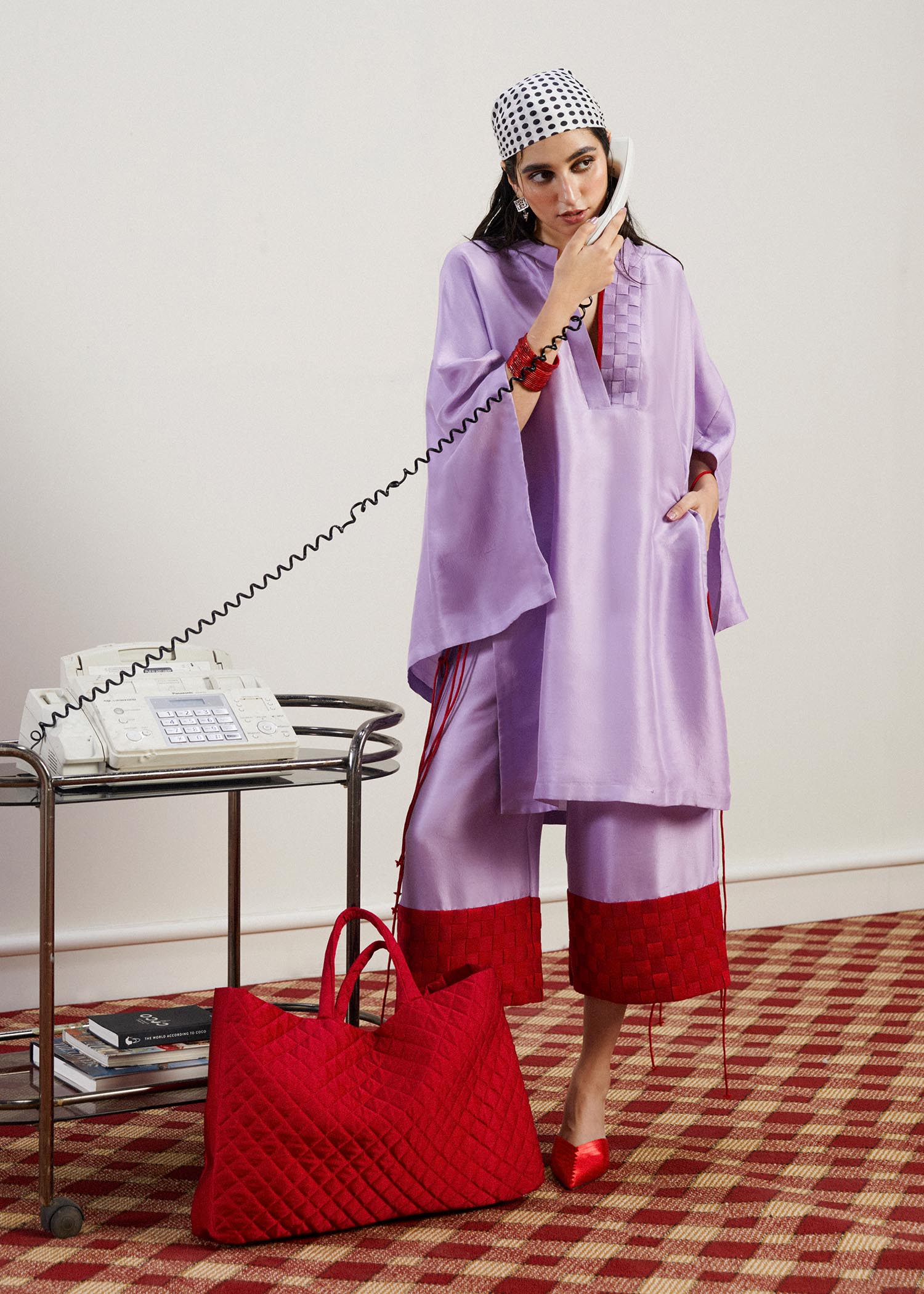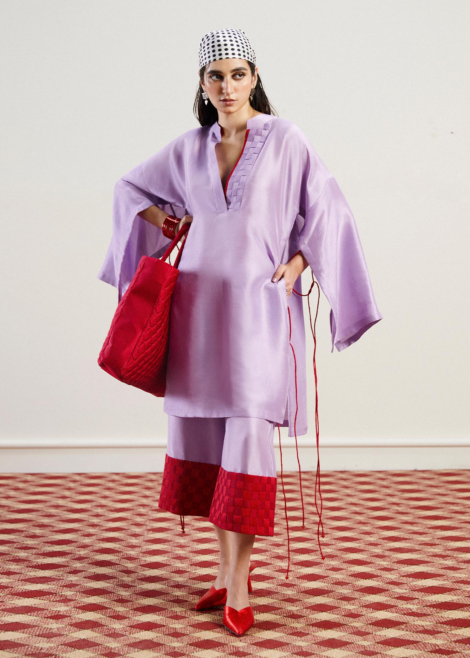 A lilac raw silk shirt with an elaborate cut on the sleeves, the neckline has an attractive weave pattern. It is paired with similar raw silk culottes that are also weaved at the hem in red, creating a profound contrast.