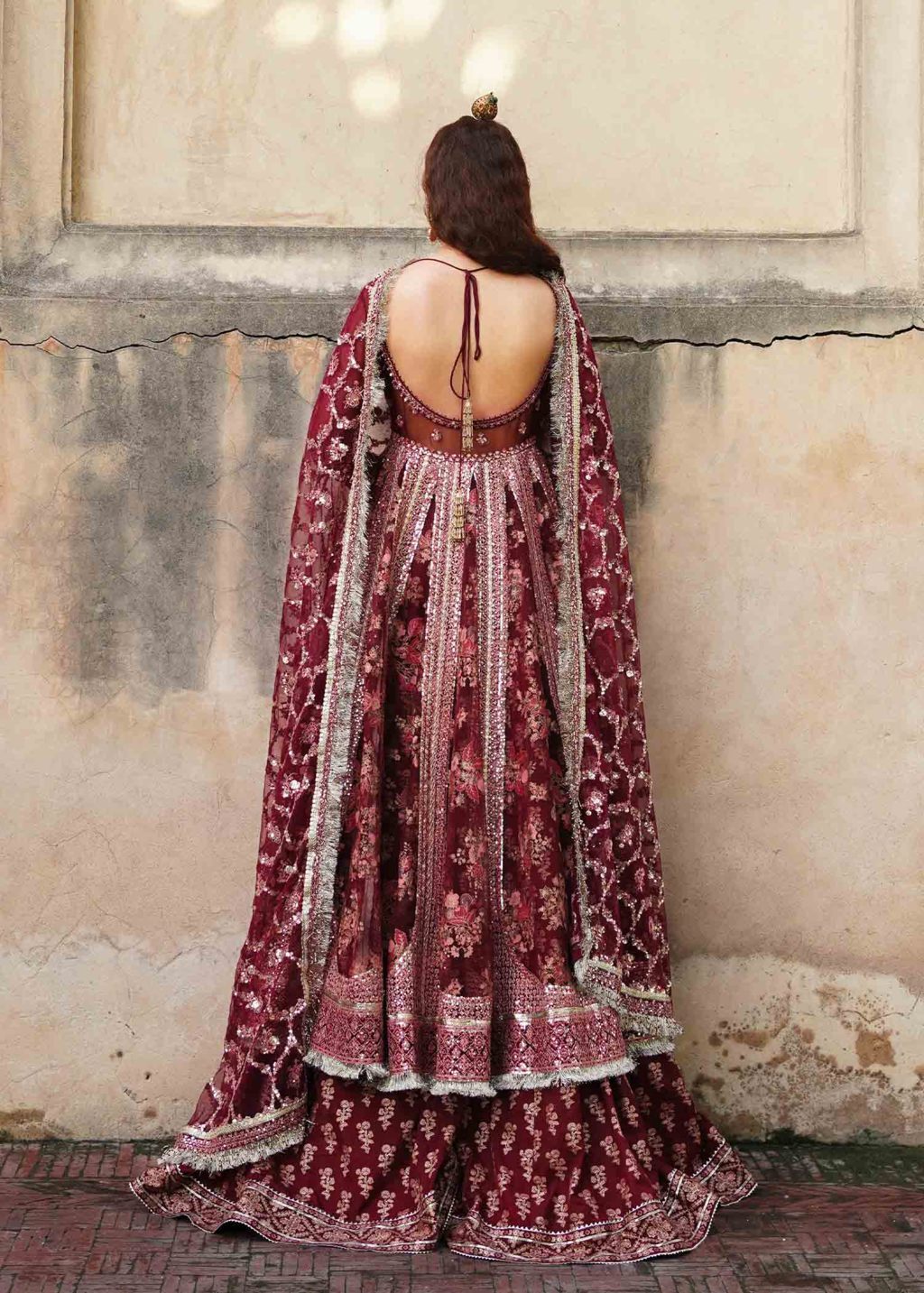 This deep berry burgundy ensemble is significantly opulent and magnificent with monotone color scheme. This stunner traditional peshwas and embroidery is further emphasised with additional glitz of sequins adding an extra bling to the festive season with its screen printed crushed sharara and scintillating sequined jaal dupatta.