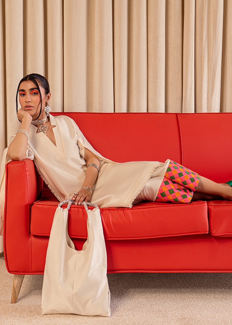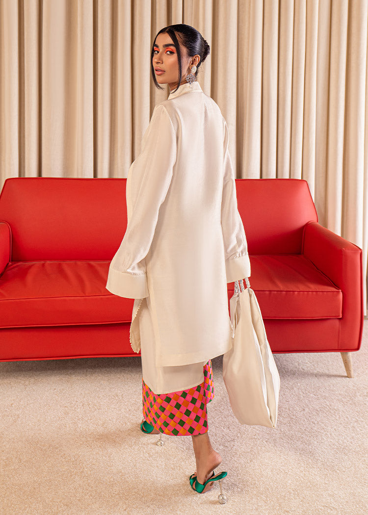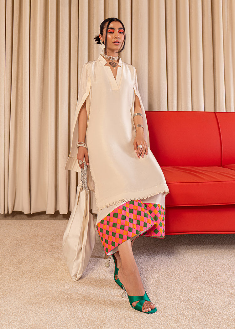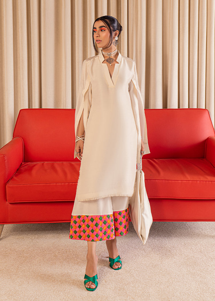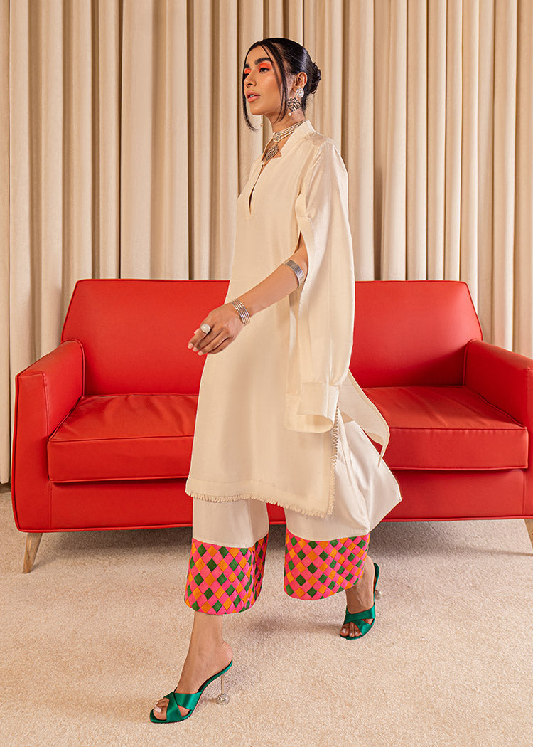 An elegant plain Ivory raw silk shirt with an artistic cut detail on the neck along with slits on the sleeves and cuff detailing. The ivory palazzo pants have weaving details on teh hem in orange green and hot pink giving it a vibrant pop.