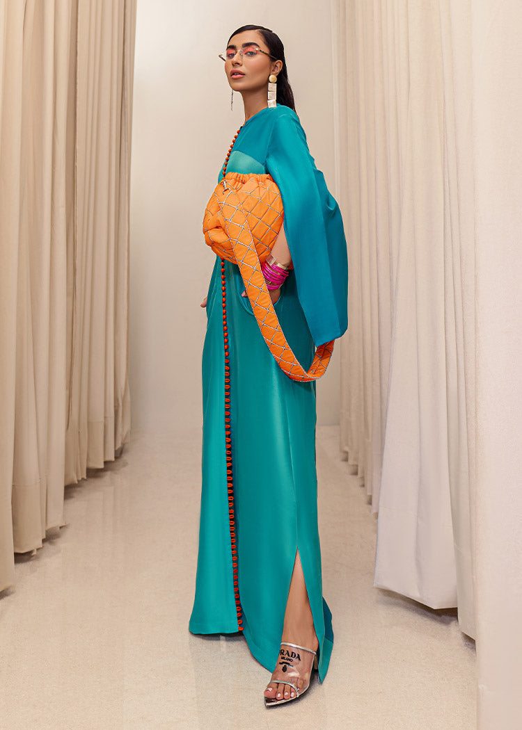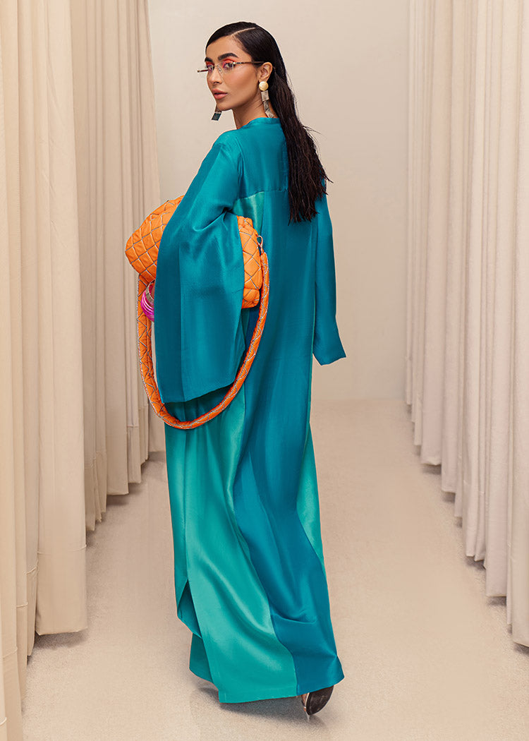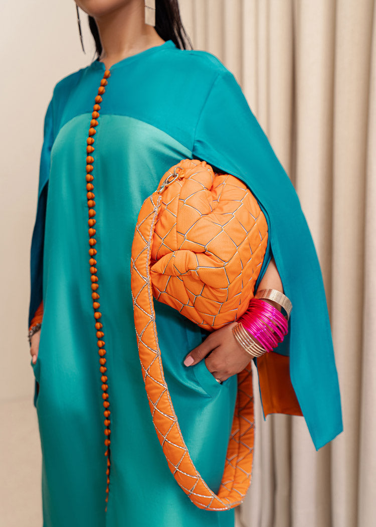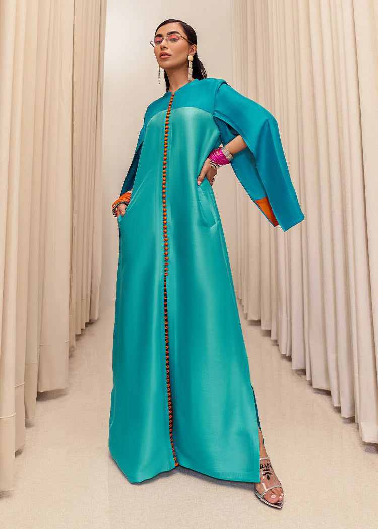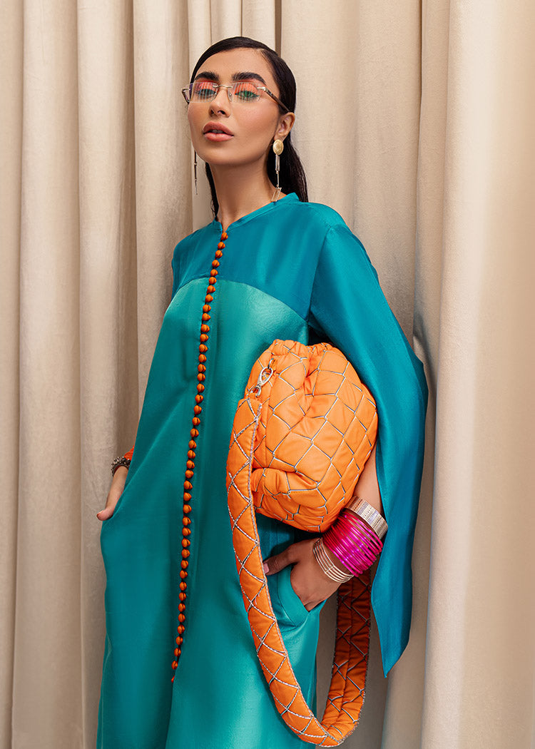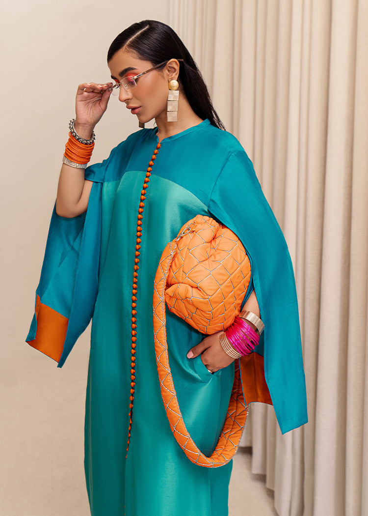 A stylish blend of teal blue and aqua blue raw silk floor length front open shirt with orange loop buttons descending from the neck to the hem of the shirt. The teal blue sleeves consist long slits with orange edges giving it a pop of color. Back of the shirt has a teal panel in the middle along with aqua blue panels on the sides.
