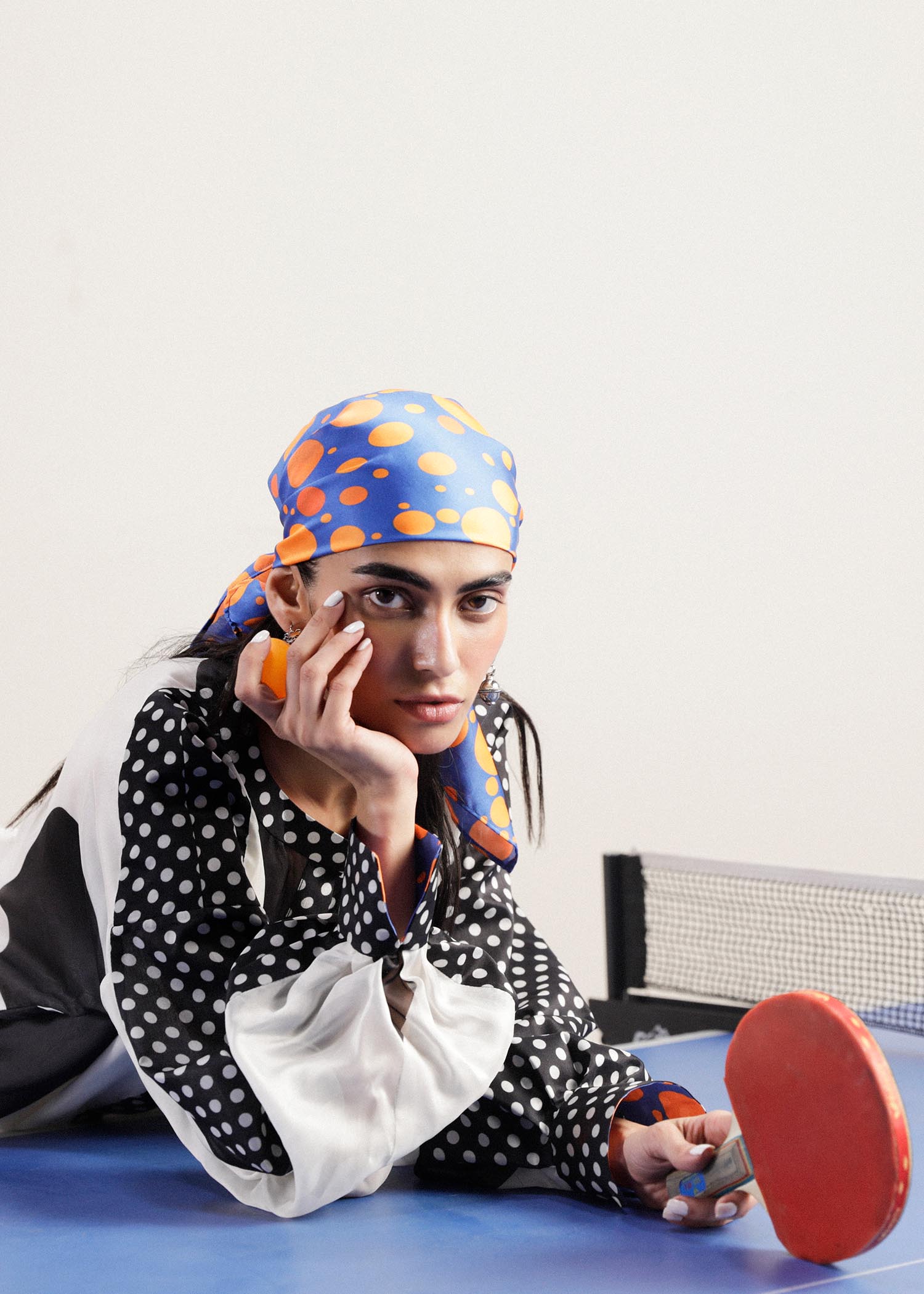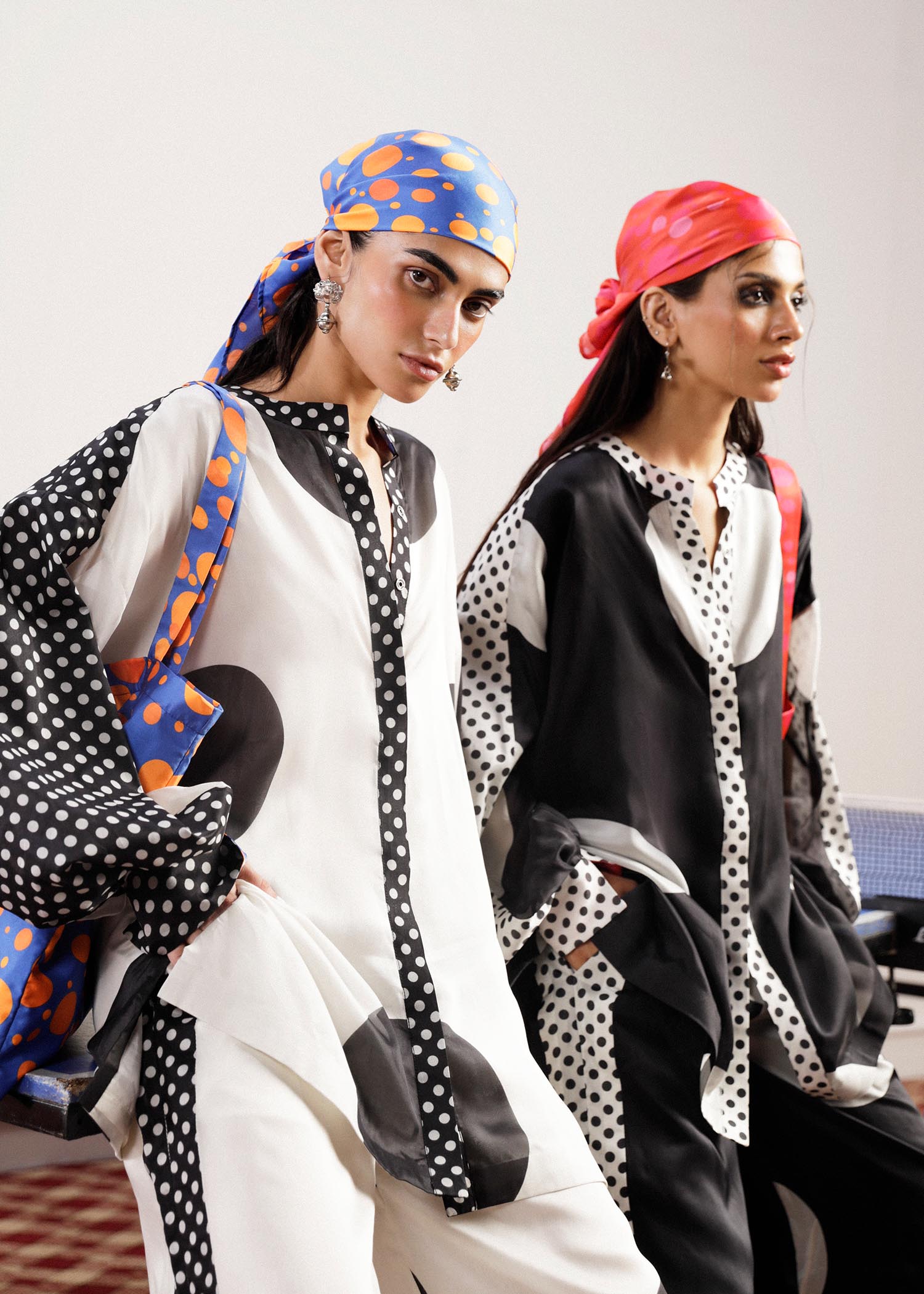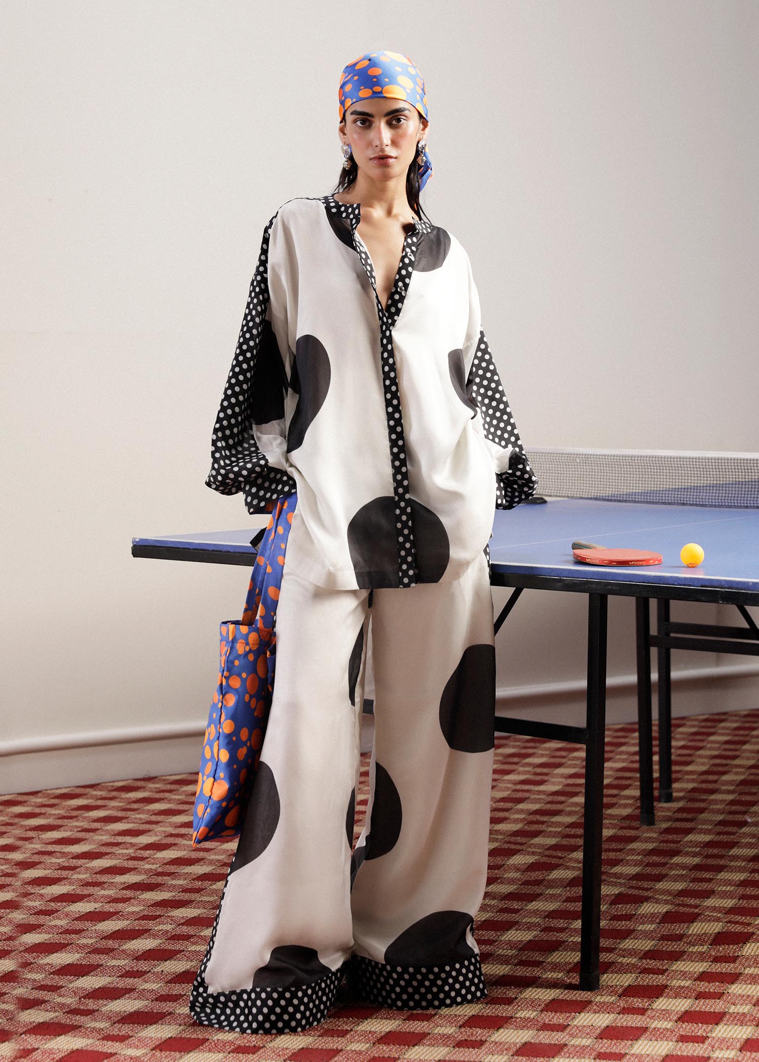 Our classic yang matching separates curated on fine silk with black polka dots on white silk base. The borders, sleeves detailing and neckline are made in silk with a smaller polka dot pattern. Easy and breezy ensembles to wear casually.
