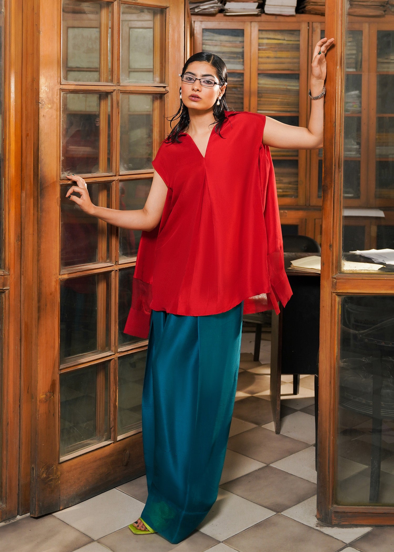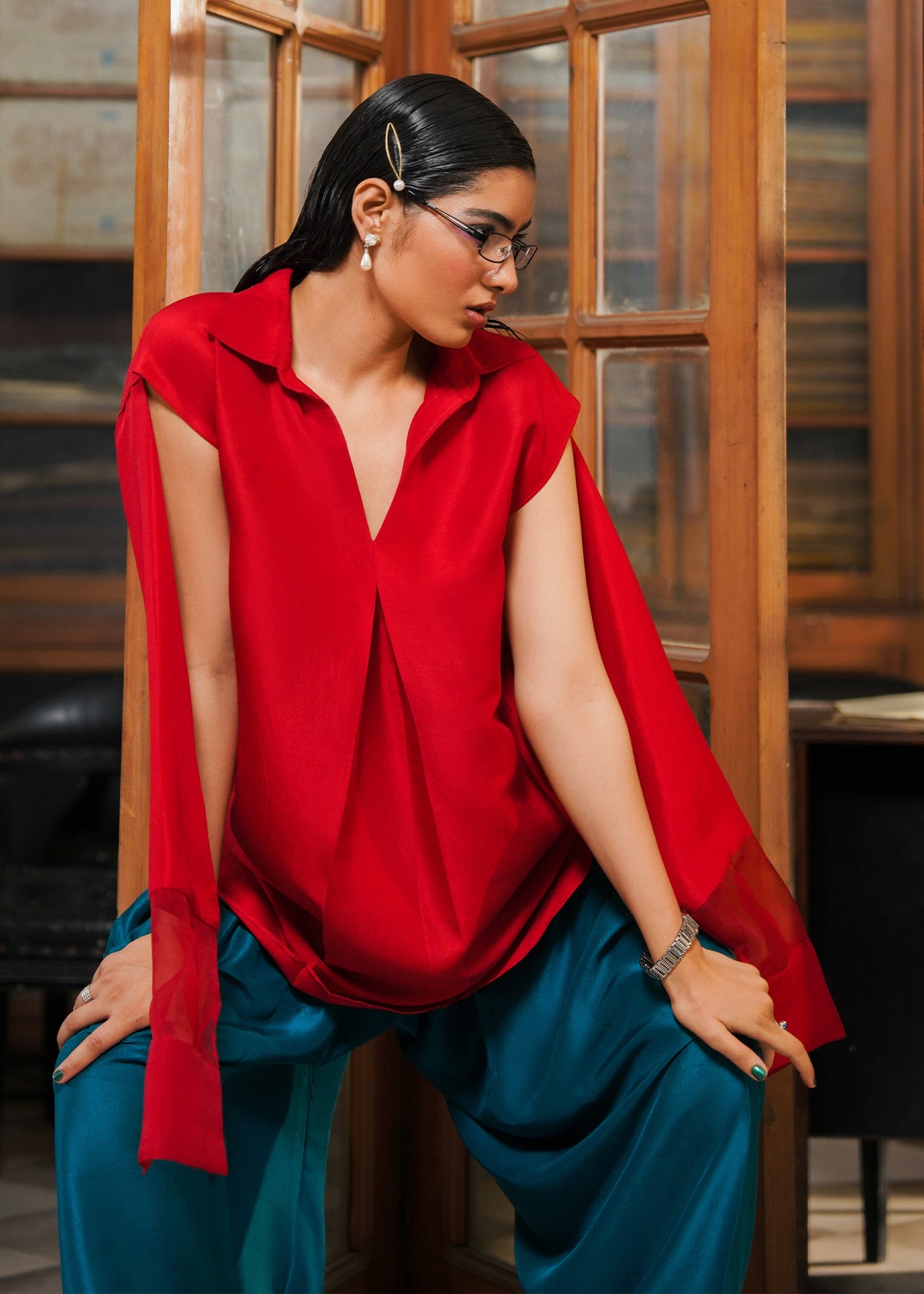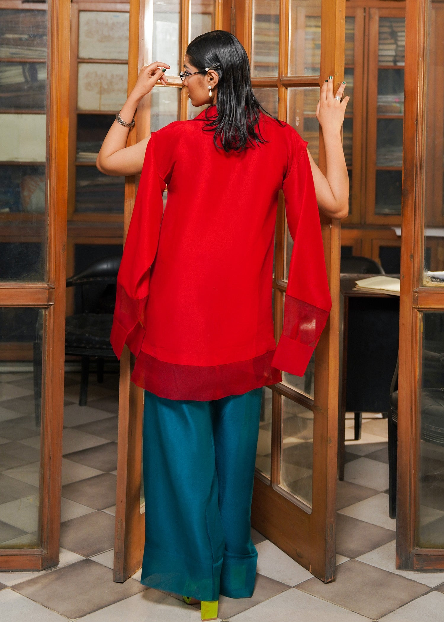A striking red solid raw silk shirt with collar with an artistic cut detail on the sleeve along with organza cuff detailing. The zinc shalwar have organza patch details on the hem giving it a vibrant pop.